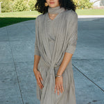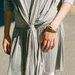 Gillian wears with the Joan Dress in Grey and Astro Earrings in Gold.