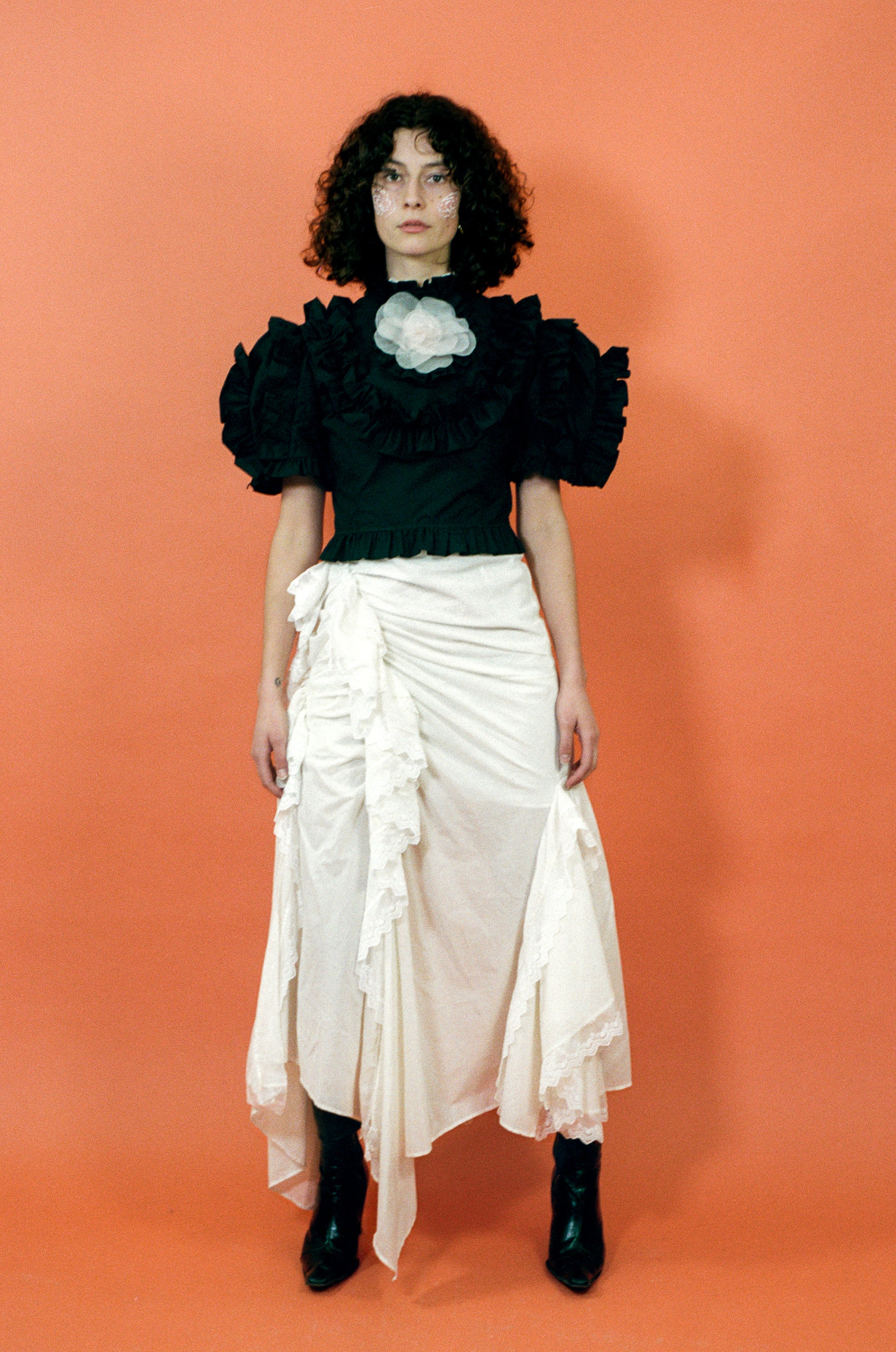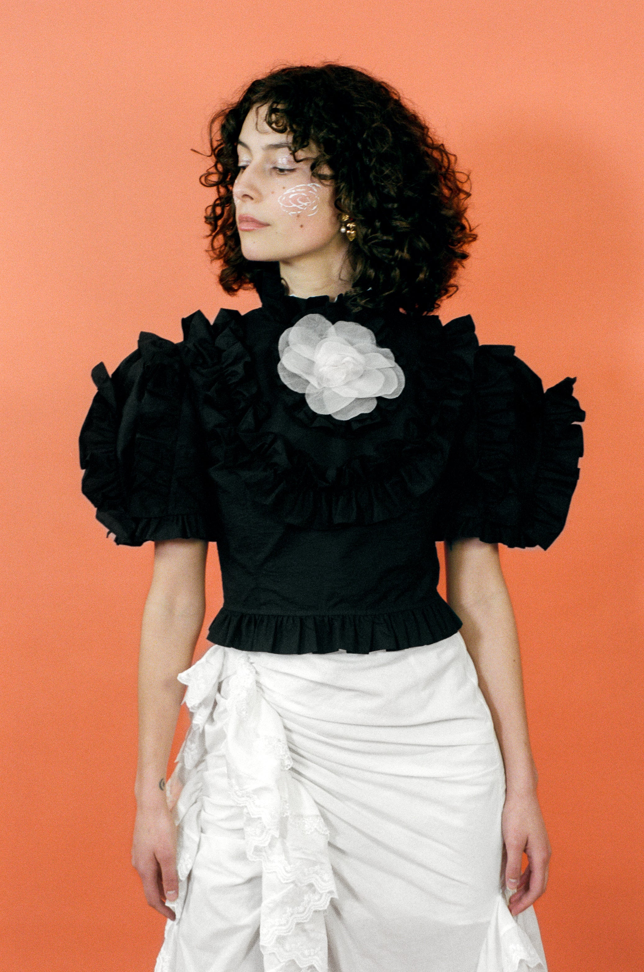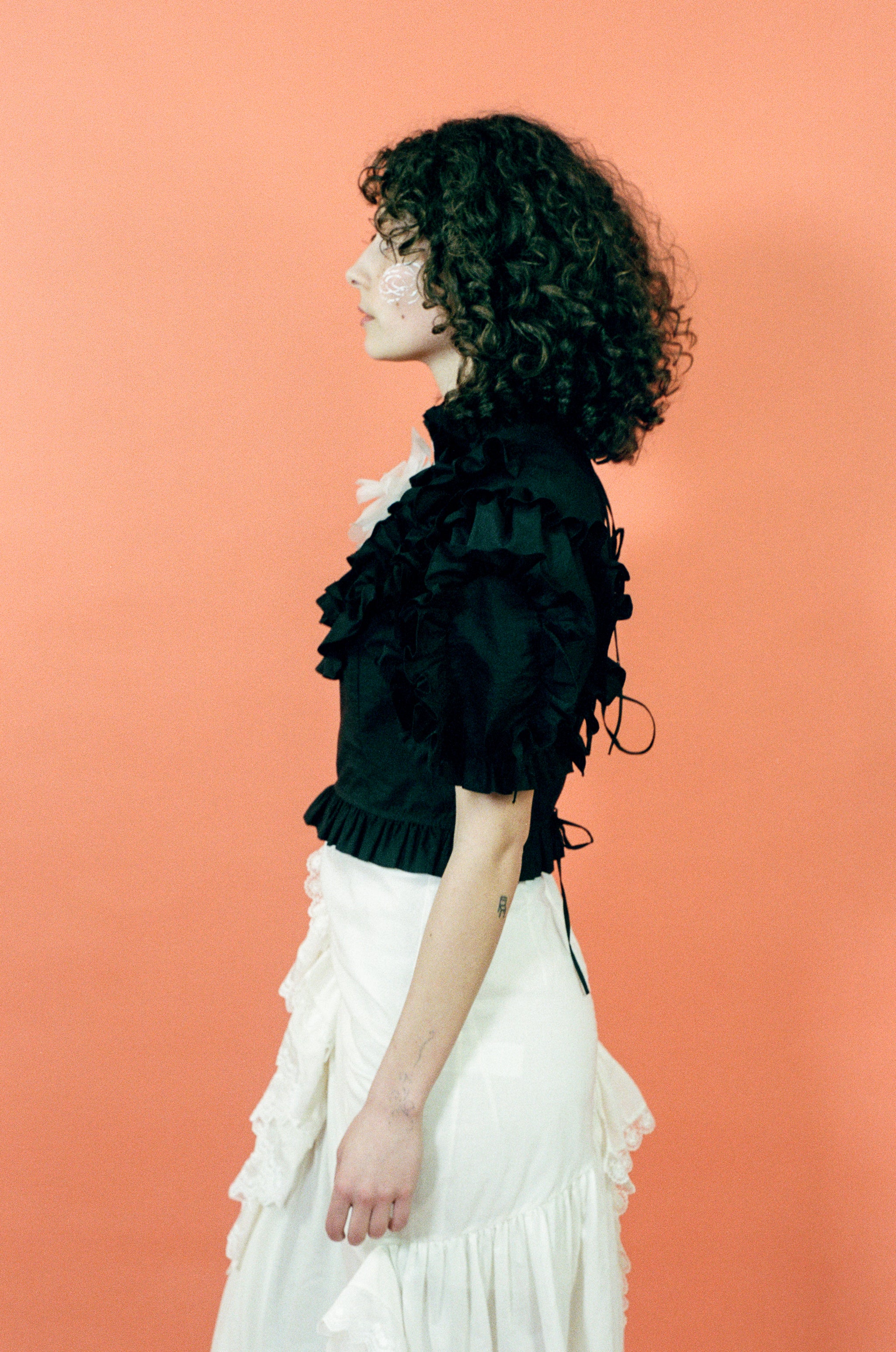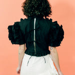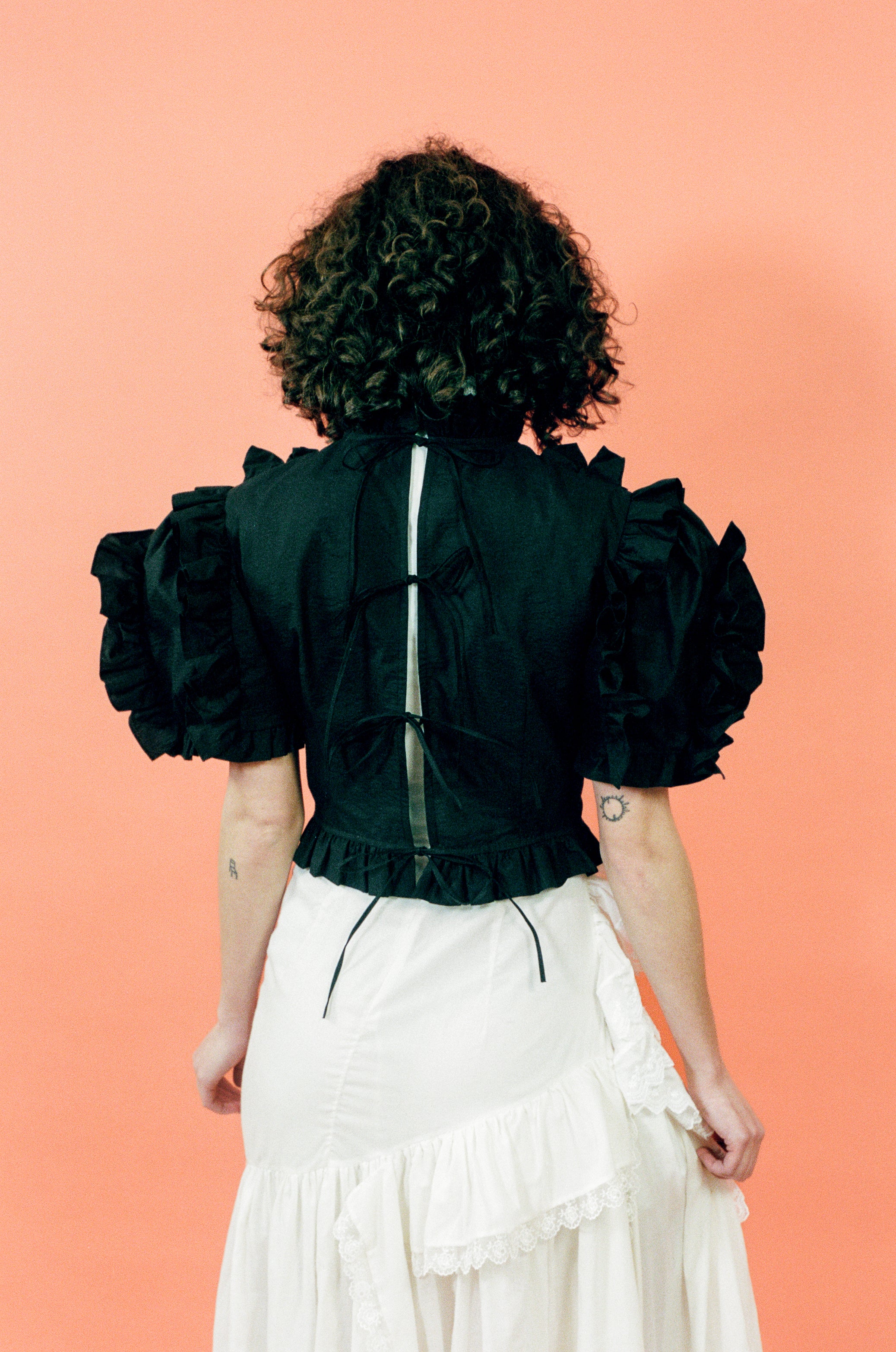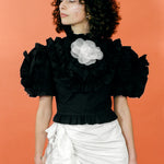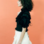 Ruffles upon ruffles adorn this short sleeved blouse, crafted from black organic cotton. A gathered ruffled collar inches slightly up the neck, while a four-tiered tie closure at the back exposes the perfect amount of skin. Added whimsy comes from a blush pink silk organza rosette, which is removable if you so choose.