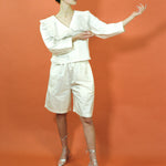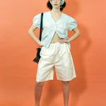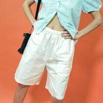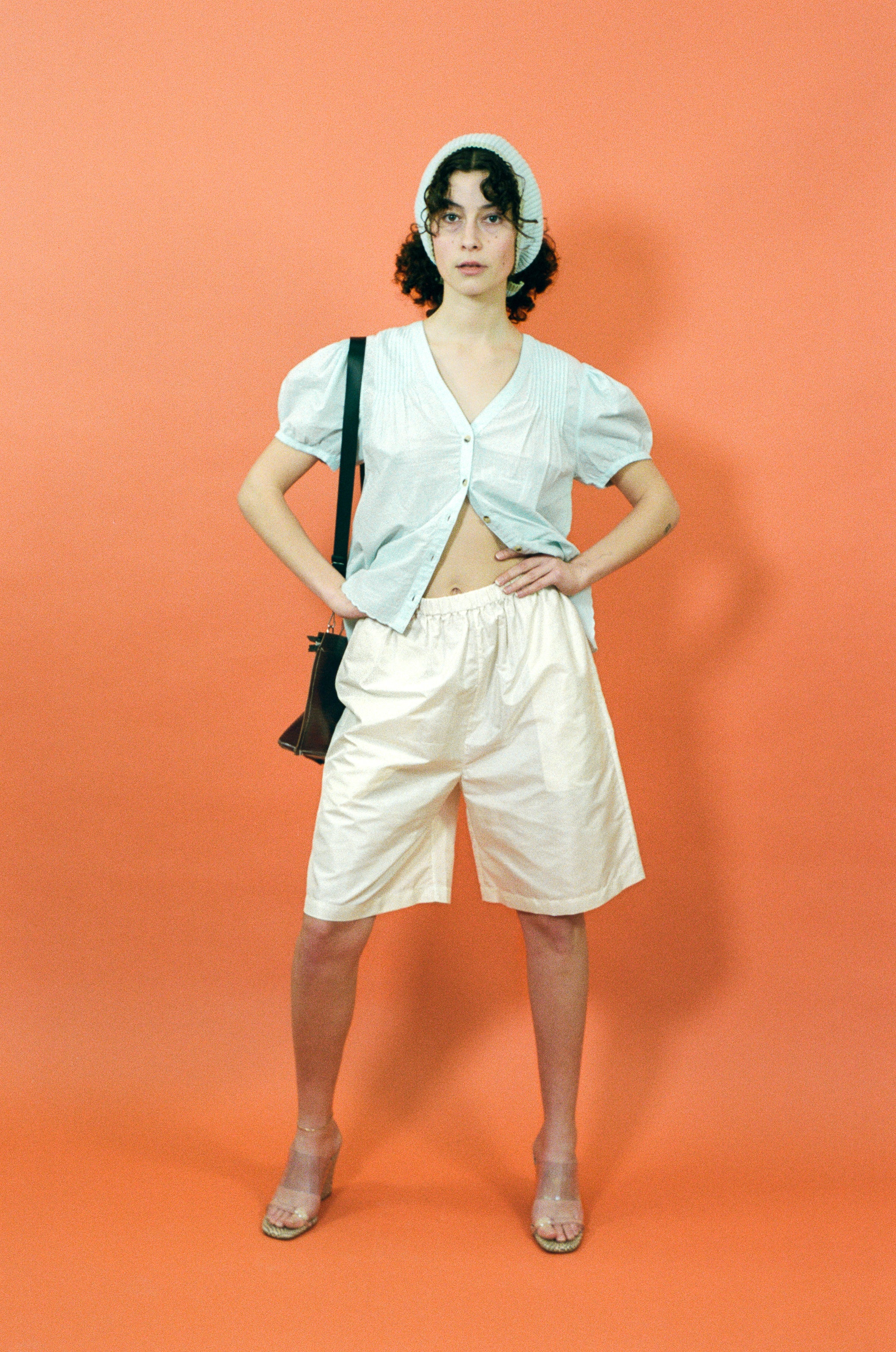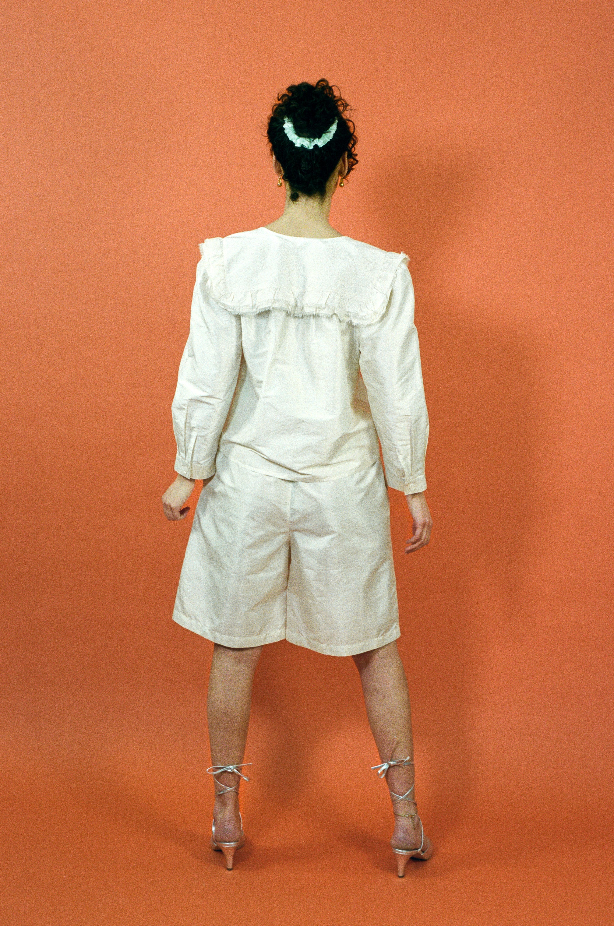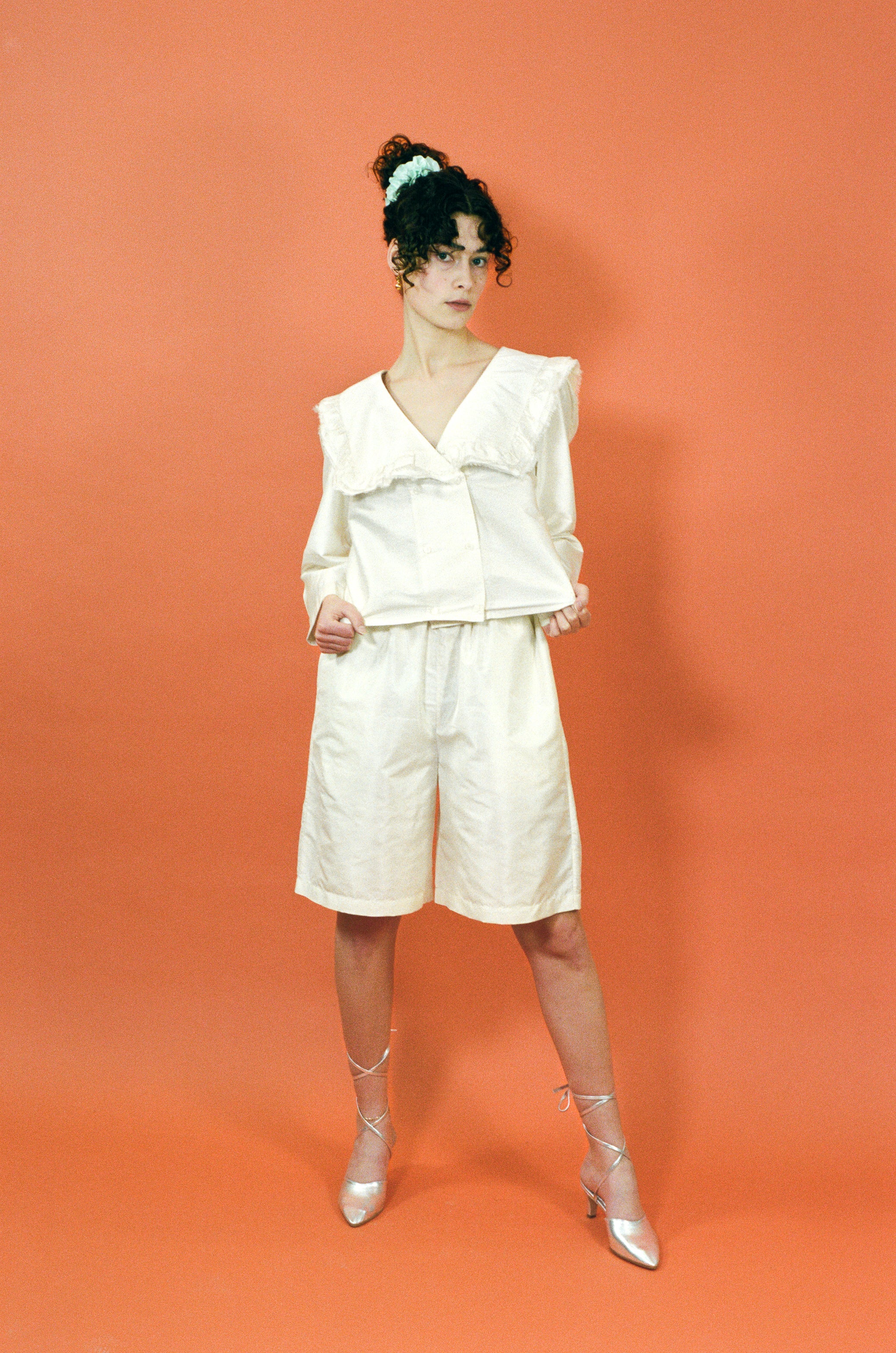 Long, wide, straight leg shorts in white, smooth silk taffeta. The perfect length to wear a high boot or have a statement sock moment, playing off the subtle sheen of the garments texture. The Elio Shorts have side seam pockets and an encased elasticated waistband, comfortably cinching your waist and flaring out into the hip.
