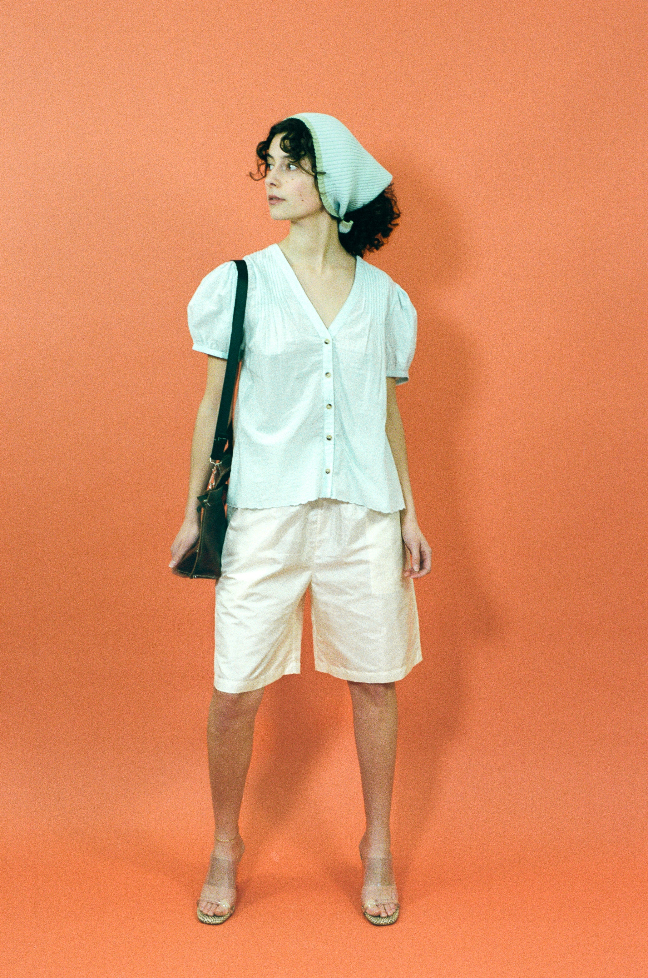 Kenzie is 5'9 and a size small/medium, and wears size small with the Vienna Blouse in White, Carnation Scrunchie in Ice Mint, Gioca Earrings in Gold, Izaro Top in Baby Blue, Nonna Bandana in Glacé, Olympia Wedge in Cobra, and Mini Shopper in Brown Croc Leather.