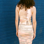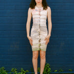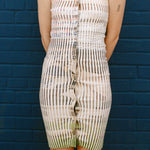 Sleeveless dress with pearl snap button closure down the center of the garment. Fitted with a scallop placket. Features a deep rib that comfortably conforms to your body. This piece will mold over your form and stretch to fit exactly your shape while smoothing over lines.