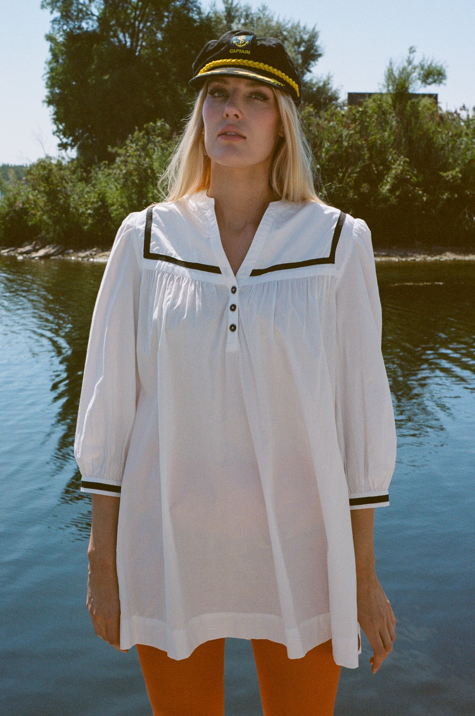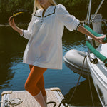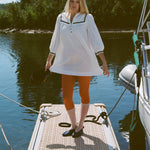 Cotton poplin mini dress in white featuring three quarter length sleeves and three button closures down the front centre of the chest. Side slit pockets. Fitted at the shoulders and end of sleeve cuffs, billowing into a babydoll shape. The black grosgrain details on the sleeves, front, and back yoke make it the perfect transitional piece as you can pair any shoe from sandals to boots when Fall air finally hits.