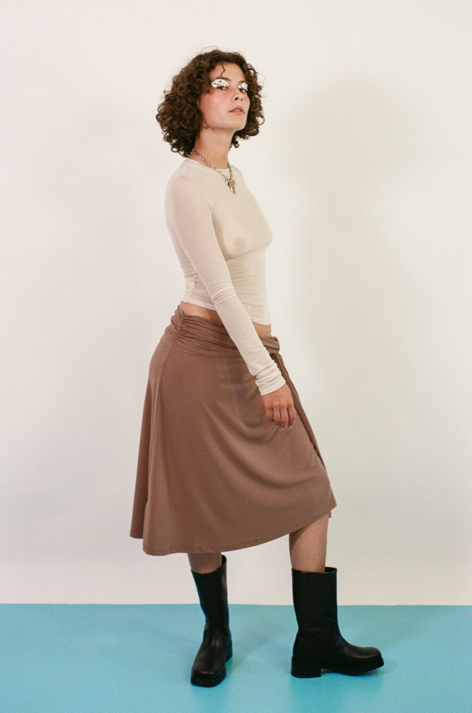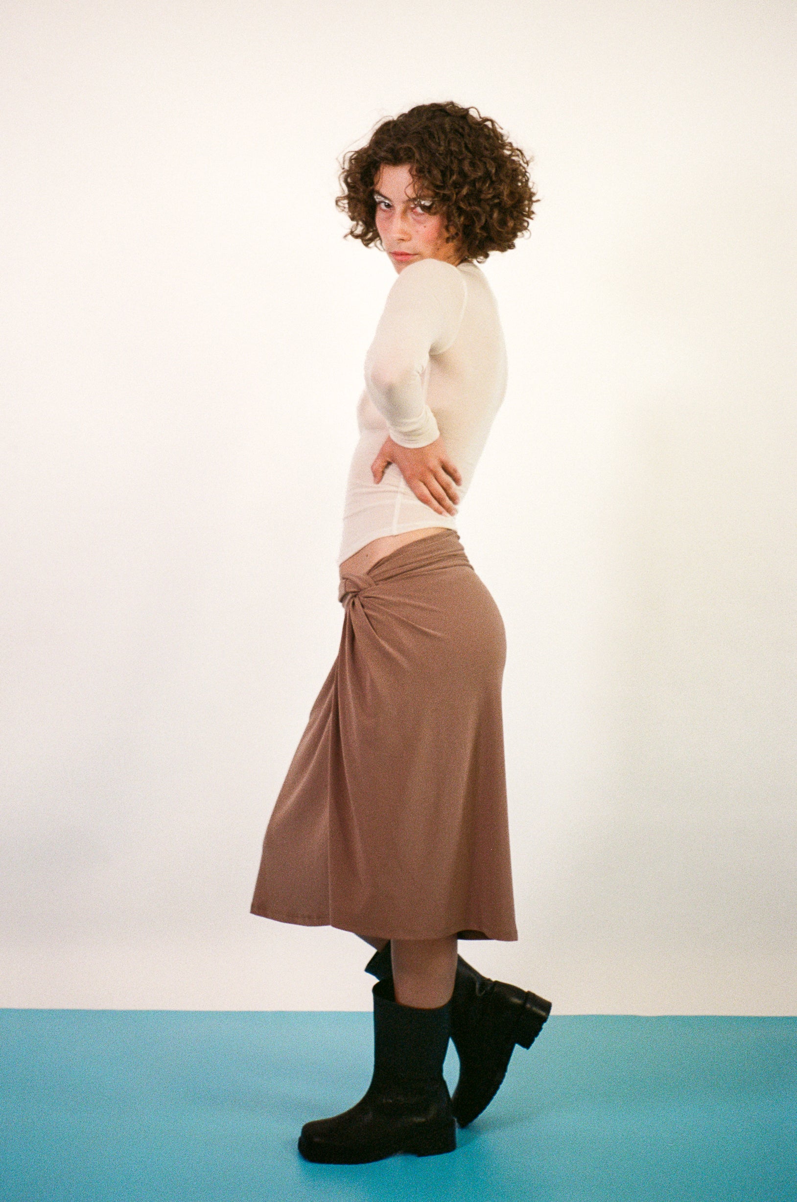 Slip on style stretch jersey skirt hitting just above the knee in length. The Ida Skirt has a classic Paris Georgia signature one sided twist detail at the hip, designed to slouch off the waist with plenty of stretch, and an effortless drape toward the bottom hem to follow. Featured in mocha brown.