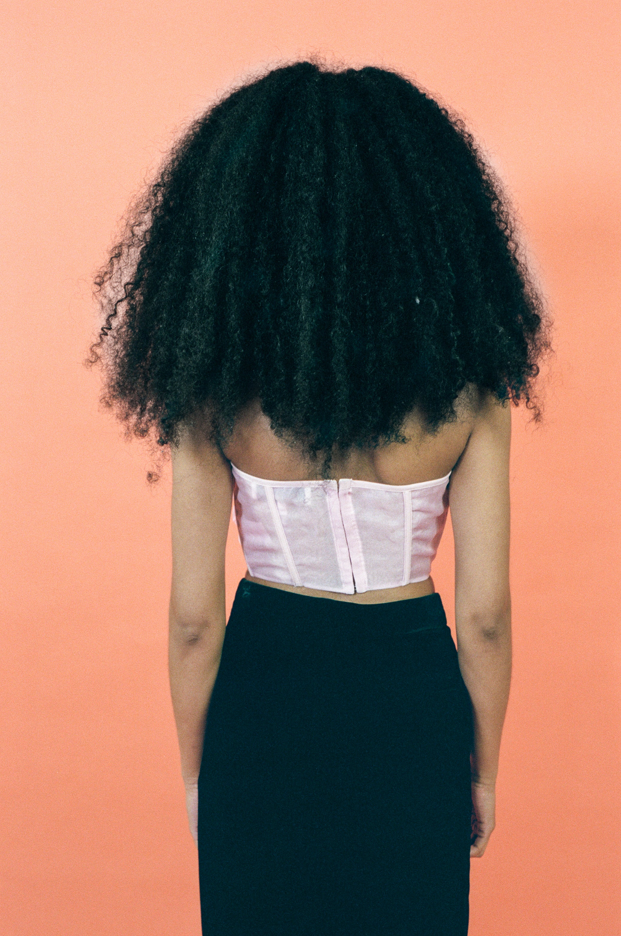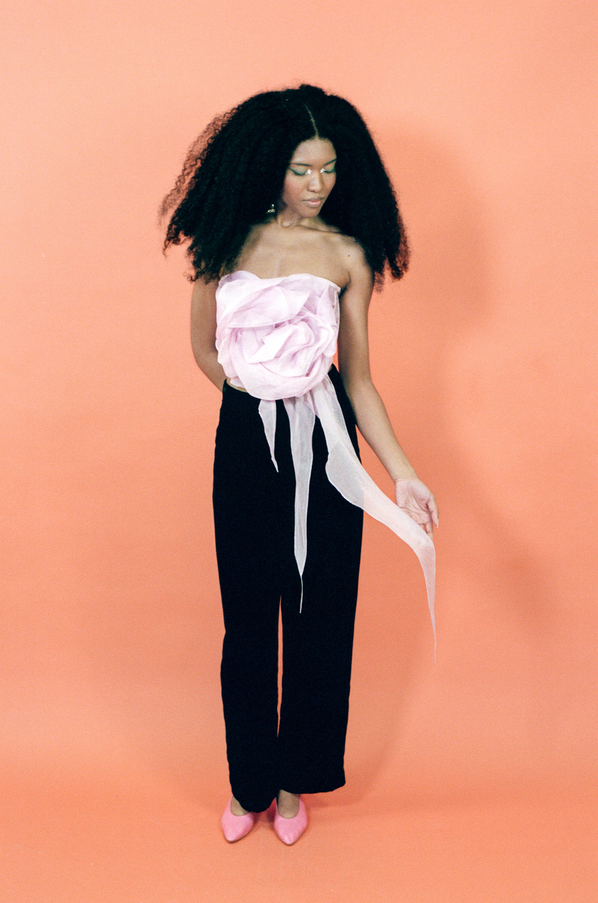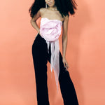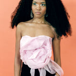 The Joanna corset top is cut from hand-dyed silk organza in a gentle candy-floss pink. Built on a structured corset base, it shapes the waist while maintaining an ethereal softness. A large, hand-formed silk flower drapes across the front, adding a sculptural detail that defines the silhouette.