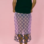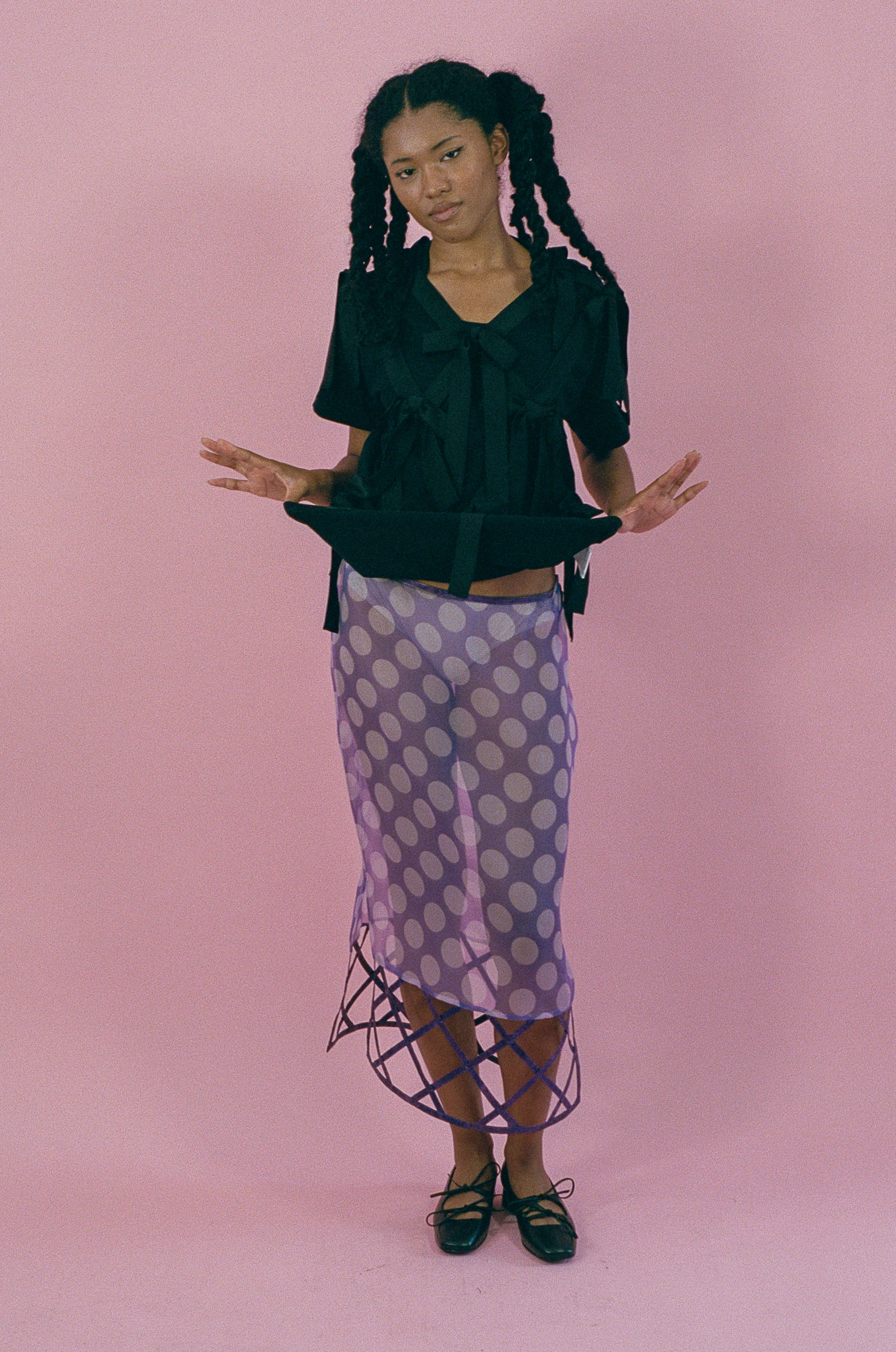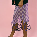 Low waisted transparent midi skirt in purple with large white polka dots throughout, smoothly hanging off your hips into a straight cut shape with side slits for movement. Lightweight and silky. Side zip and hook closure. Features an incredible lattice caged bottom in waxy mauve purple, beautifully in contrast to the cooler tone purple of the silk tier.