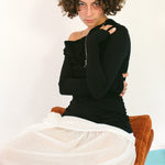 Made in New Zealand from a soft and stretchy merino wool jersey, the Manahou Top is a fitted long sleeve with signature Paris Georgia one shoulder twist, designed to sit slouched off one shoulder, with a capped sleeve on the other side. Fits true to size, designed to be worn bodycon. Featured in black. Lightweight and breathable, exactly what you would want to adorn your skin in summer to fall transitionary weather.