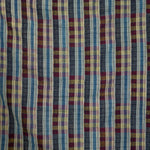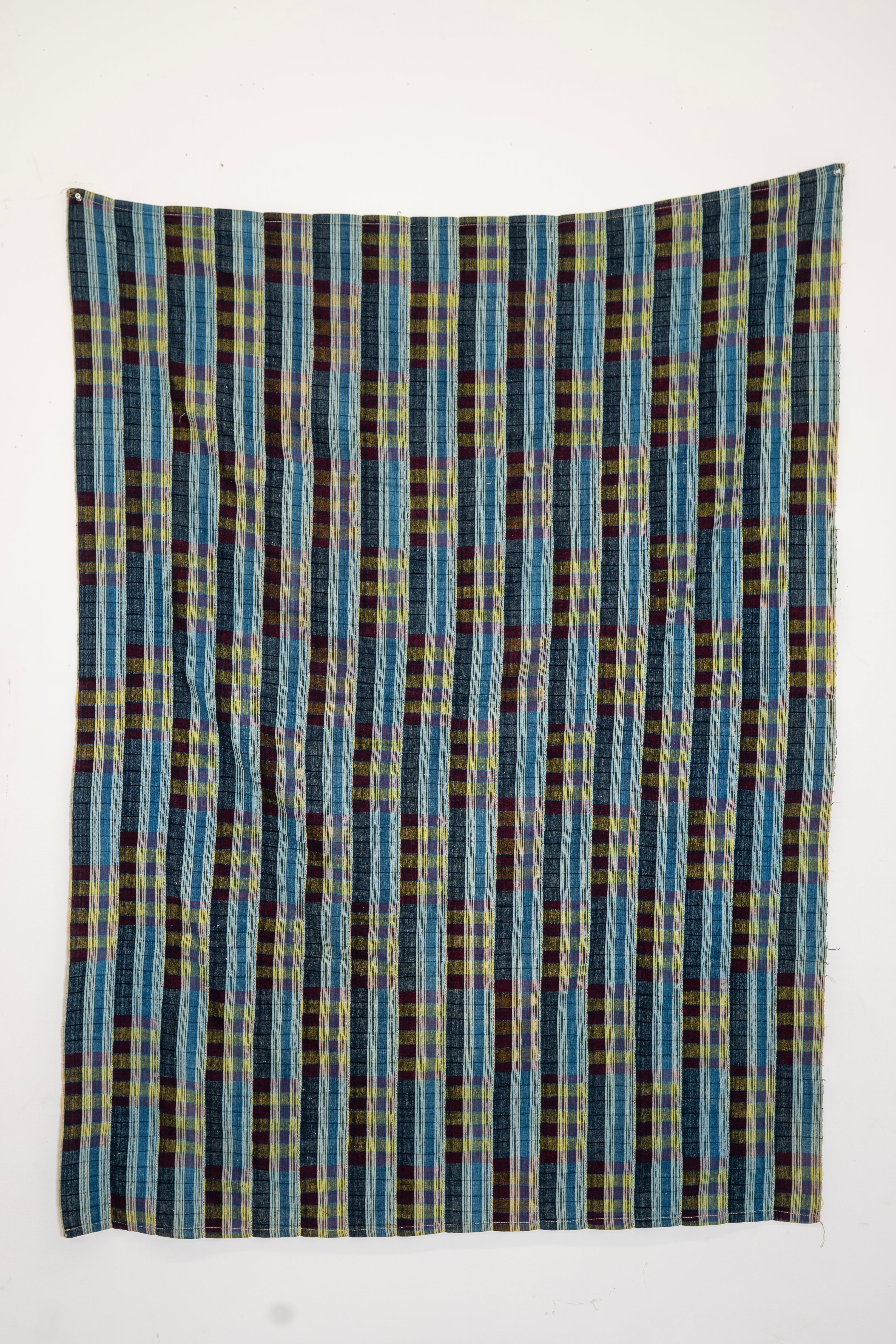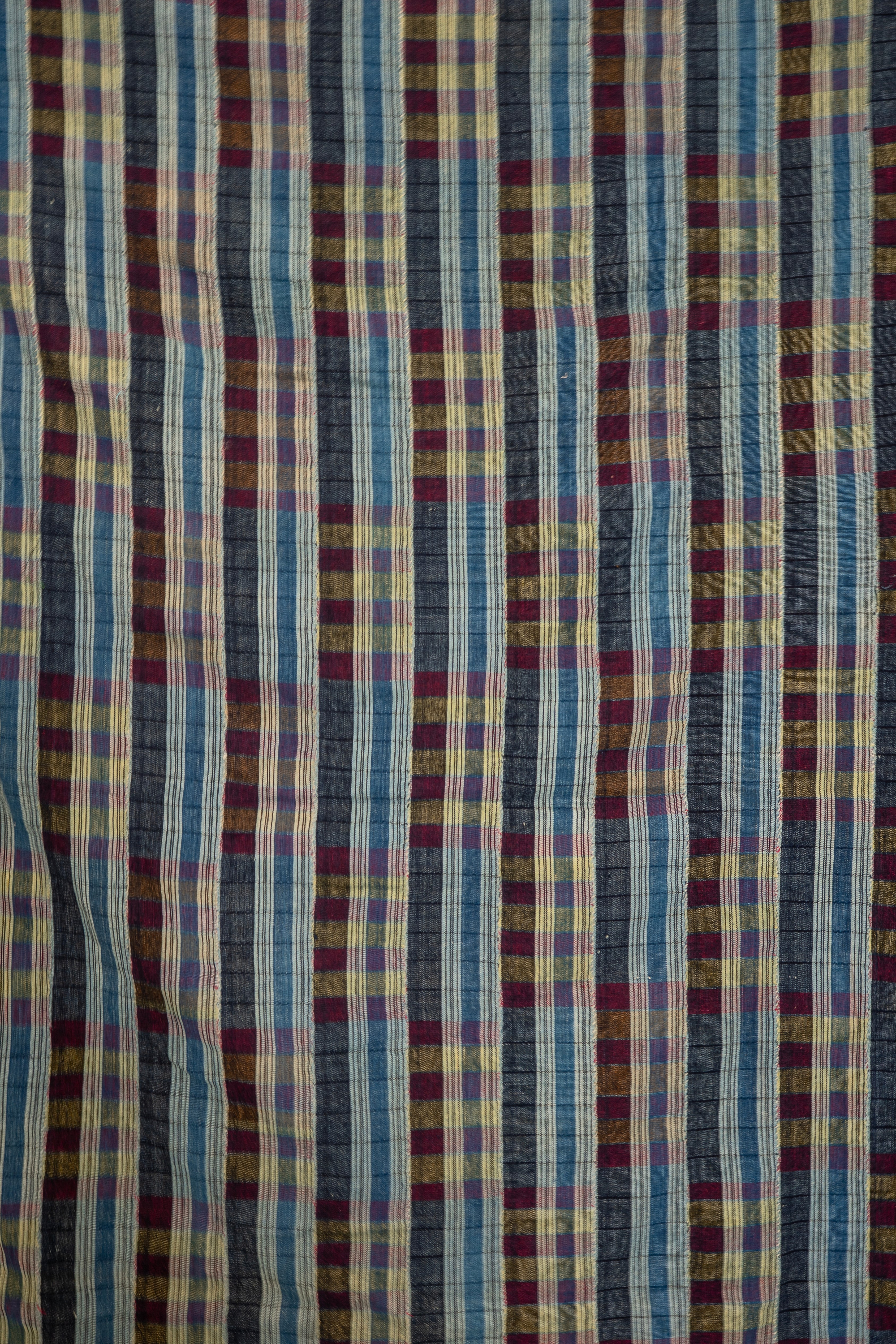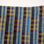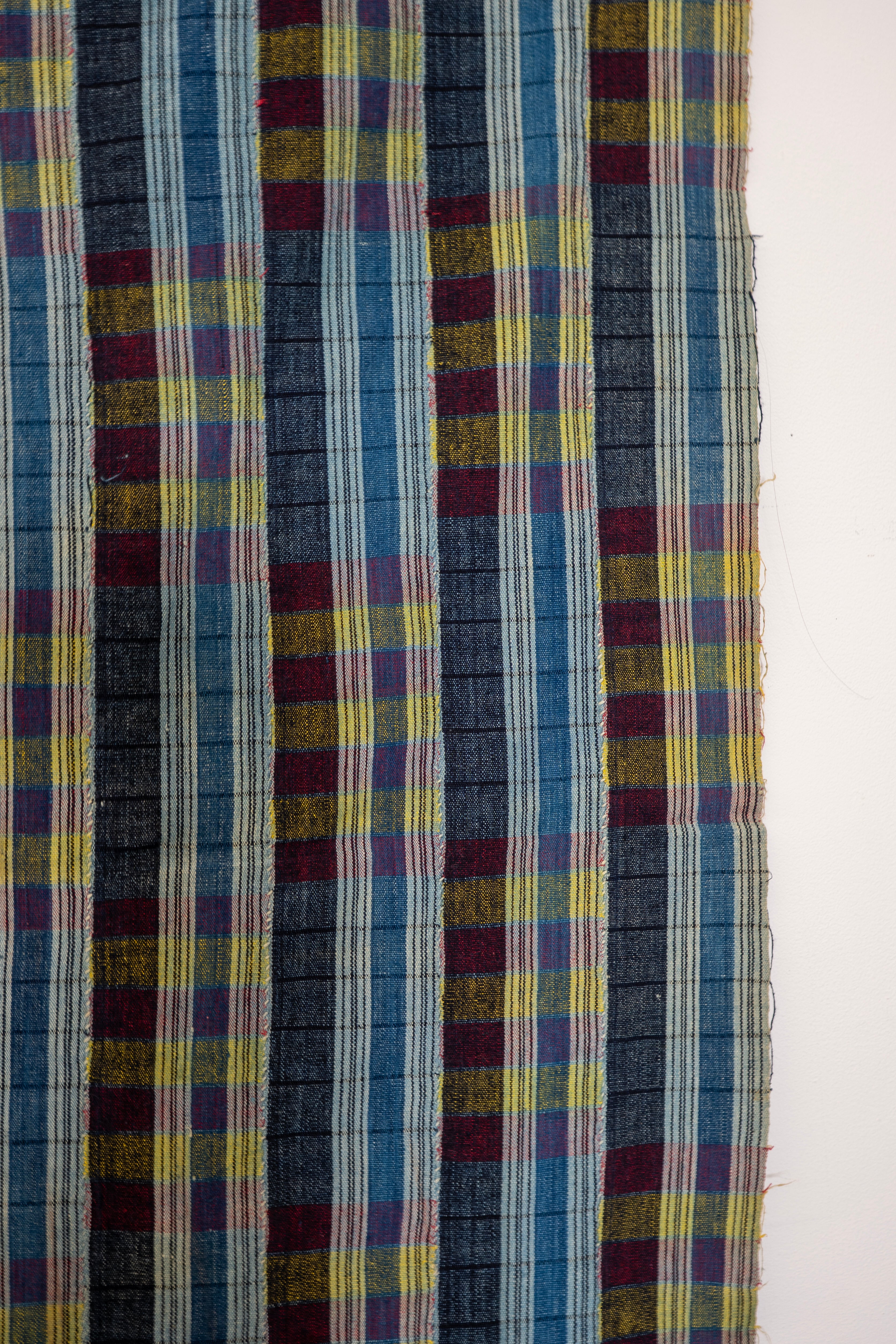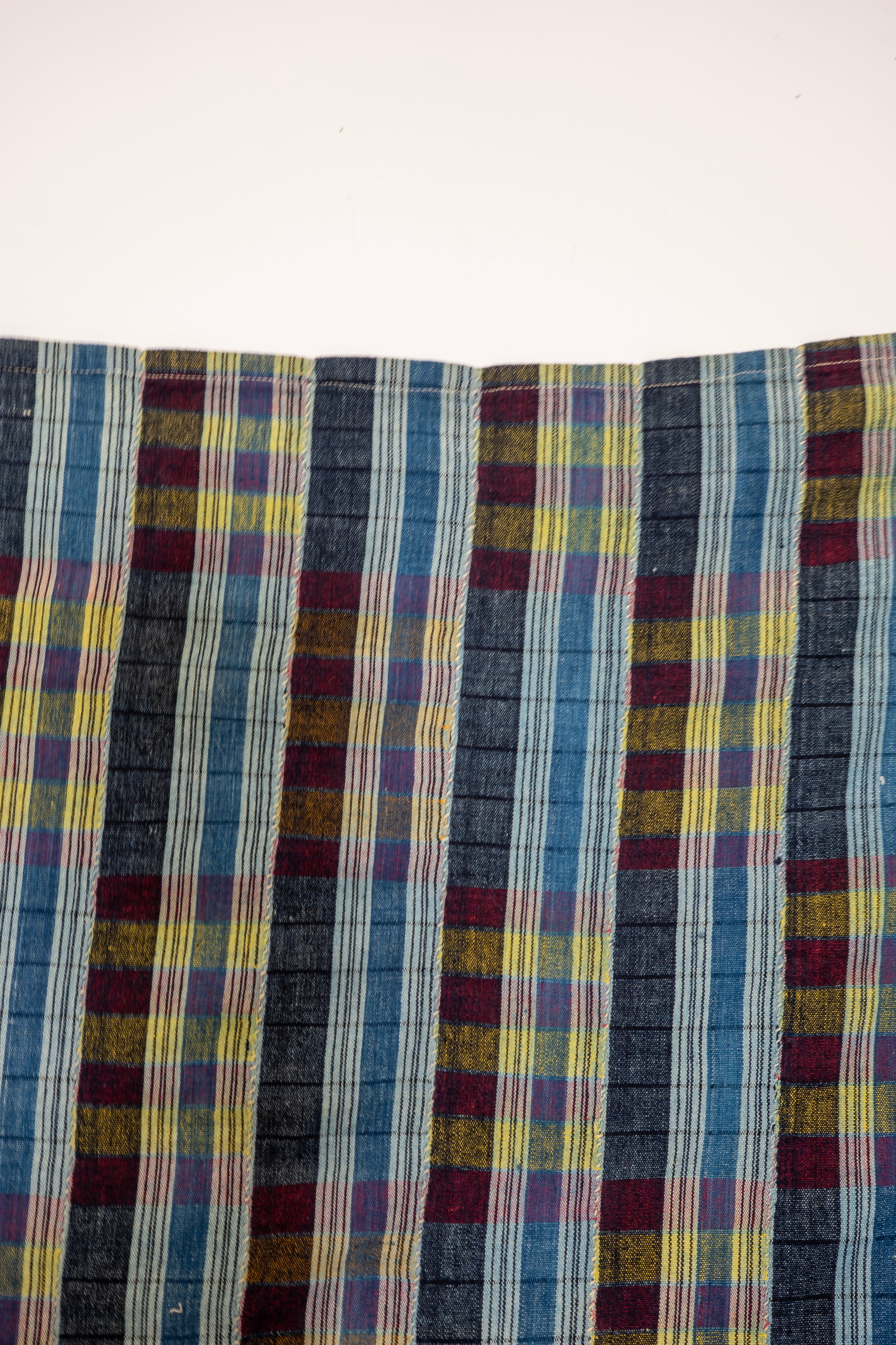 Blue, burgundy, yellow, and white plaid cloth handwoven in narrow strips from soft textured cotton thread, stitched together by hand.