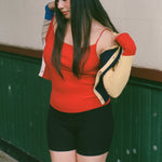 Jenny is 5'2 and a size medium, and wears size medium with the Nonna Camisole in Pomodoro and Jelly Earrings in Ice Blue/Emerald.