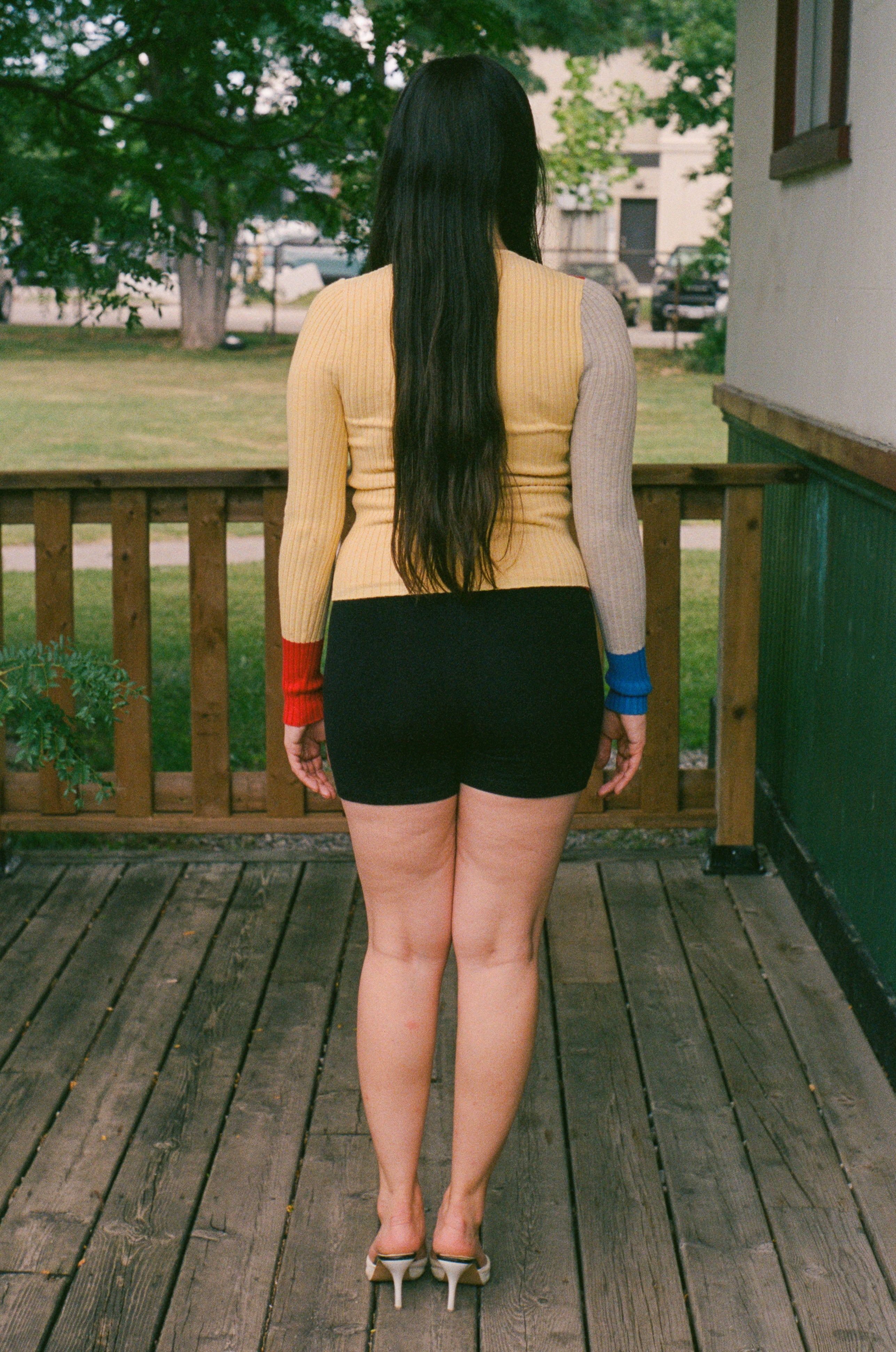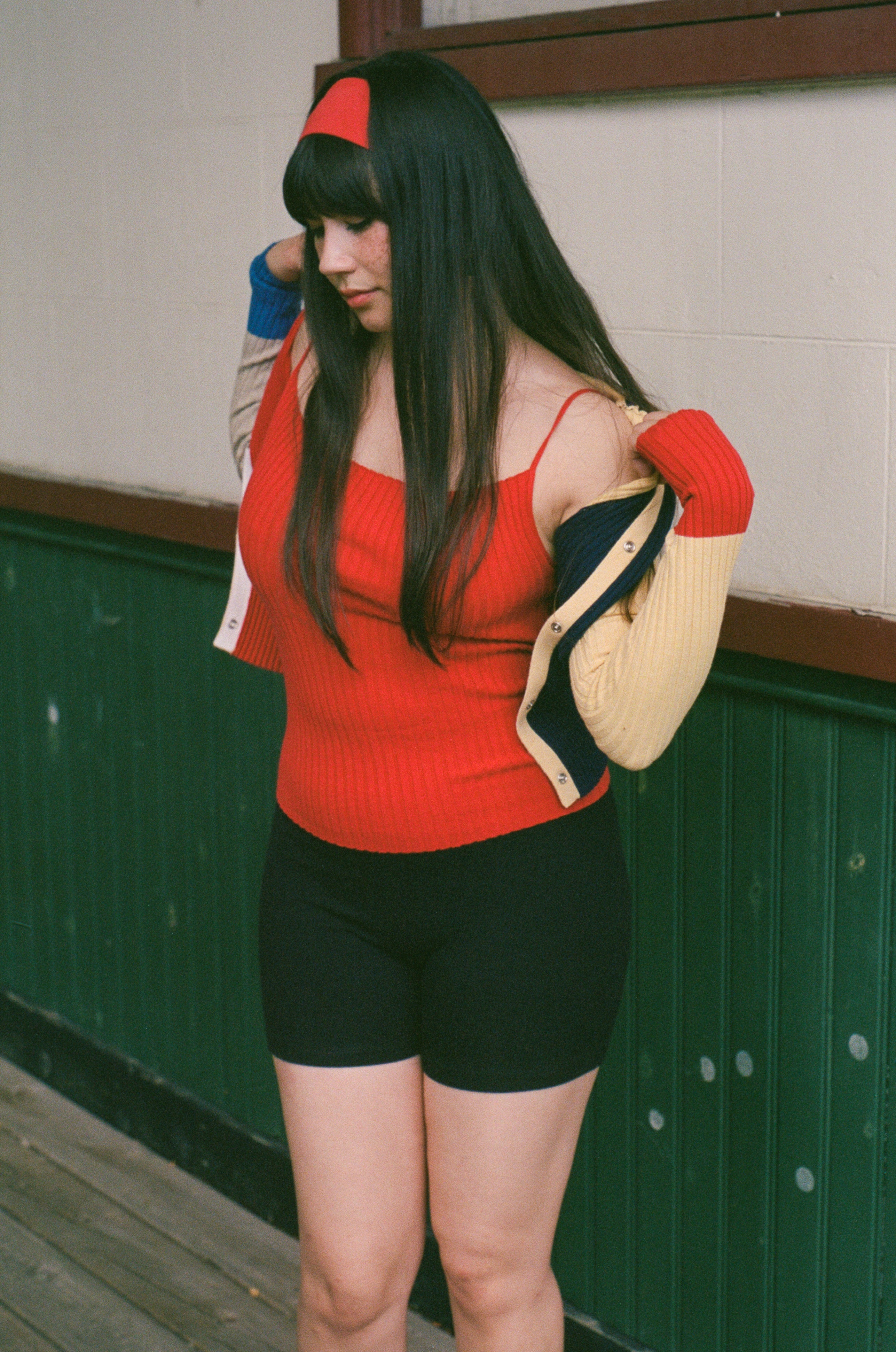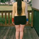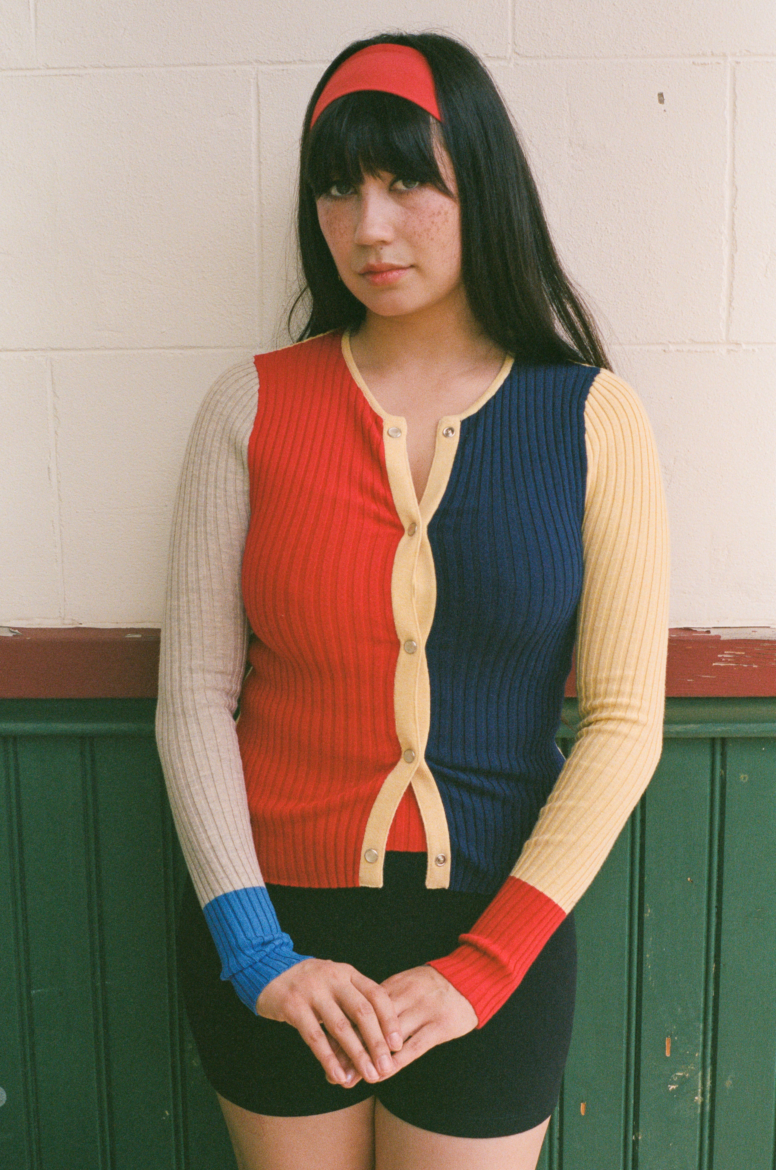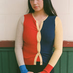 Long sleeve full length cardigan top with snap button closures along the placket. Features a deep rib that comfortably conforms to your body. This piece will mold over your form and stretch to fit exactly your shape, while hugging you tightly smoothing over any lines. Featured in colour block red/navy/yellow/beige.