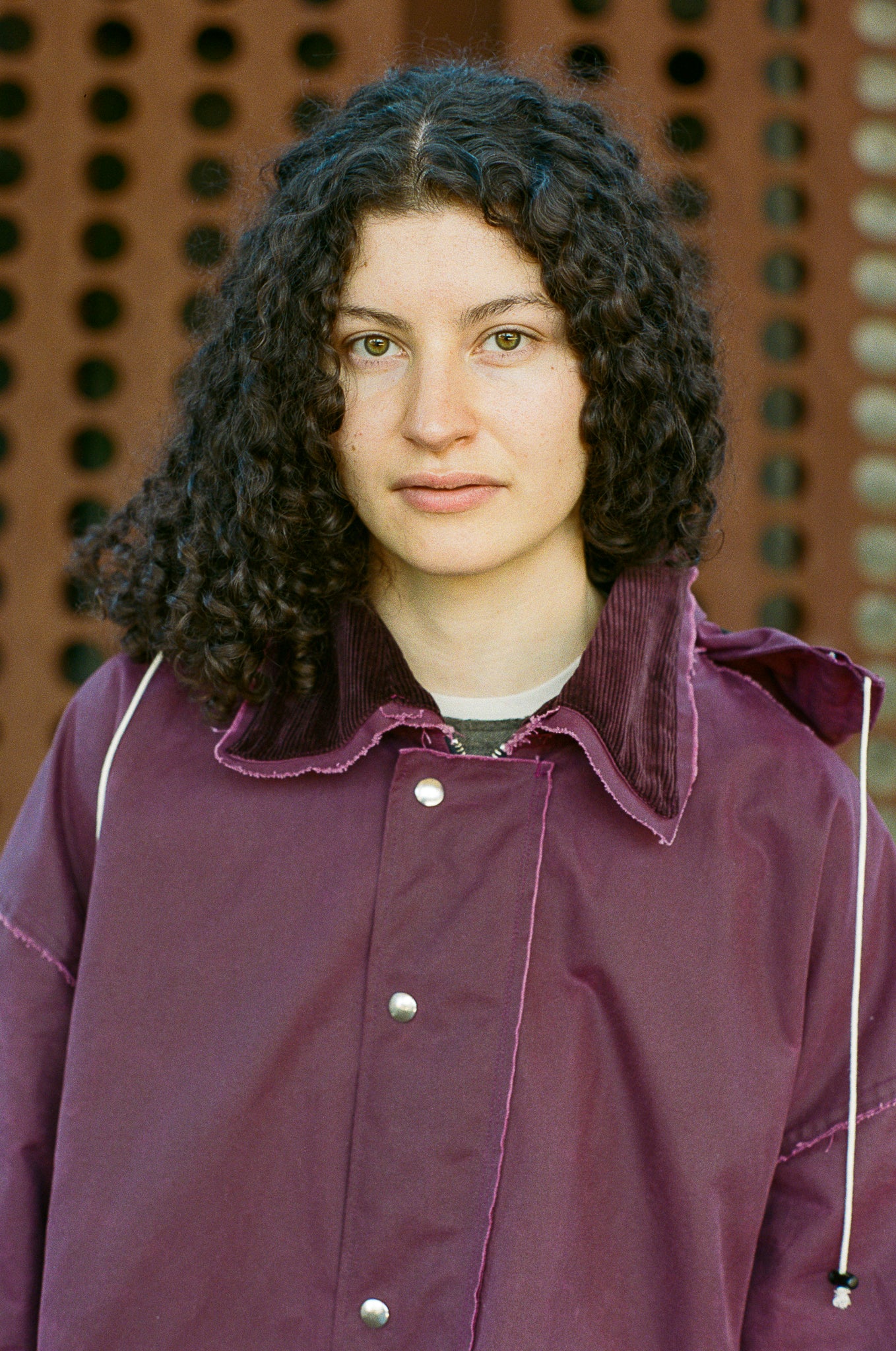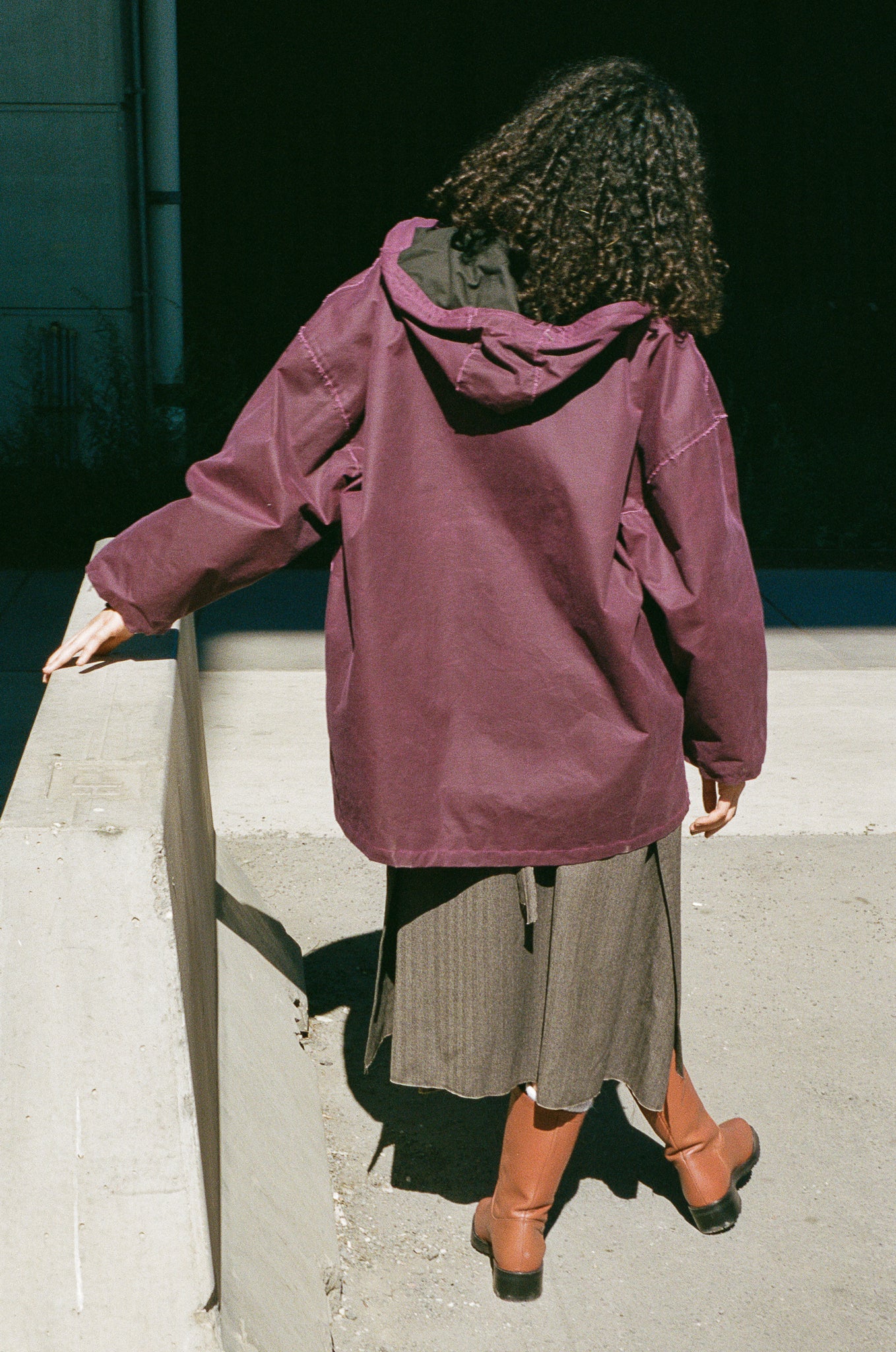 Oversized outdoor jacket in purple water repellent waxed cotton, referring to British utilitarian wear for the countryside, hunting, and fishing. Cotton lining. Zip and snap button front closure. High neck with beautiful texture contrast on the inner upper collar in corduroy, visible when folded over with adjustable snap button tab closures, meeting at a detachable hood with drawstrings and metal wires. Long wide sleeves that have rib cuffs retaining the shape. Durable and breathable, by virtue of the waxed cotton and ventilation holes with eyelets at the underarms. Two big flap pockets with snap button closures. Features irregular contrast topstitching and extended raw edge seams at the shoulders, armholes, neck, and sides. Men's sizing.