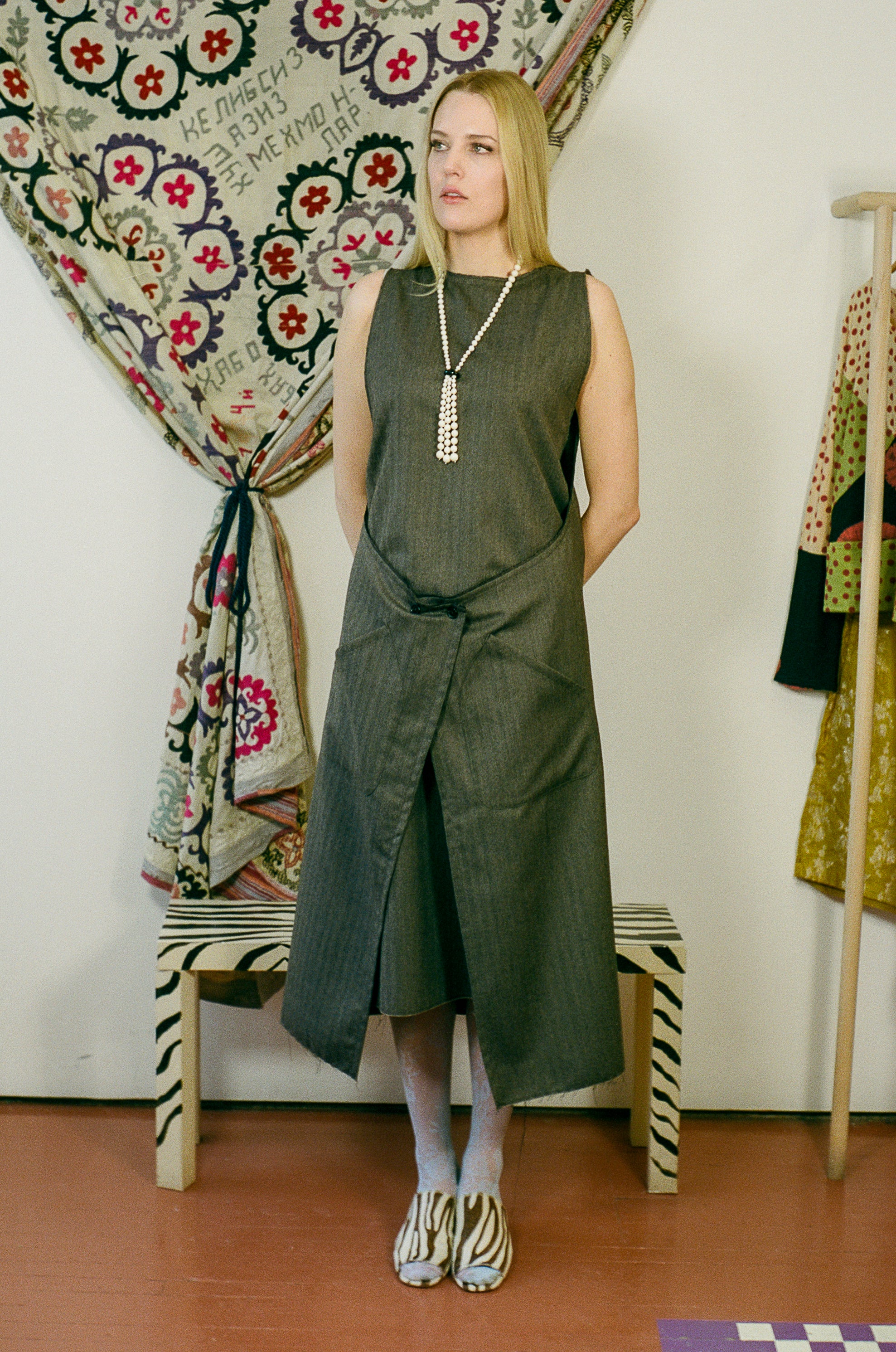 Talvi wears with the Wrap Dress in Herringbone and Penelope Mule in Zebra Ponyhair.