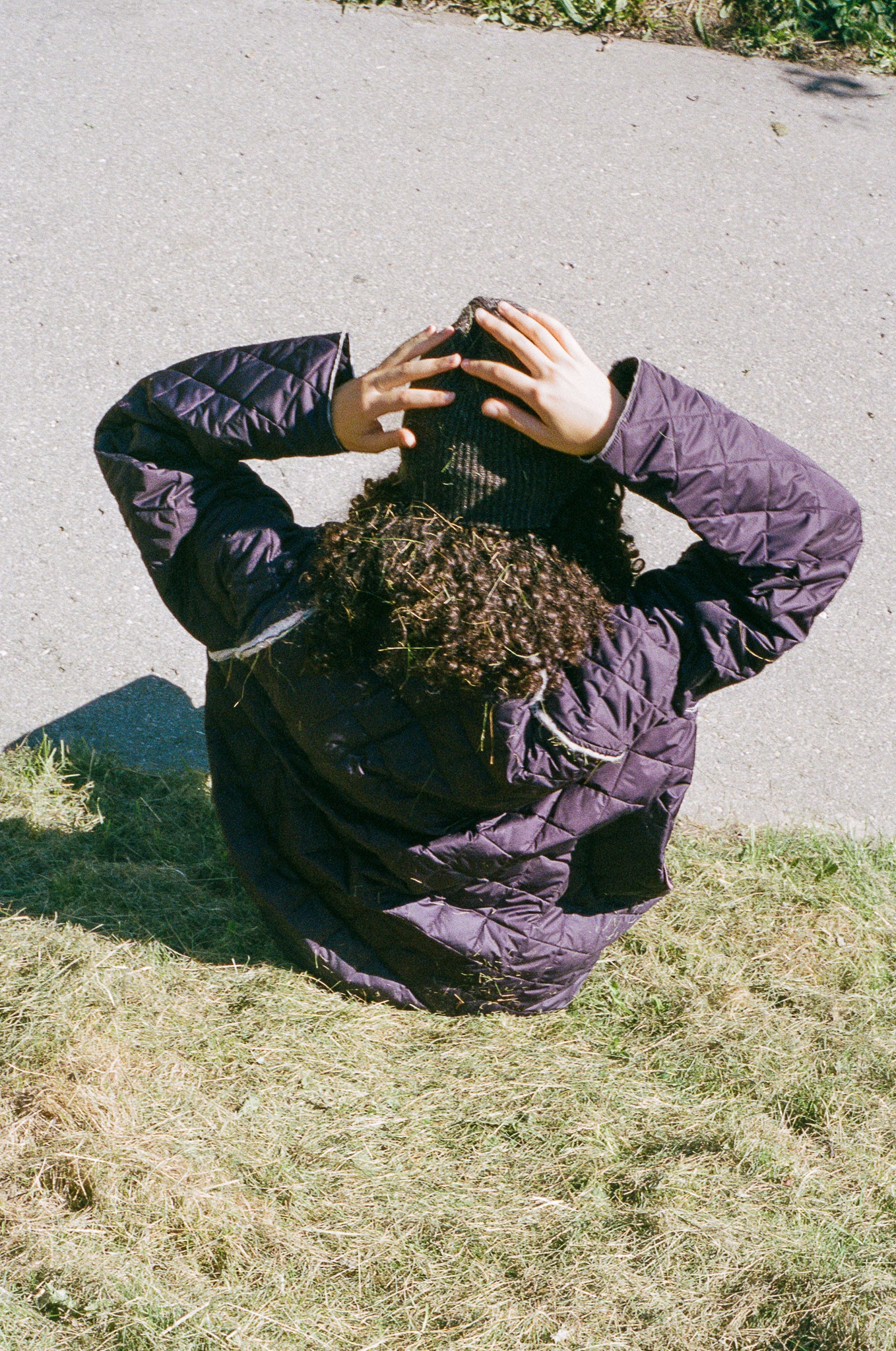 Oversized padded quilted coach jacket in dark purple with raglan sleeves, lined with exposed soft off white cotton. Finished with irregular contrast stitching and raw details at the edges. Hidden zip and snap button front closure. Features two angled welt pockets complimented by stand out leather patches in mauve purple, and additional textured contrast corduroy collar. Men's sizing.