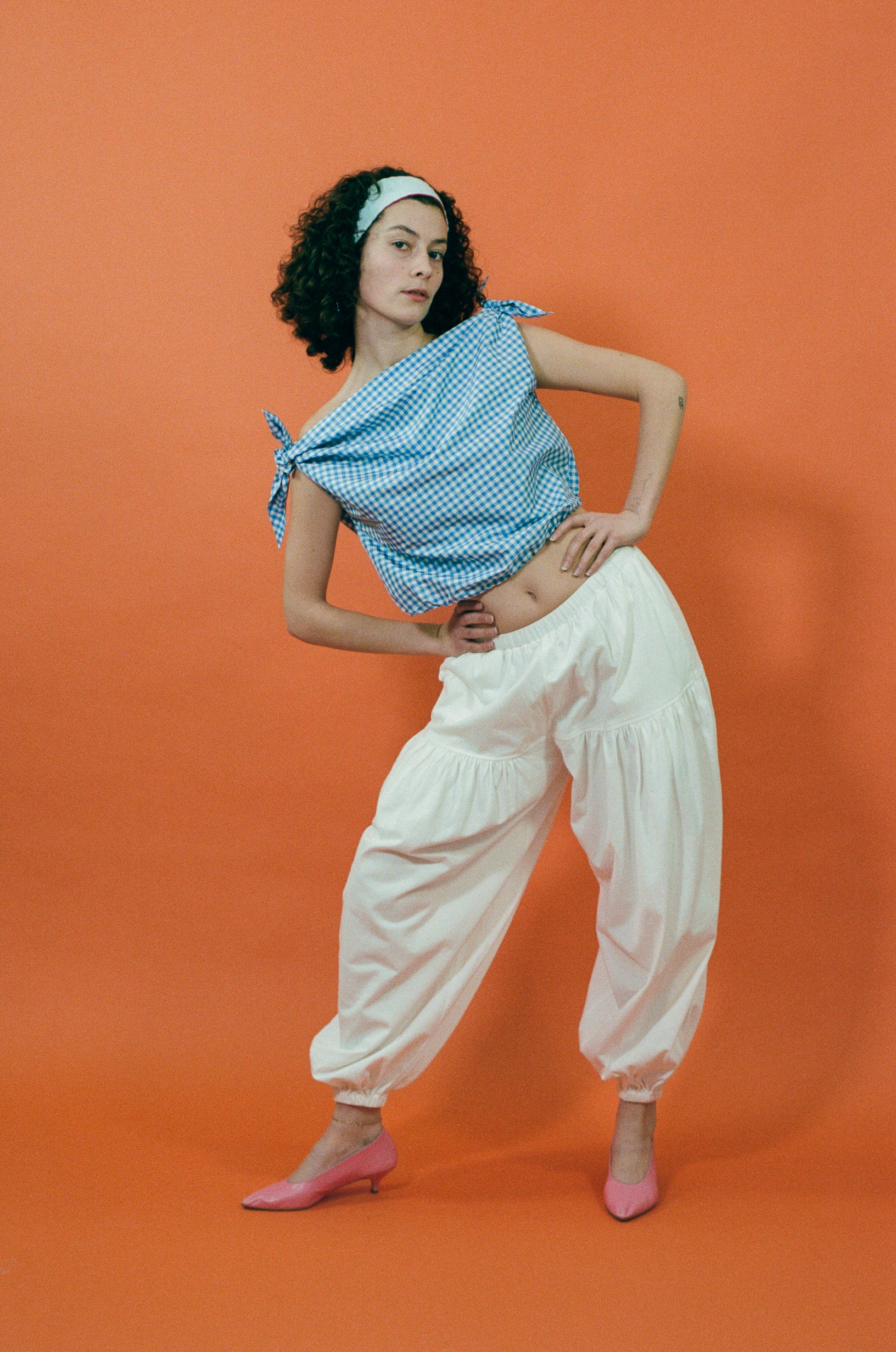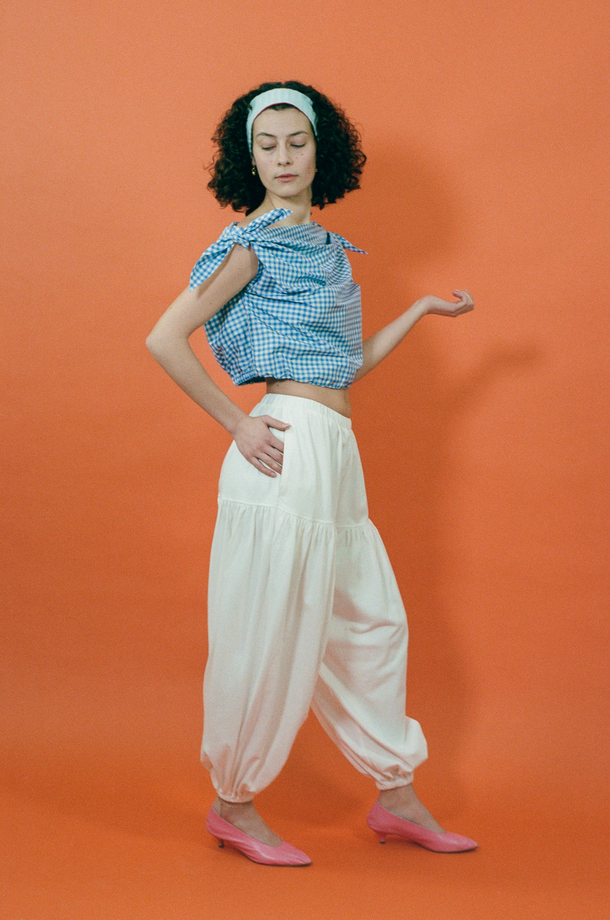 Kenzie is 5'9 and a size small/medium, and wears size small with the Swan Top in Gingham Picnic, After Party Heel in Gum, Nonna Headband in Strawberry/Glacé, and Gioca Earrings in Gold.