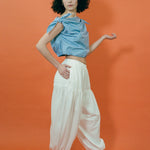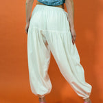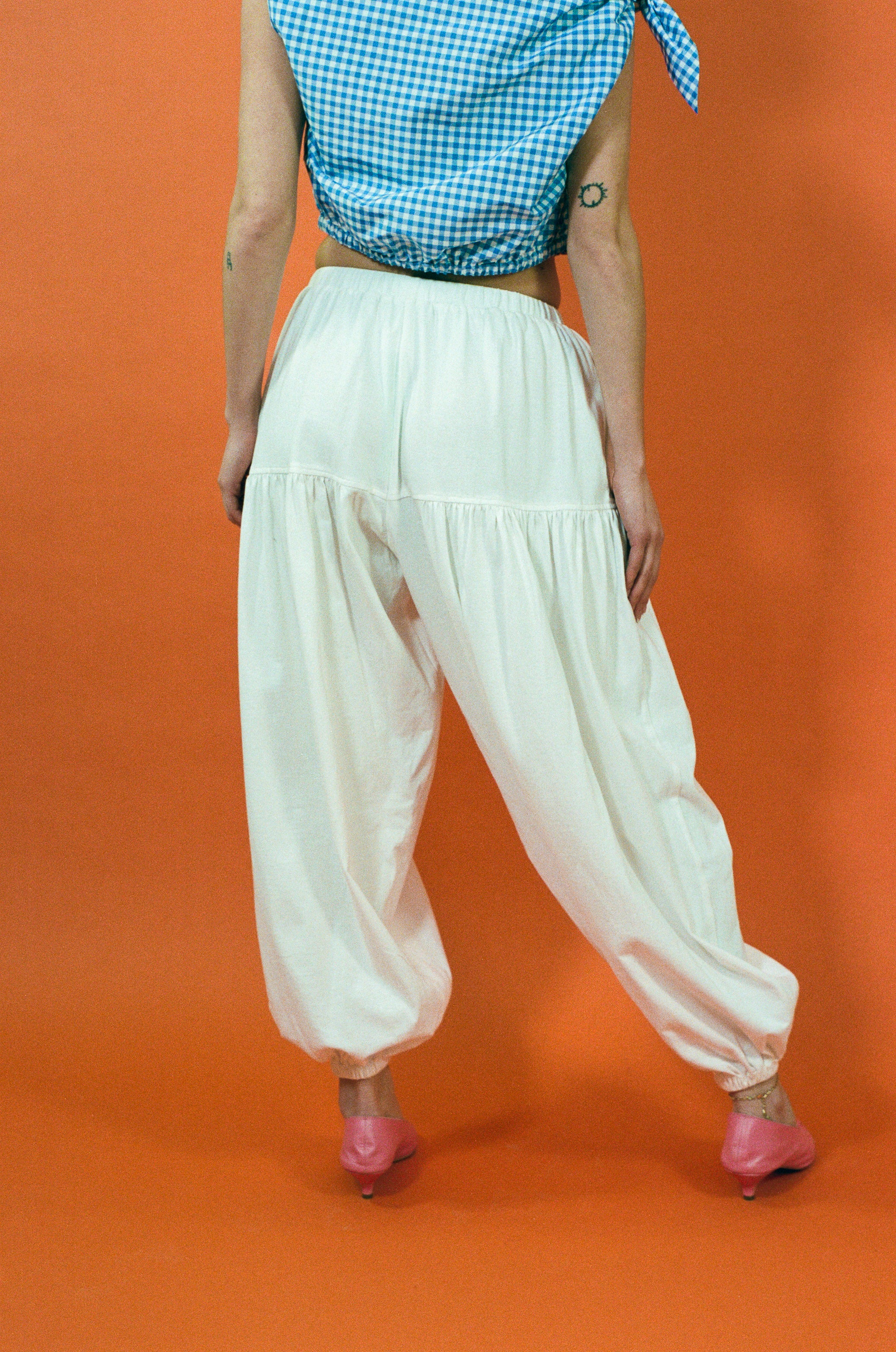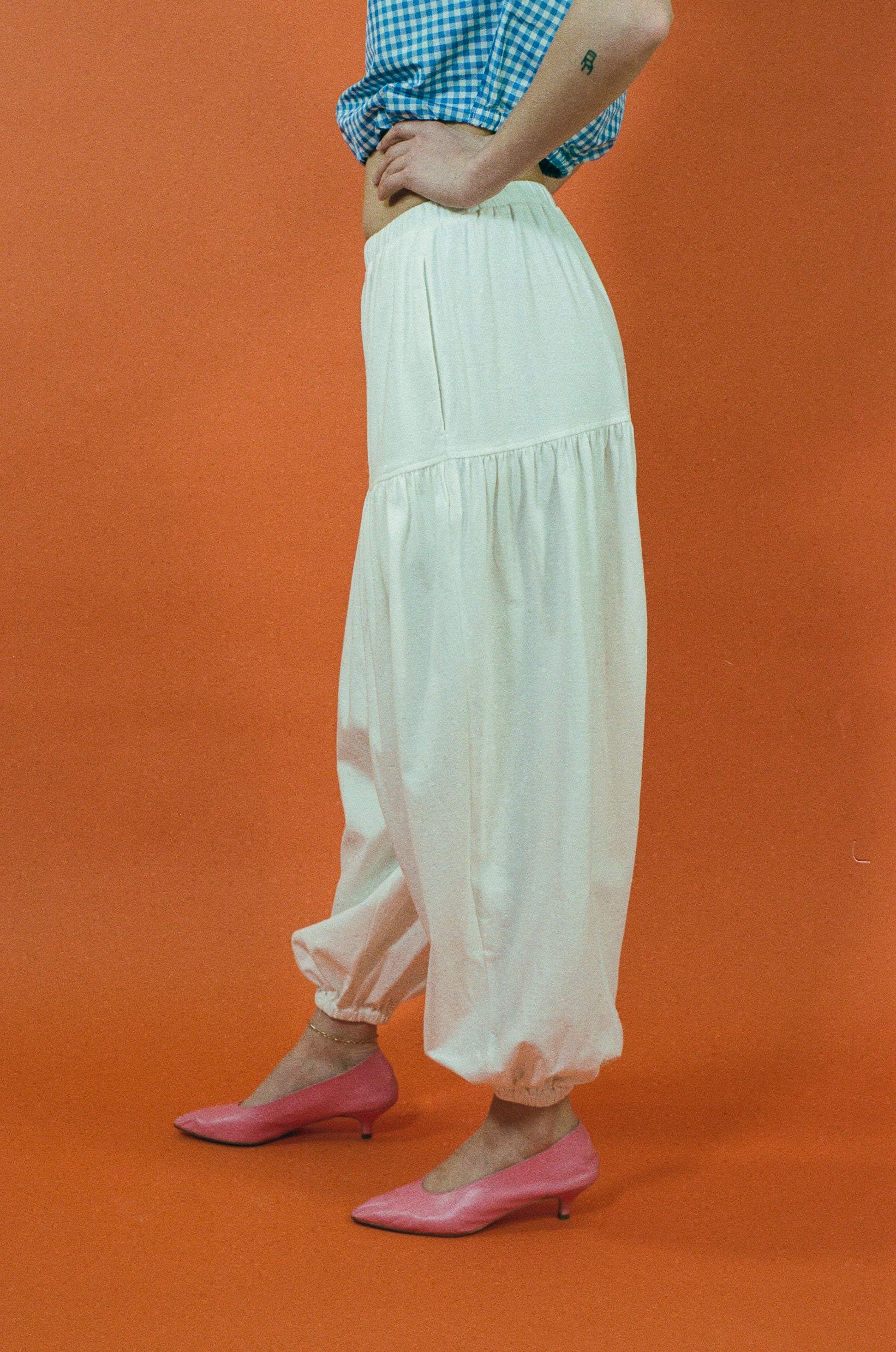 Hitting right above the ankle in length, the Rain Jogger's have shirred pant legs for maximum volume gathered at the elasticated leg opening and elasticated waistband with a drawstring closure. The ultimate 80s silhouette. Crafted from soft cozy cotton in white. Side seam pockets.
