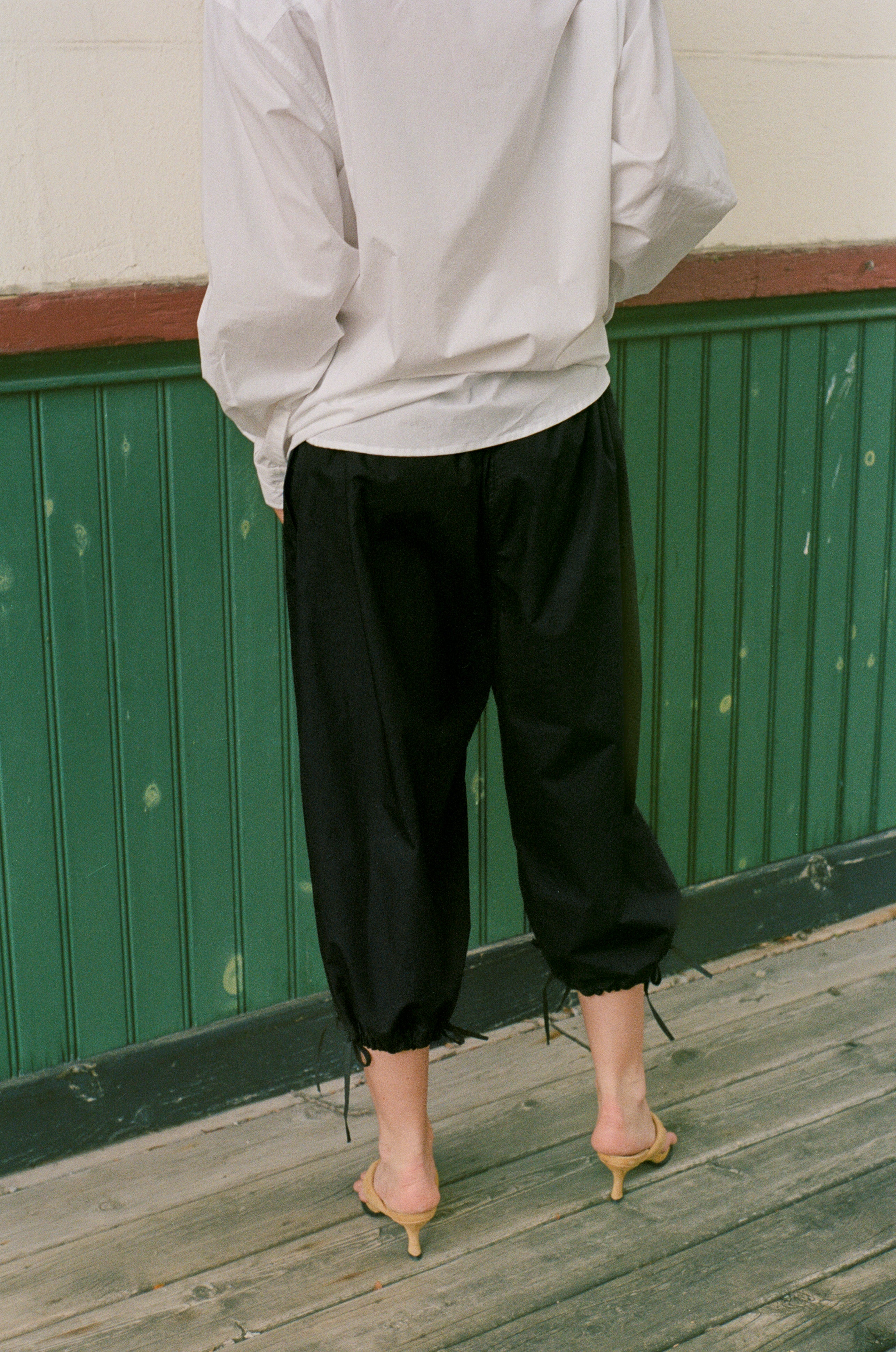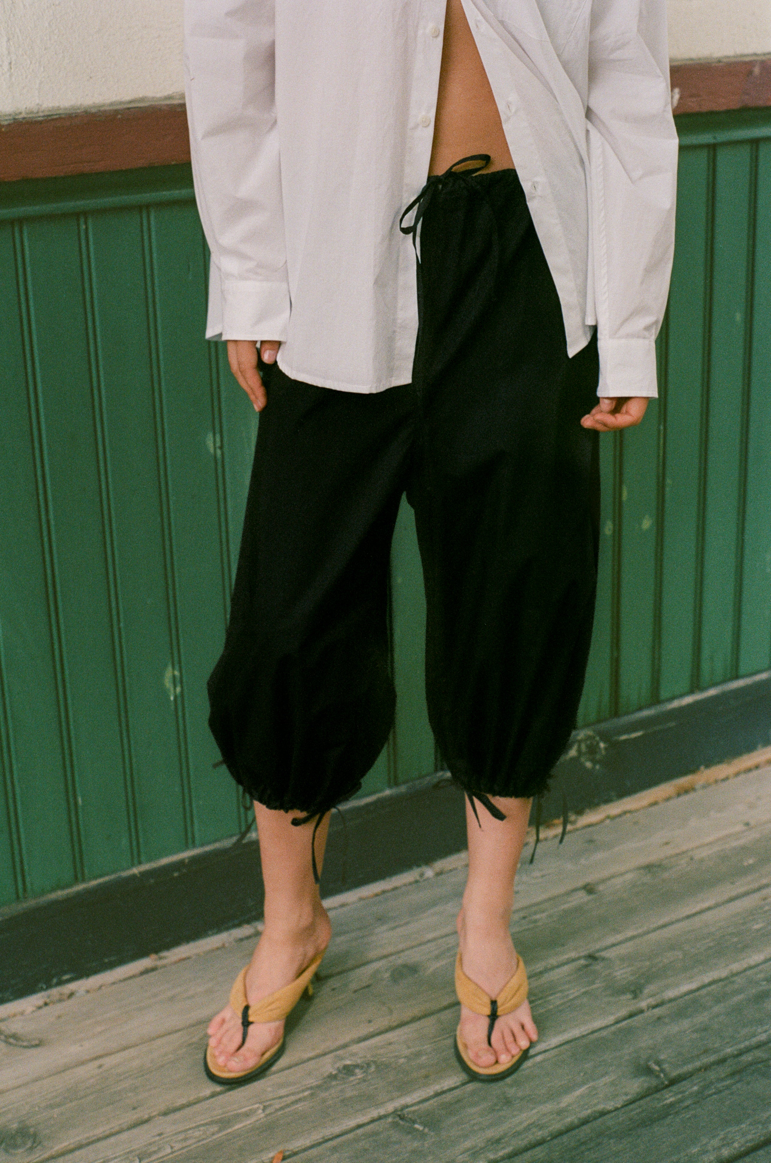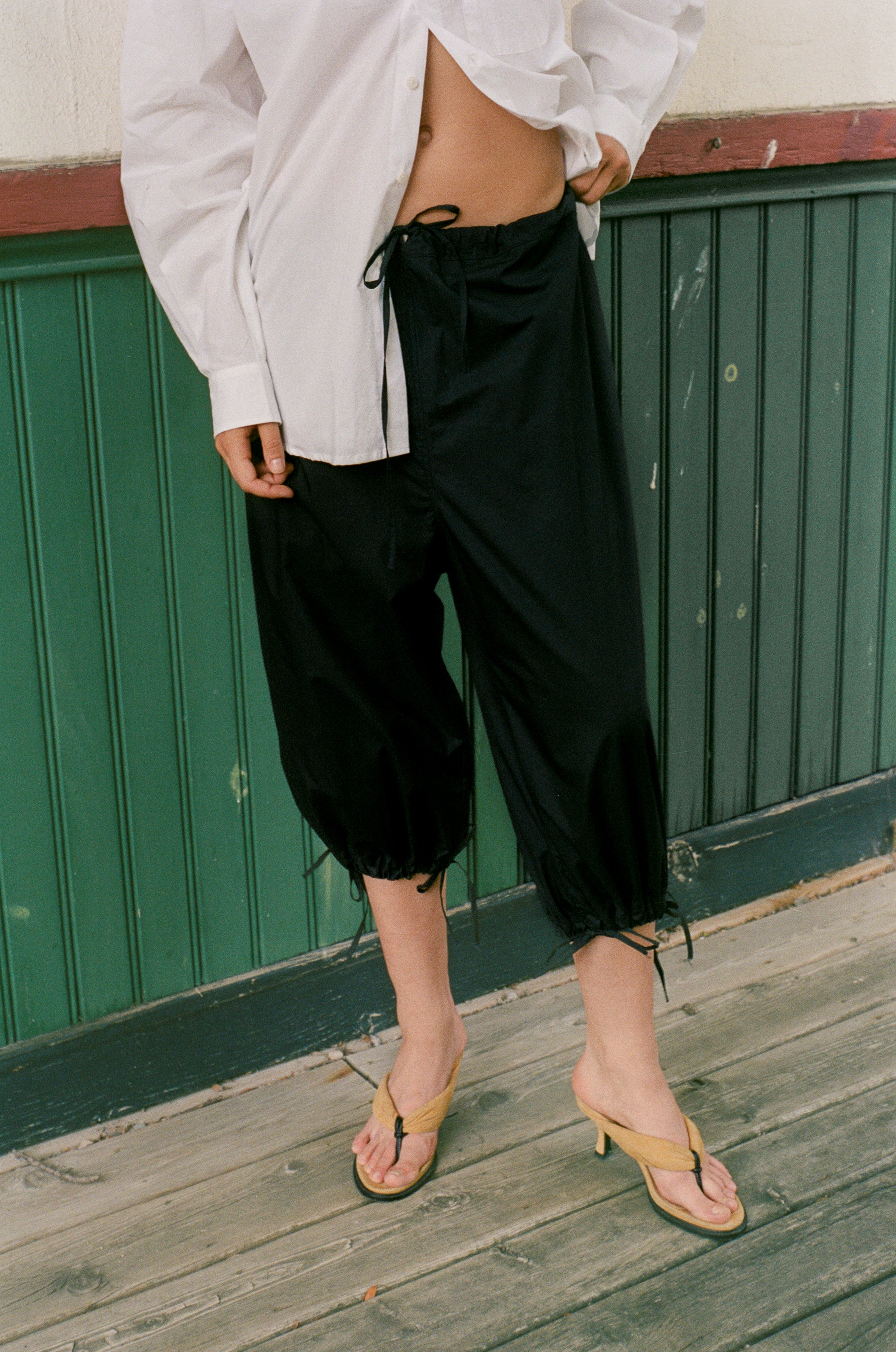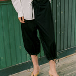 Wide, straight cut capris in black with side slit pockets. Open size fit adjustable in shape, the Romain Capris have a string tie waistband pulled to your desired fit for a pleated effect, and string ties at the bottom hem for a gathered fold. Lightweight and versatile. Wear high waisted, low, baggy, or straight, each way as flattering as the other. The perfect pants for every person.