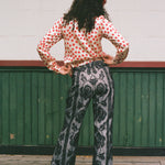 Mid rise straight leg long pants hugging you comfortably in all the right places you'd want to be fitted without compromising the integrity of the silhouette. Button and zip fly closure. Side knife pockets. Crafted from fabric reminiscent of antique curtains, the Roses Pants include two layers: a white cotton bottom base underneath black cotton lace of roses for contrast in the pattern.