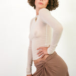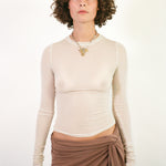 Classic cut fitted long sleeve top with a high round neck in soft and stretchy tencel/spandex. Featured in cream, it has a flattering sheerness to it that tastefully compliments the body underneath without feeling restricted. Fits true to size. Size up if you want a more relaxed fit.