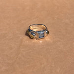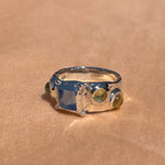 Sterling silver ring set with ice blue and limoncello yellow glass stones. Ancient and mysterious, like it emerged from a tomb.
