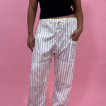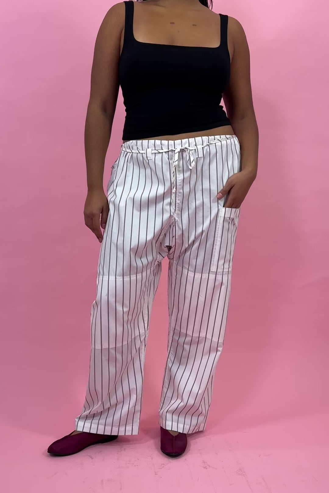 Unisex, highly adjustable, all-purpose pant with all-around drawcord, front ties, side keyhole details, and a large front pocket in lightweight cotton. One of those magical pieces that fits virtually everyone, through all stages of life. Featured in white with burgundy stripes throughout.