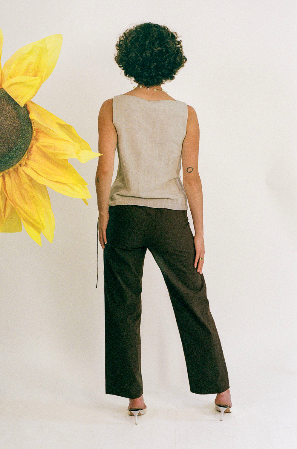 Low rise cotton poplin straight leg pants in chocolate brown. Features fully adjustable waist with side string tie closures into a box, pulled to your desired fit. Designed, cut, and sewn in Echo Park, Los Angeles.