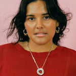 Adiya wears with the Lacerta Sheer Sweater in Ruby and Silver Terra Necklace.