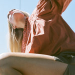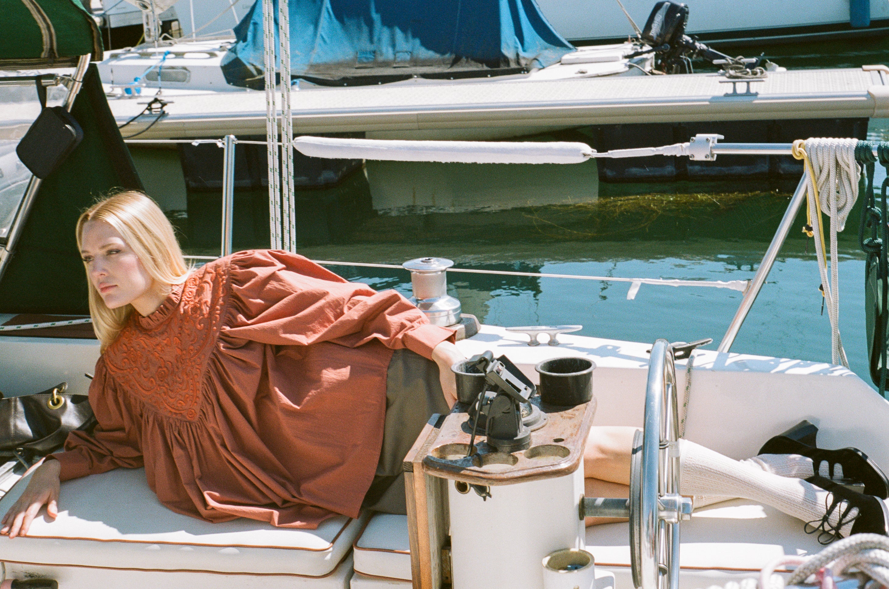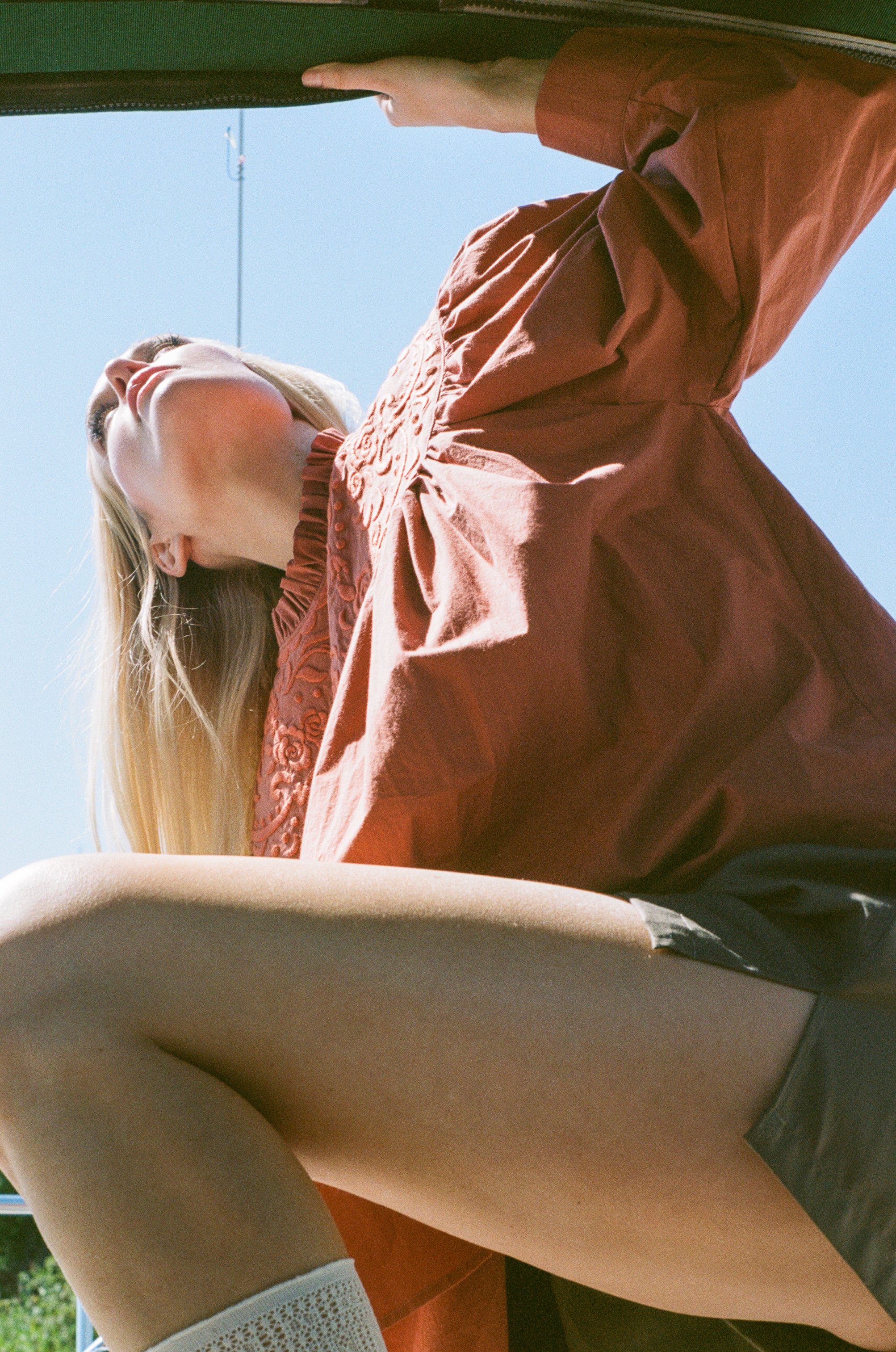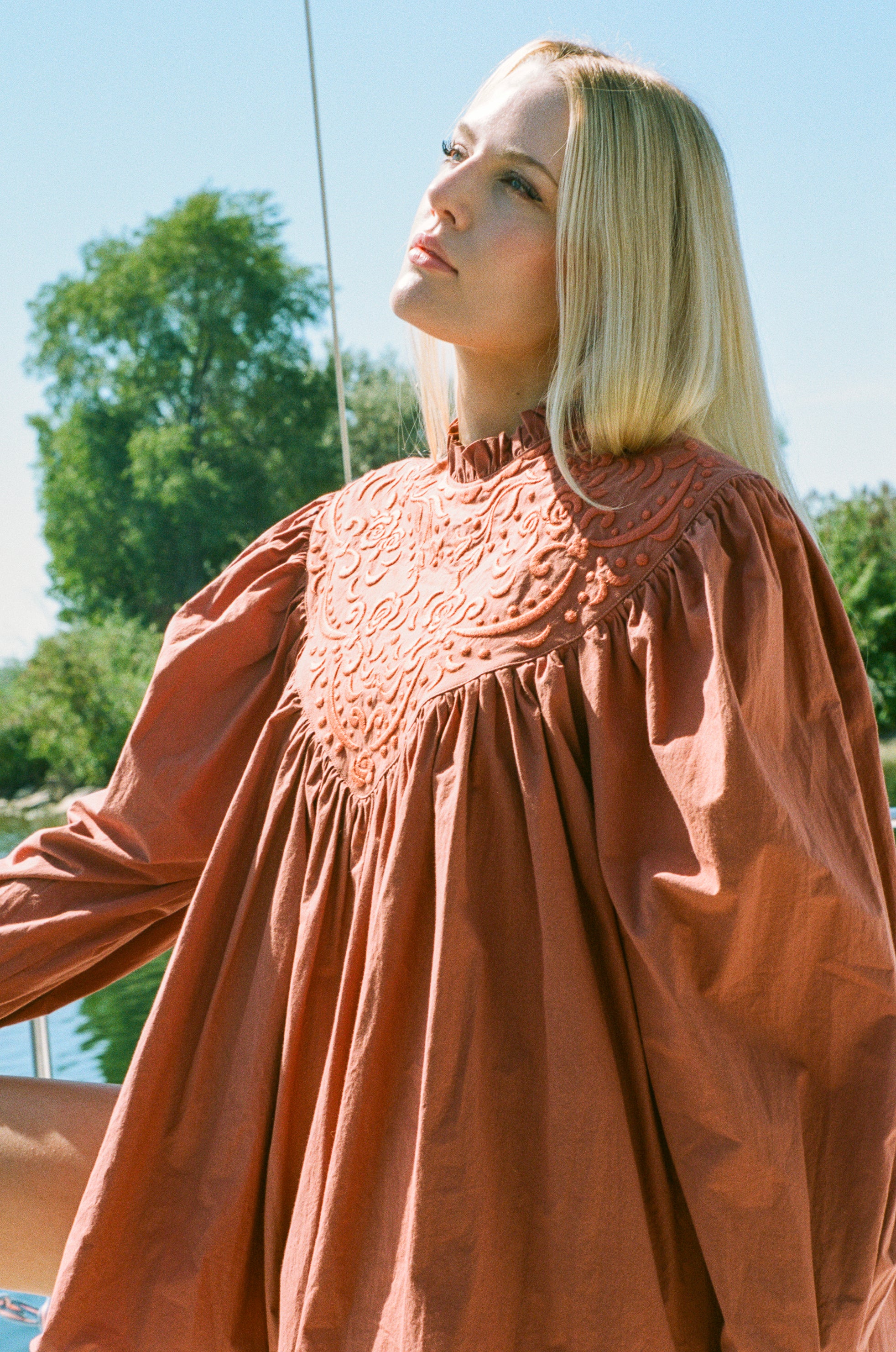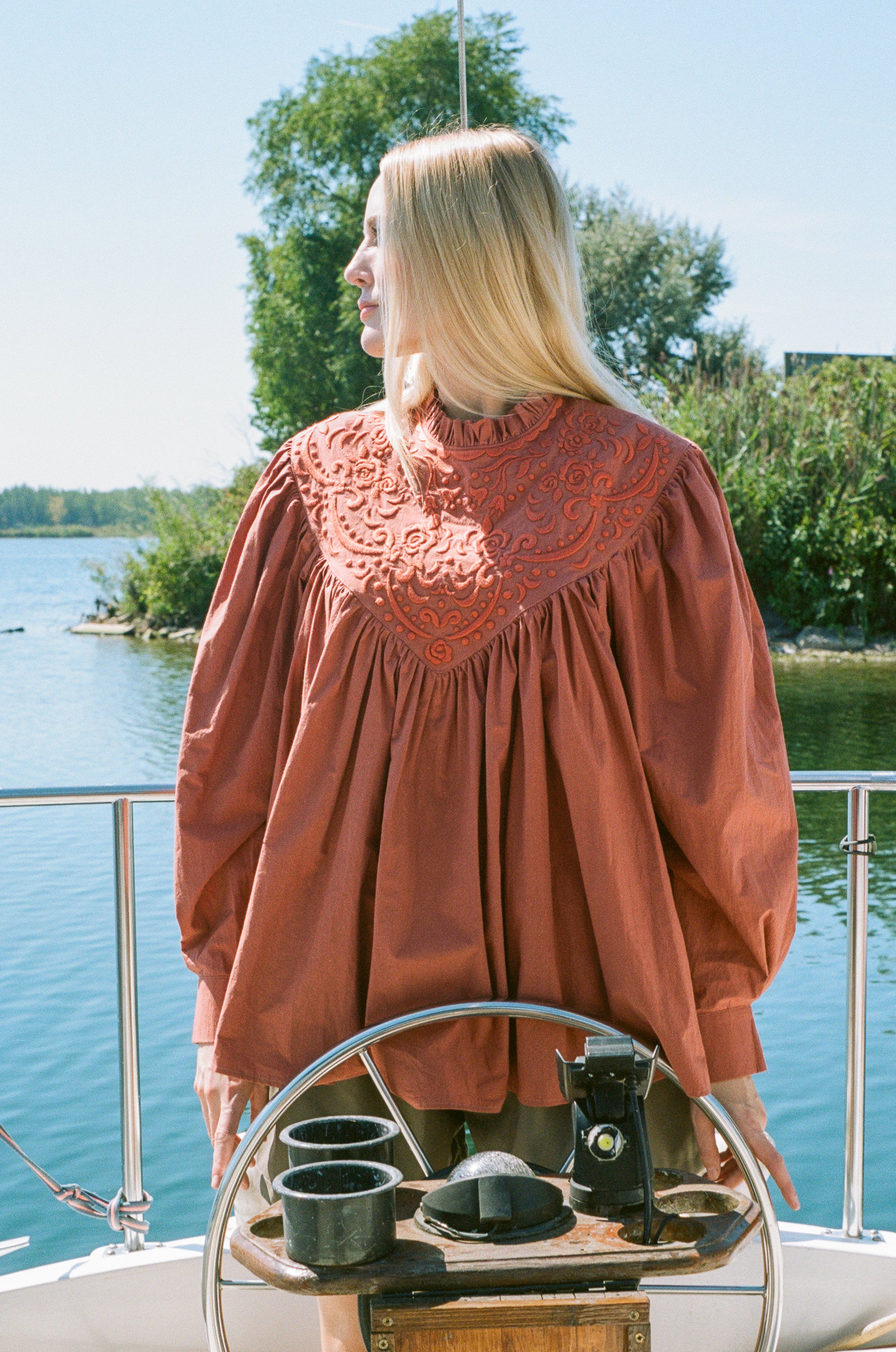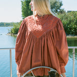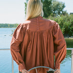Crafted from 100% organic Japanese cotton, the Ustina Top has a wide silhouette, long voluminous gathered sleeves into buttoned wrist cuffs, and a delicately embroidered yoke. The high ruffled neckline enhances its vintage inspired silhouette, while button closures at the back neck add a refined finish. Featured in terracotta orange.