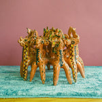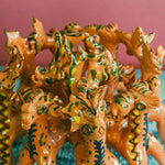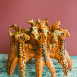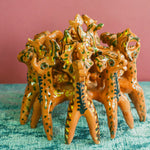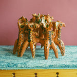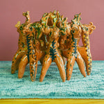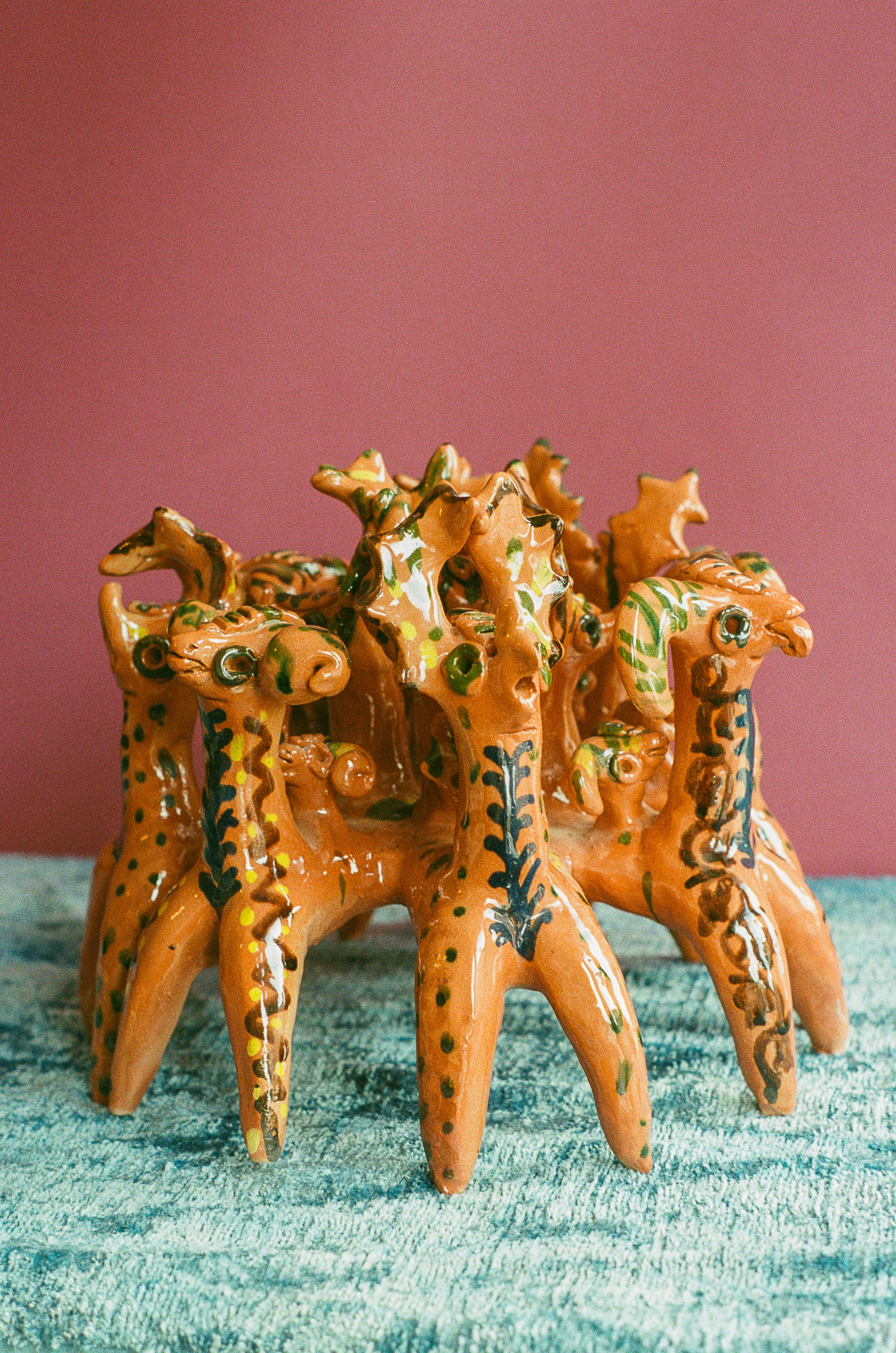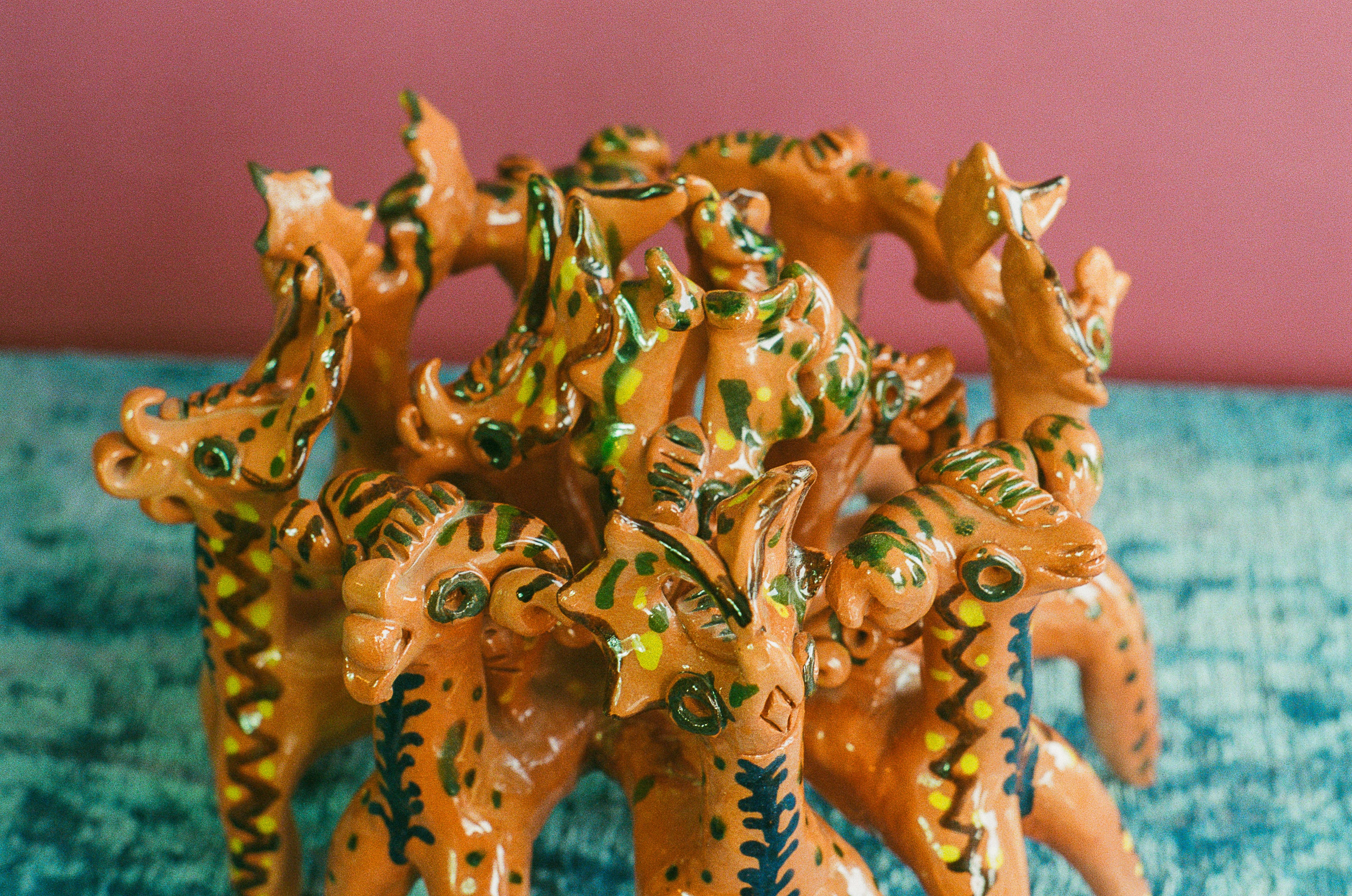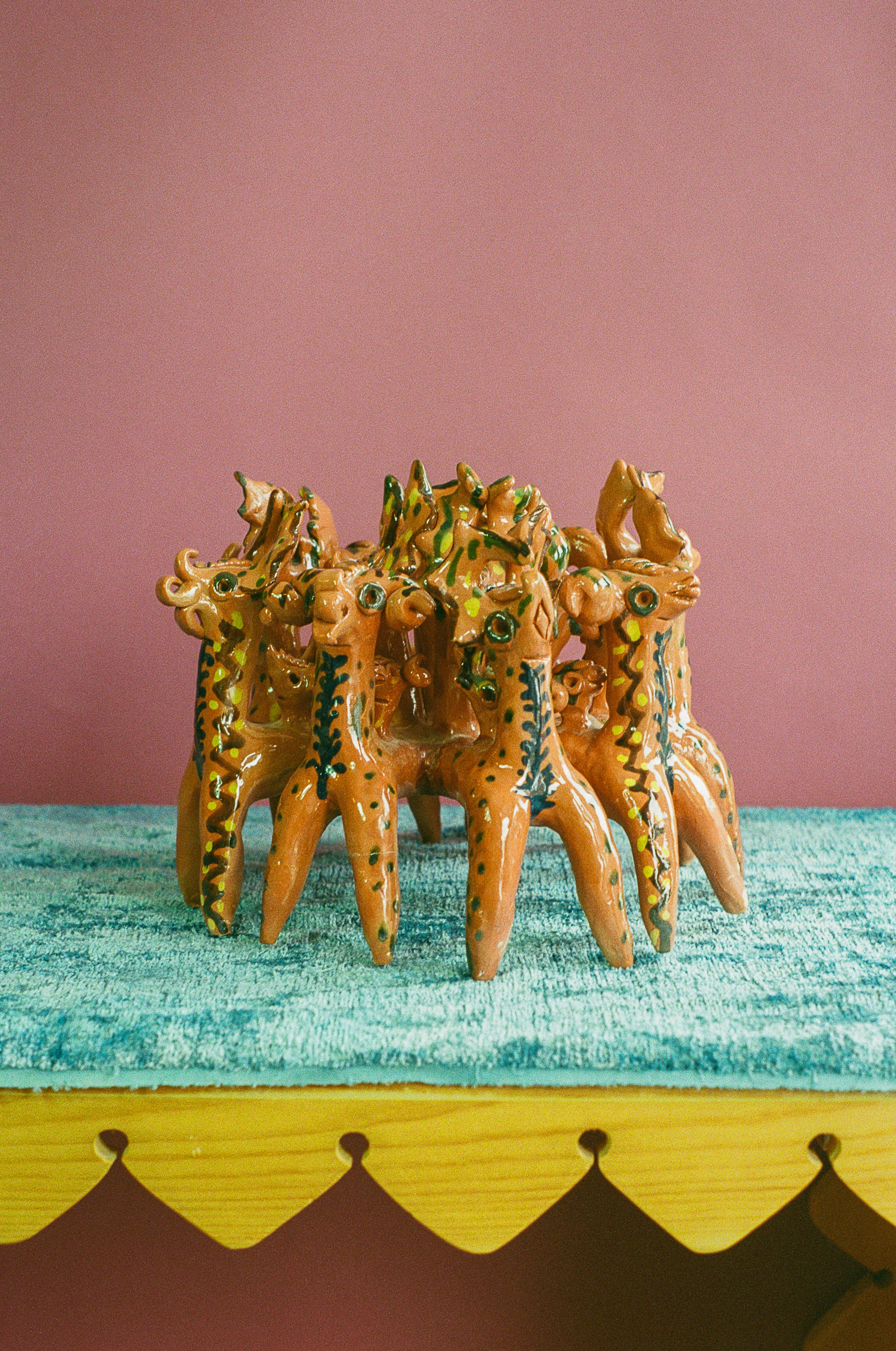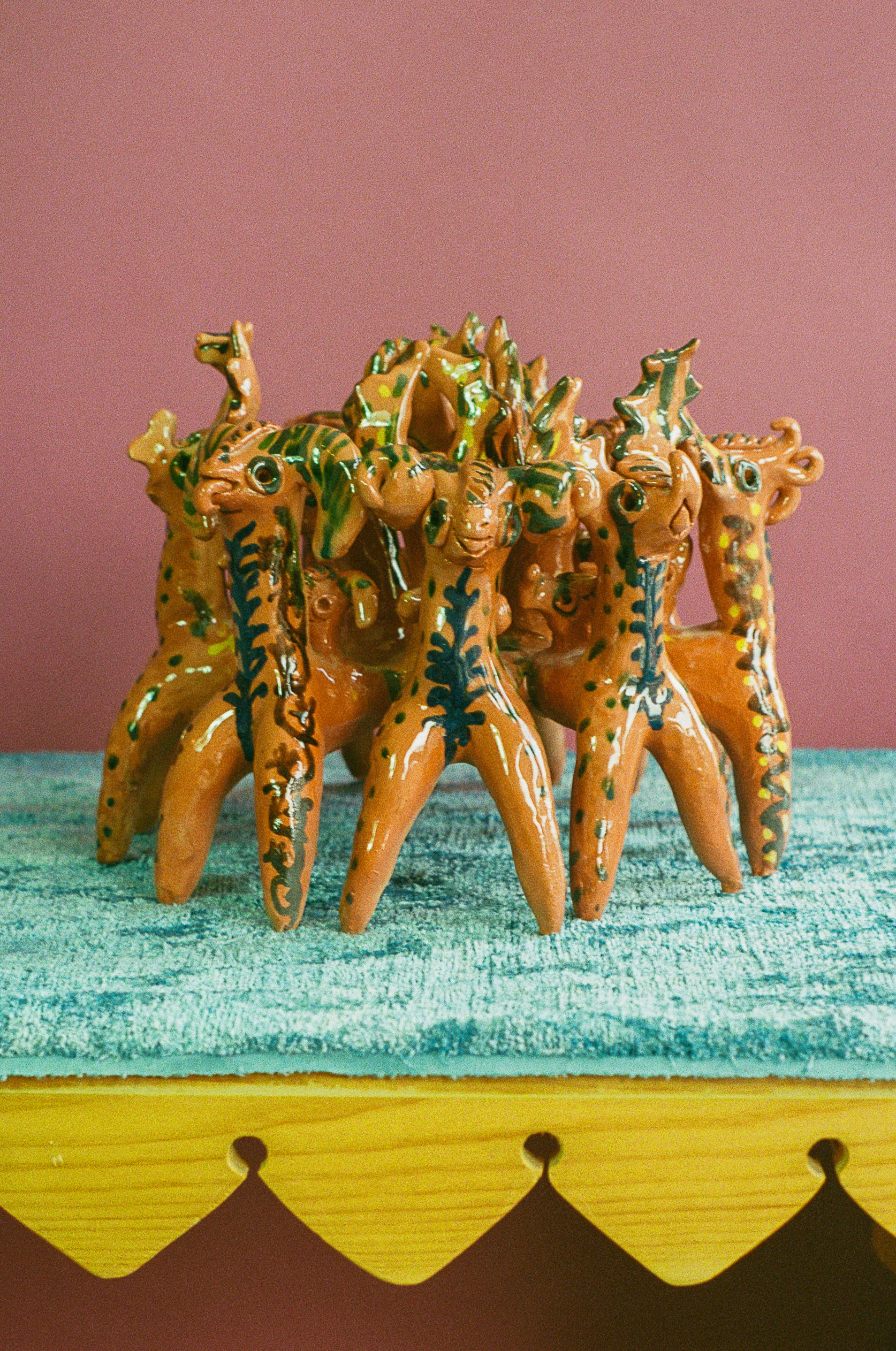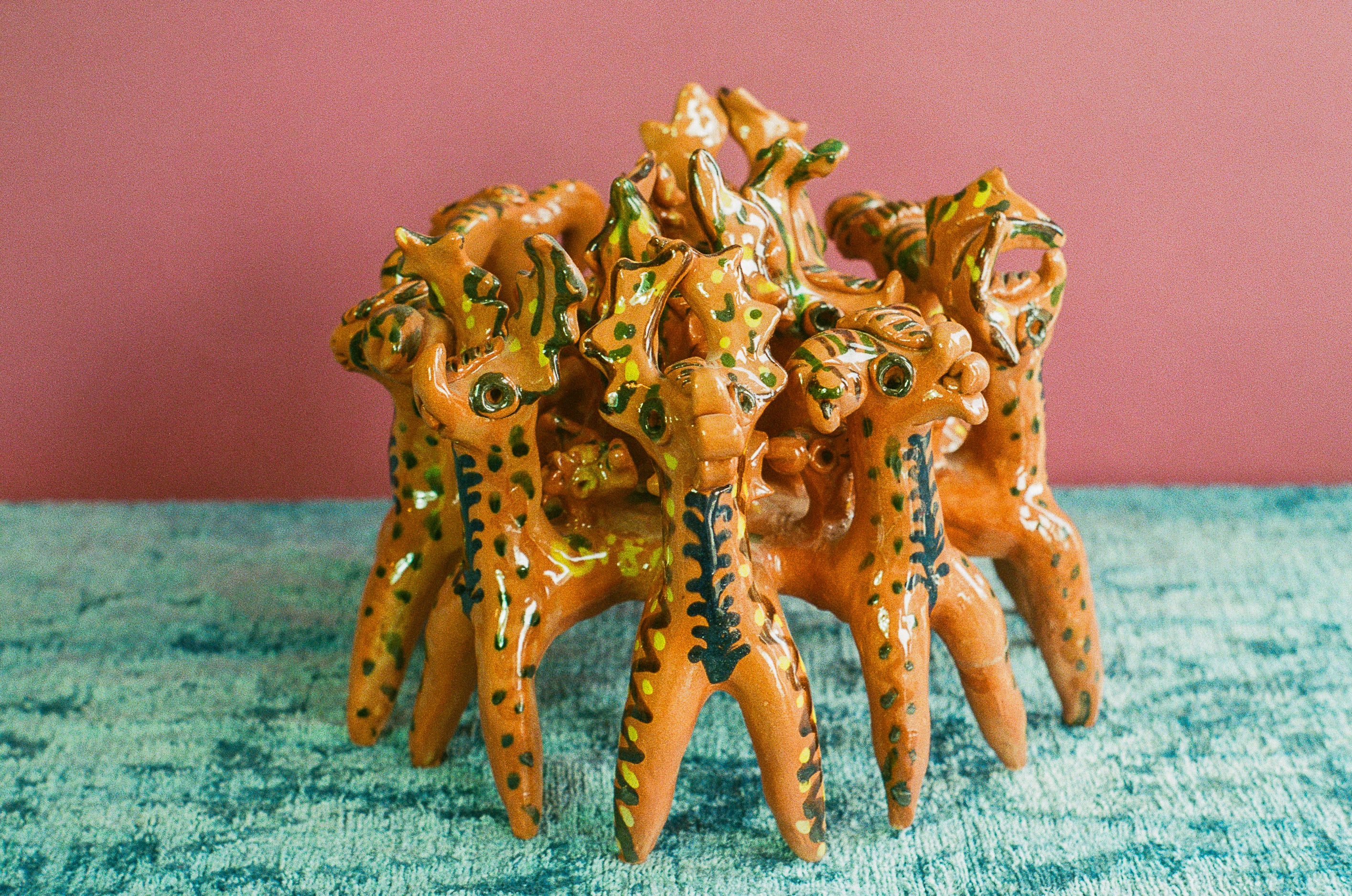 Sculpture of a family of clay monsters joined at the center made by artist Dilnoza Narzullaev.