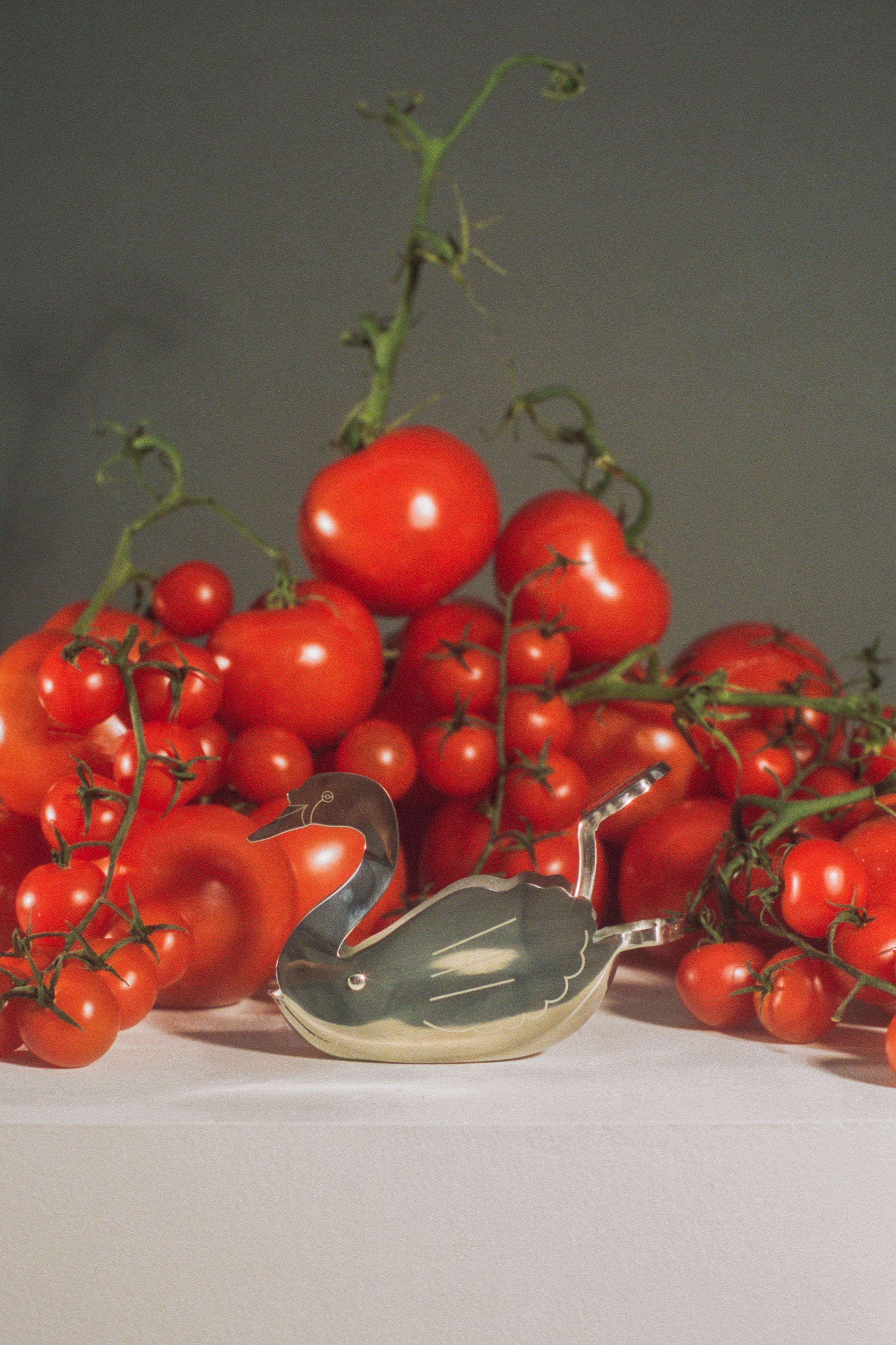 Silver swan shaped squeezer fit for a generous wedge of lemon, making for a fine tabletop accompaniment with seafood, salads, and beyond.
