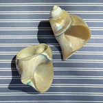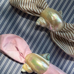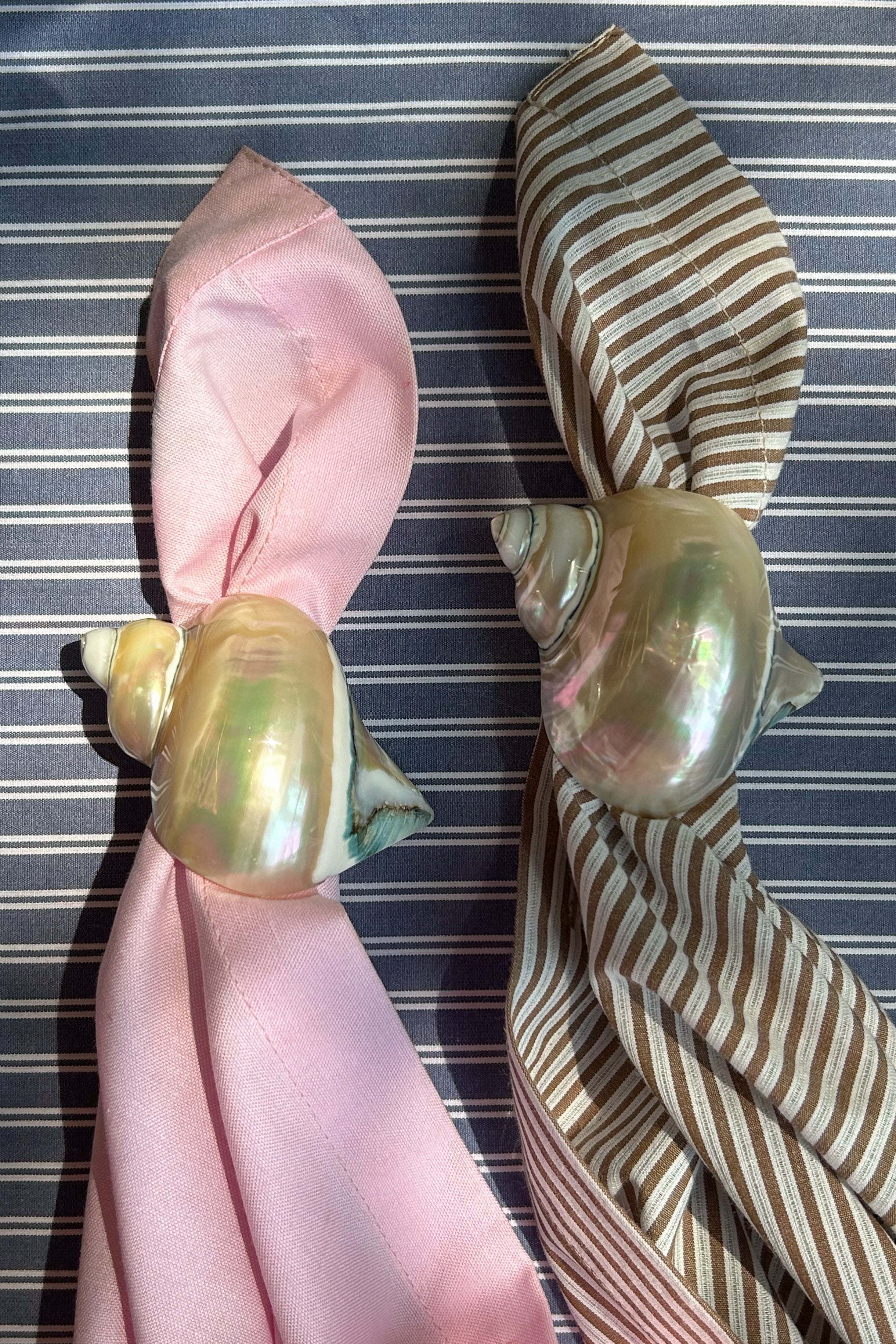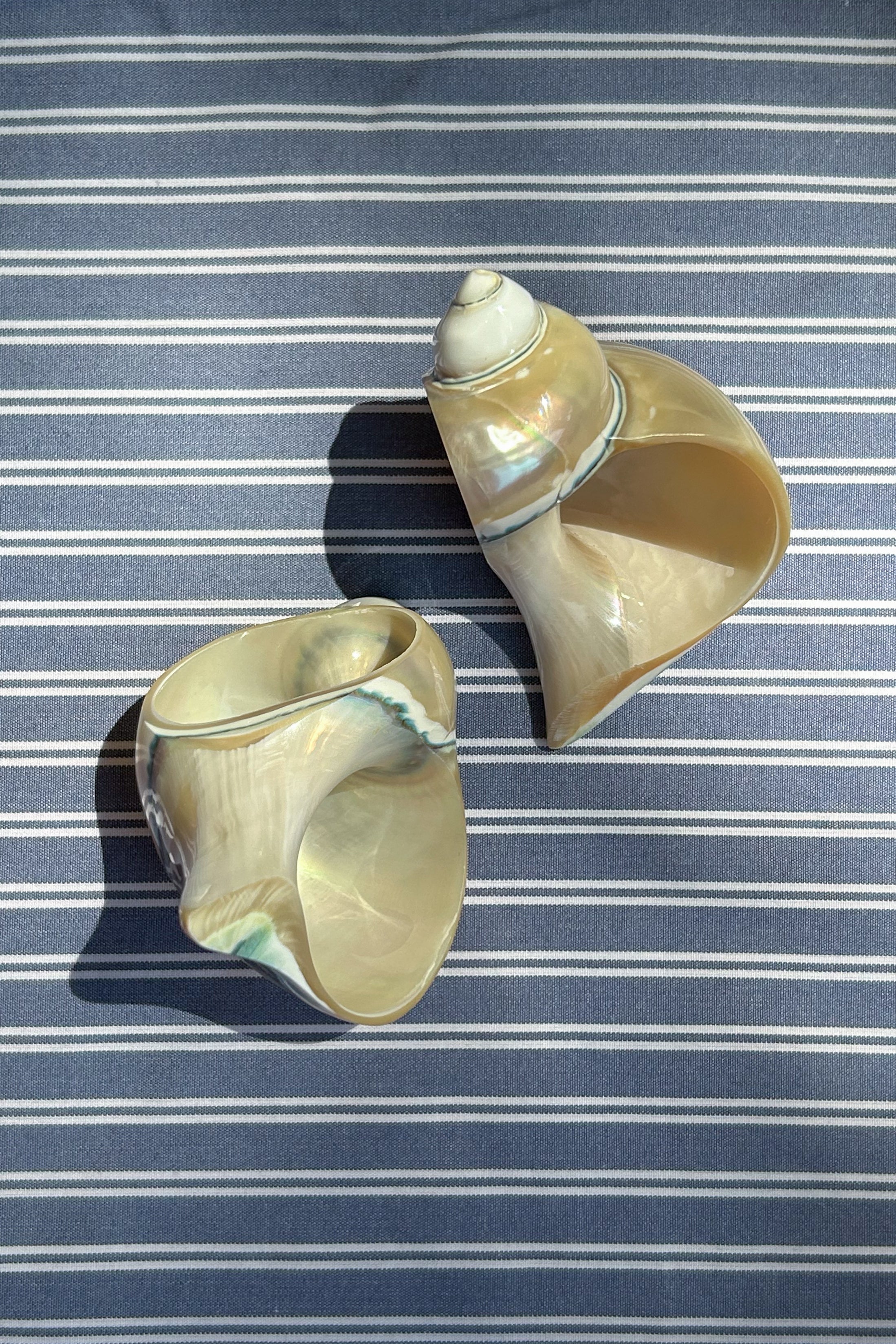 Large swirl shell napkin ring set made by hand from natural materials. Variations in shape, size, and colour are a sign of quality and are to be embraced. Treat your freshest linens to their perfect compliment. Sold as a set of two.