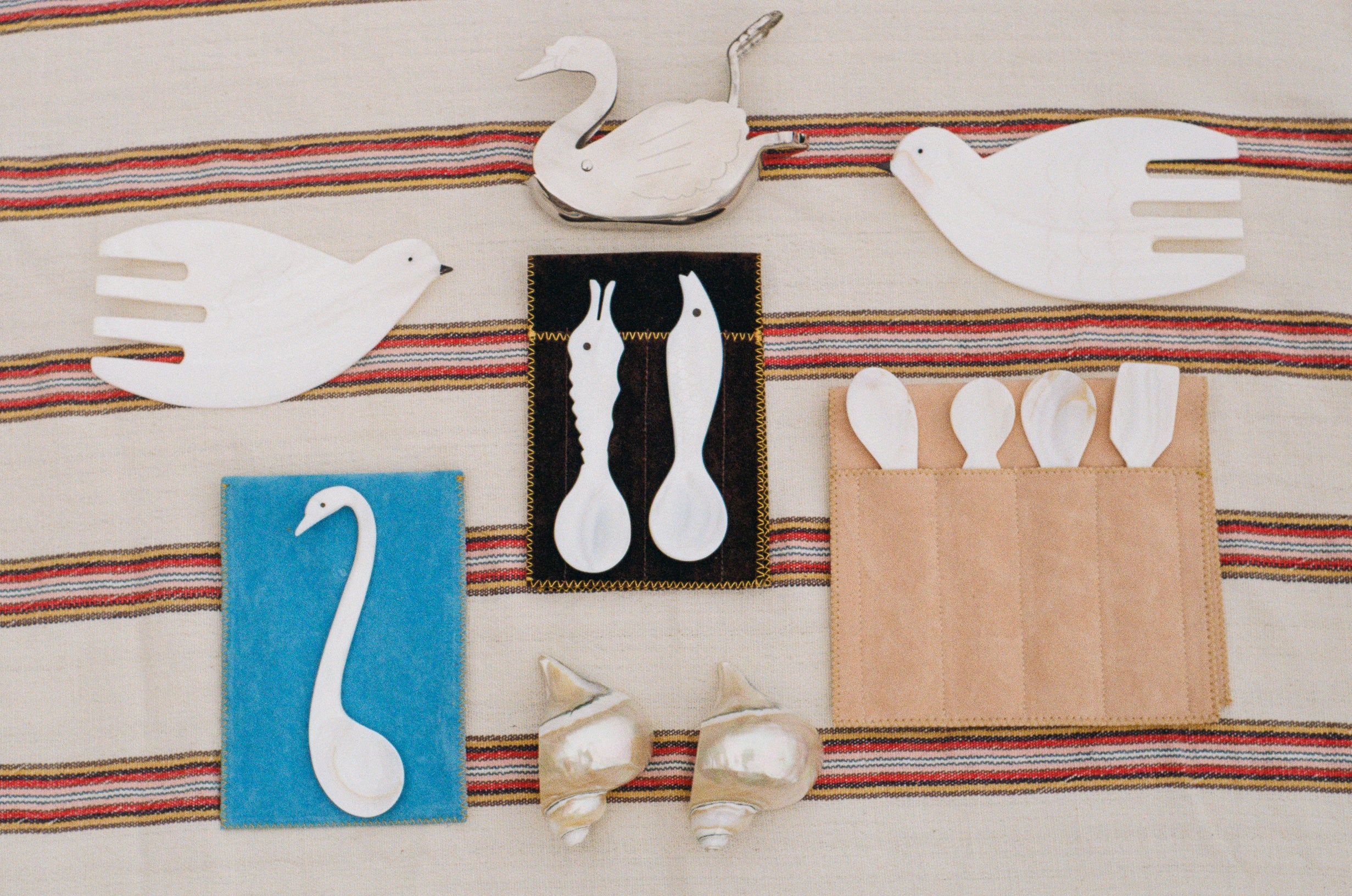 Pictured with the Dessert Spoon Set in Mother of Pearl, Dove Salad Servers, Sea Creatures Spoon Set in Mother of Pearl, Swan Spoon in Mother of Pearl, and Lemon Squeezer, Swan.