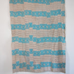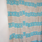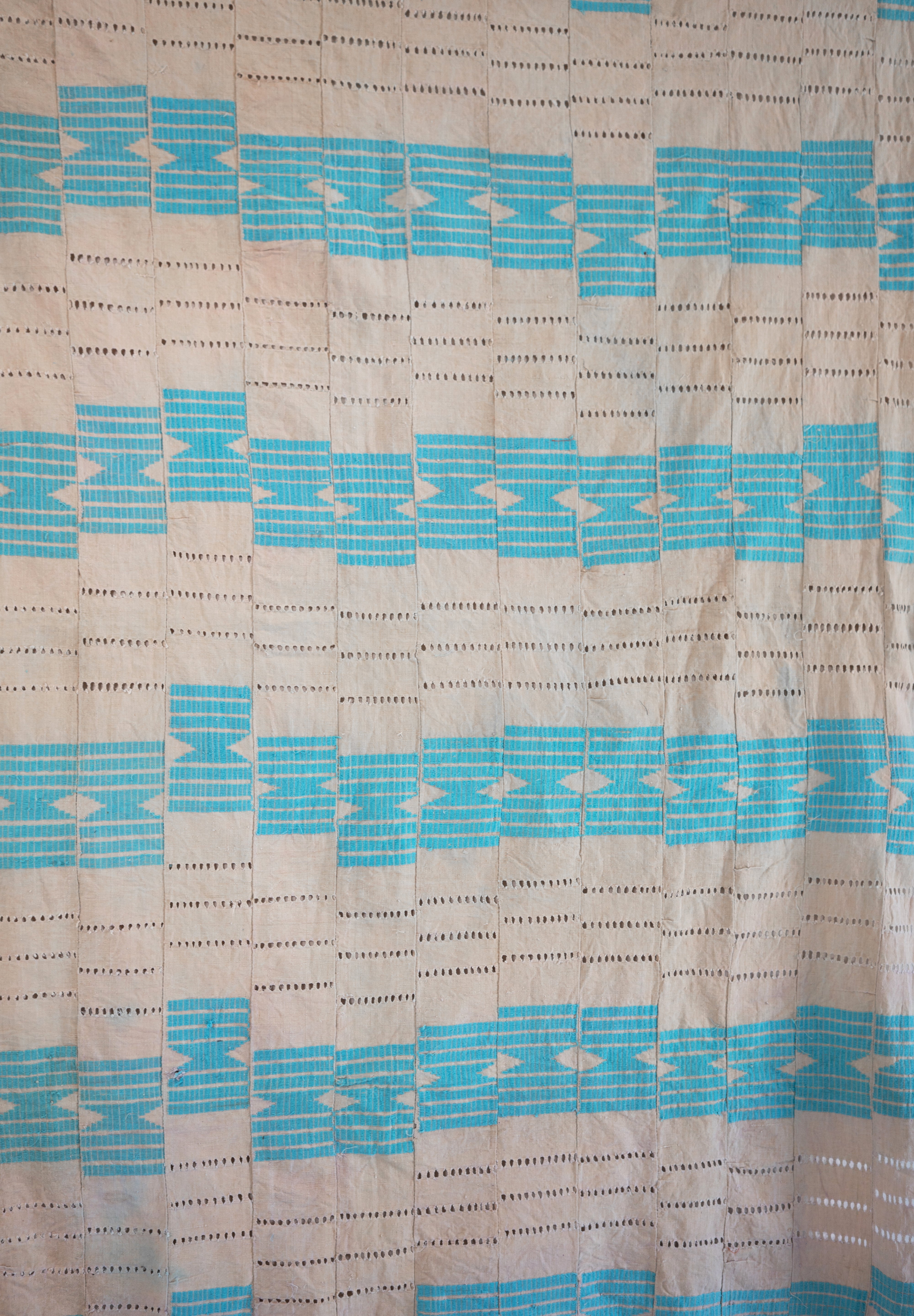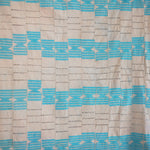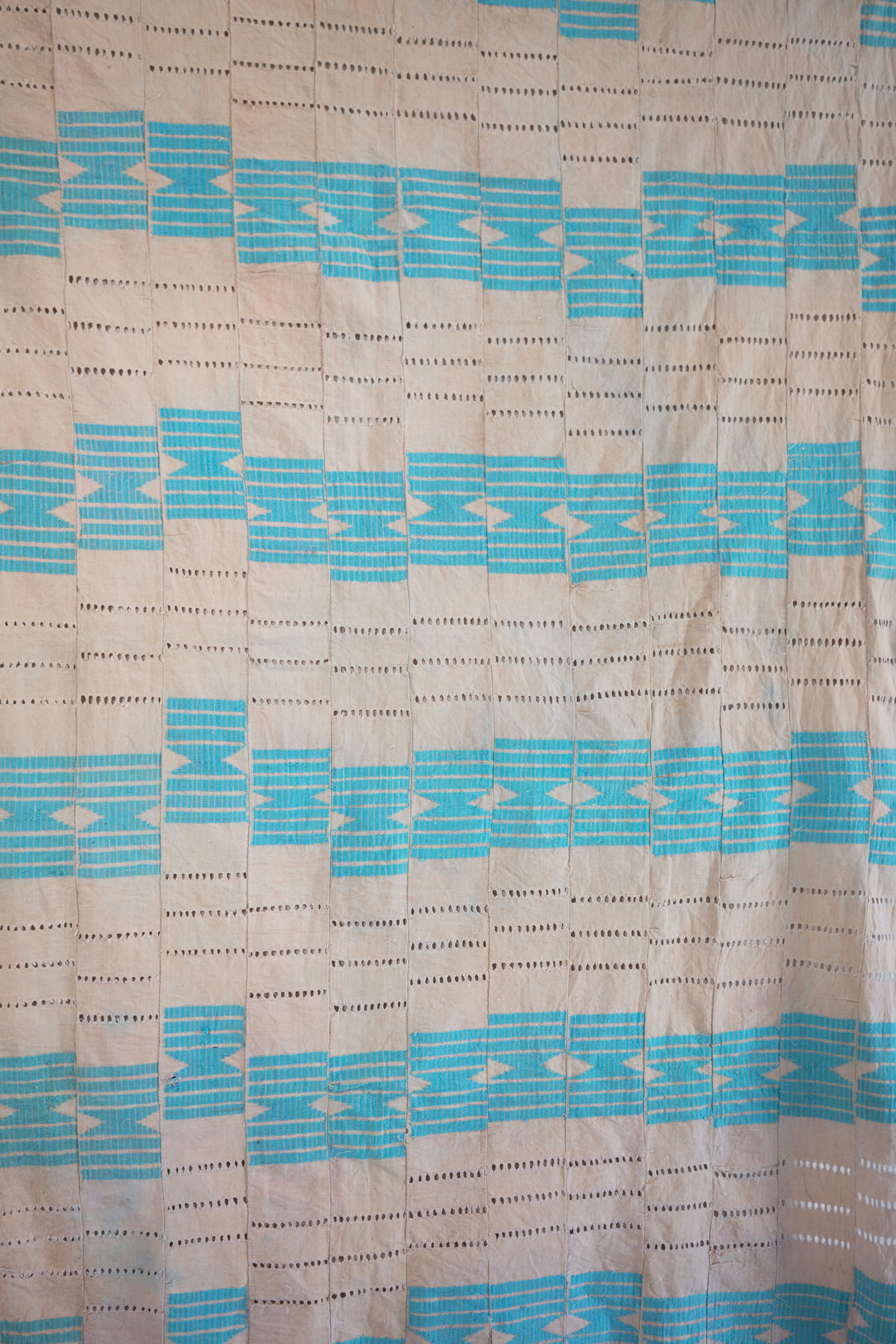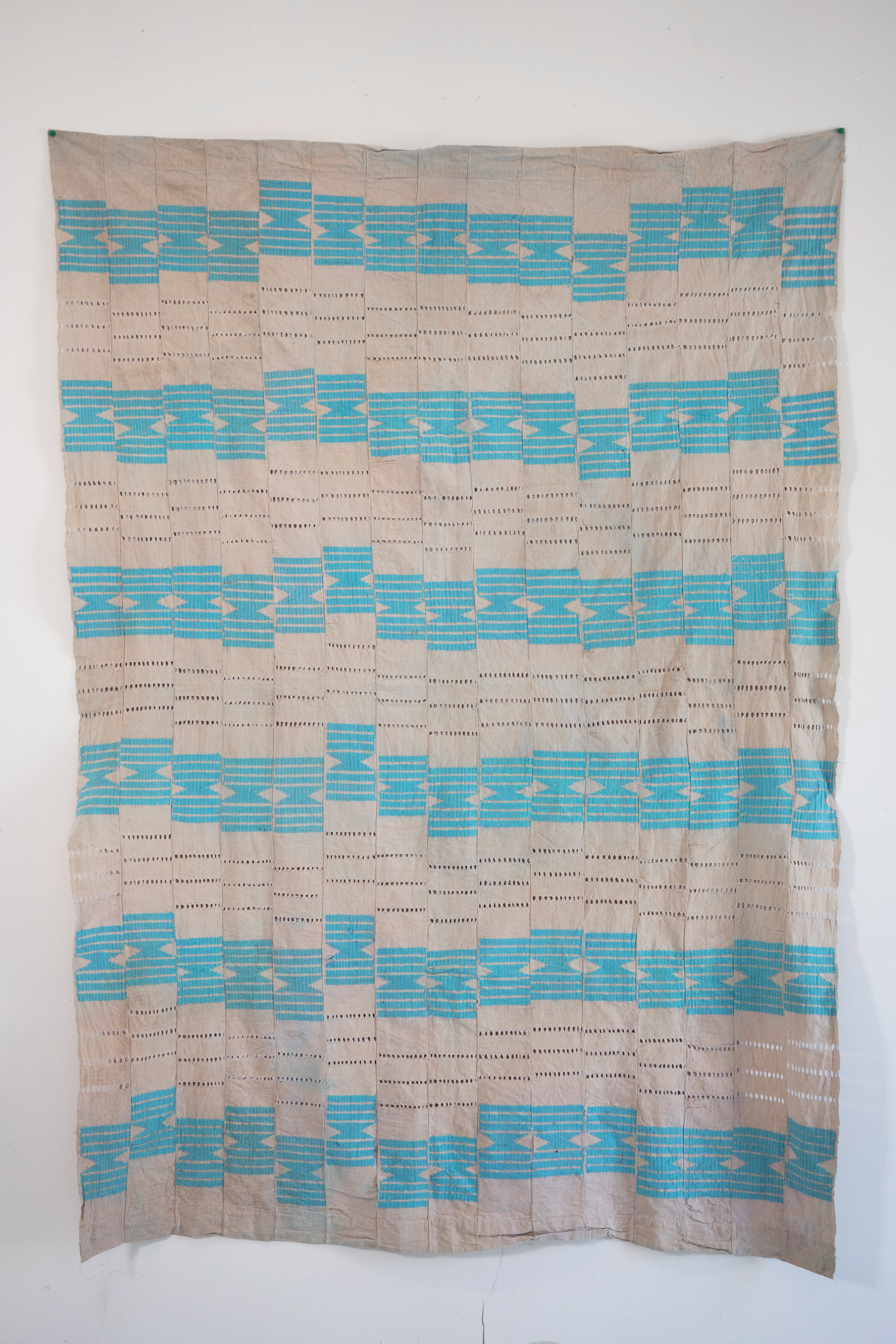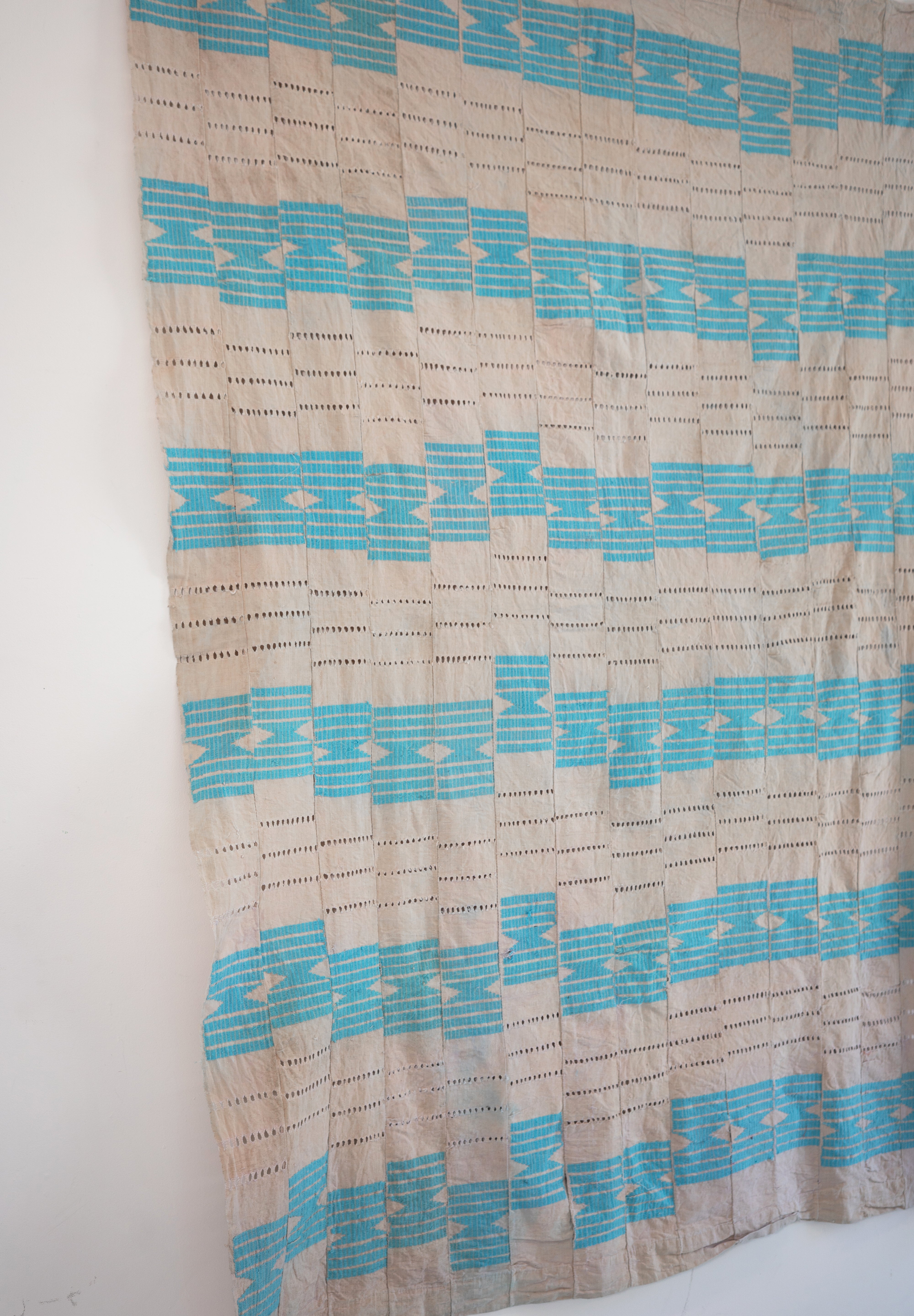 A beautiful example of a mid-century Yoruba aso oke cloth. Featuring a floating weft graphic pattern alternating with rows of openwork in ivory and aqua cotton thread. The surface threads are the product of a particularly slow and laborious hand weaving technique and are intended to be on the front of the cloth as a decorative effect but either side can face outwards.
