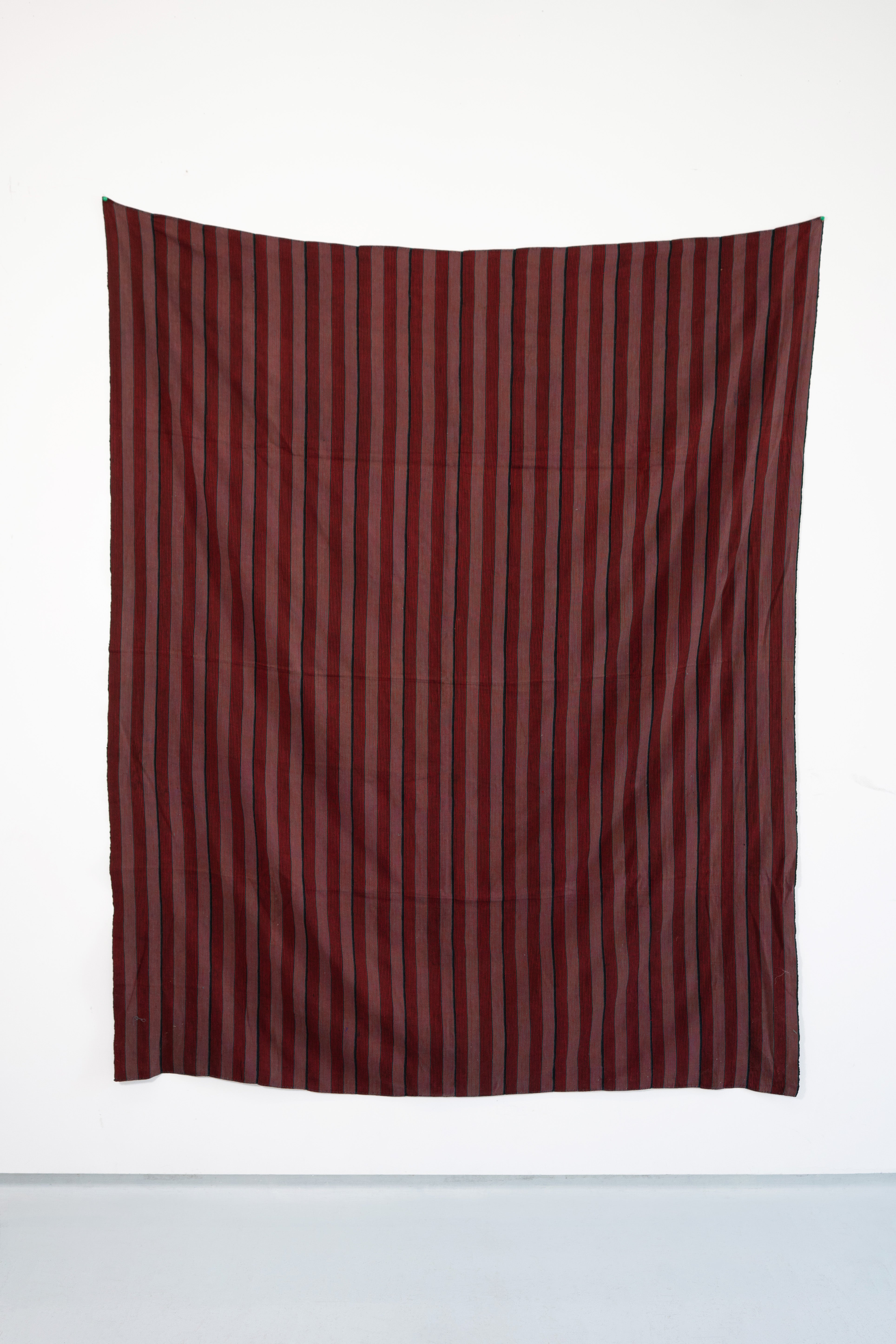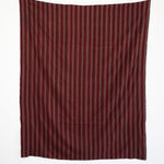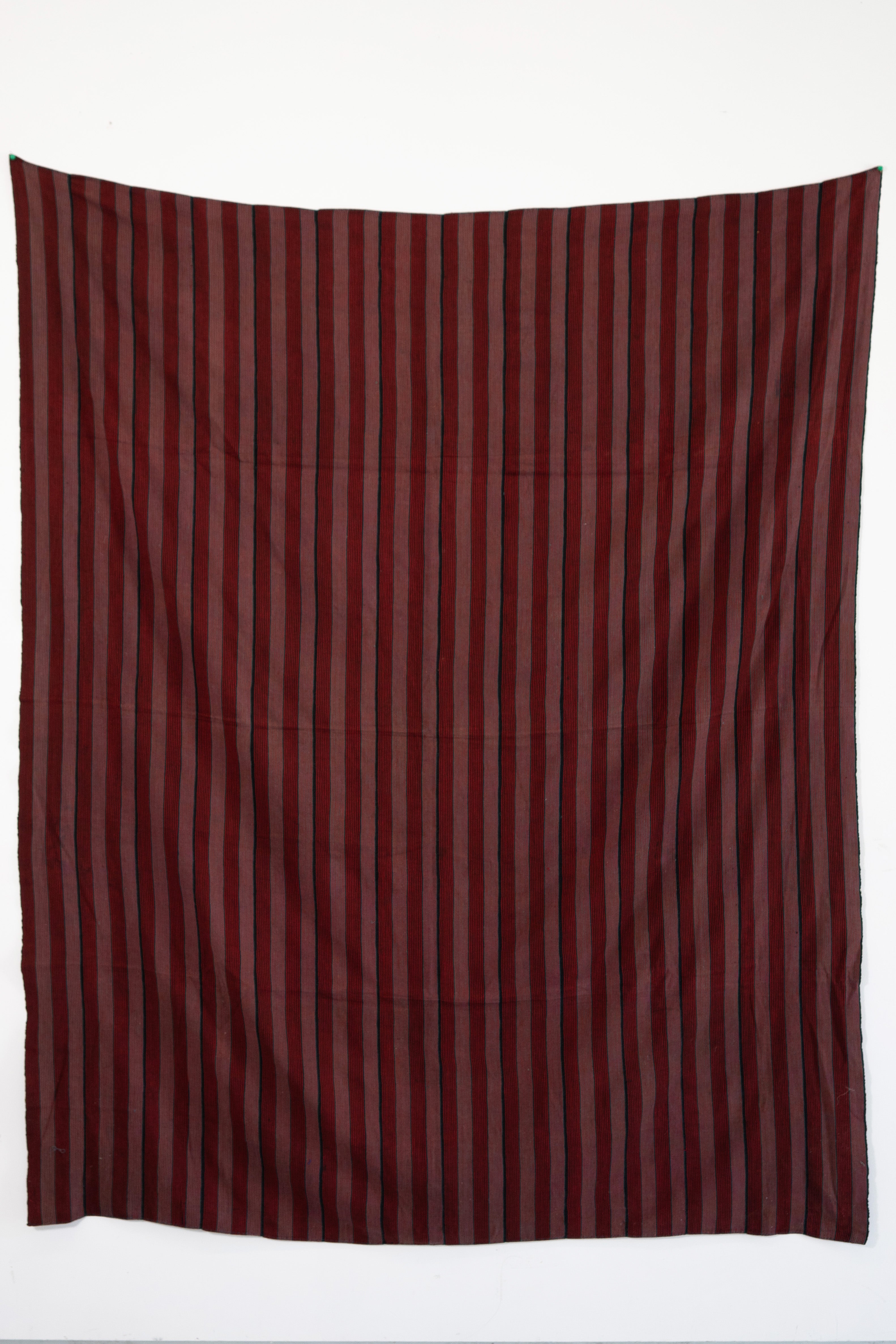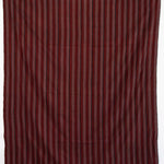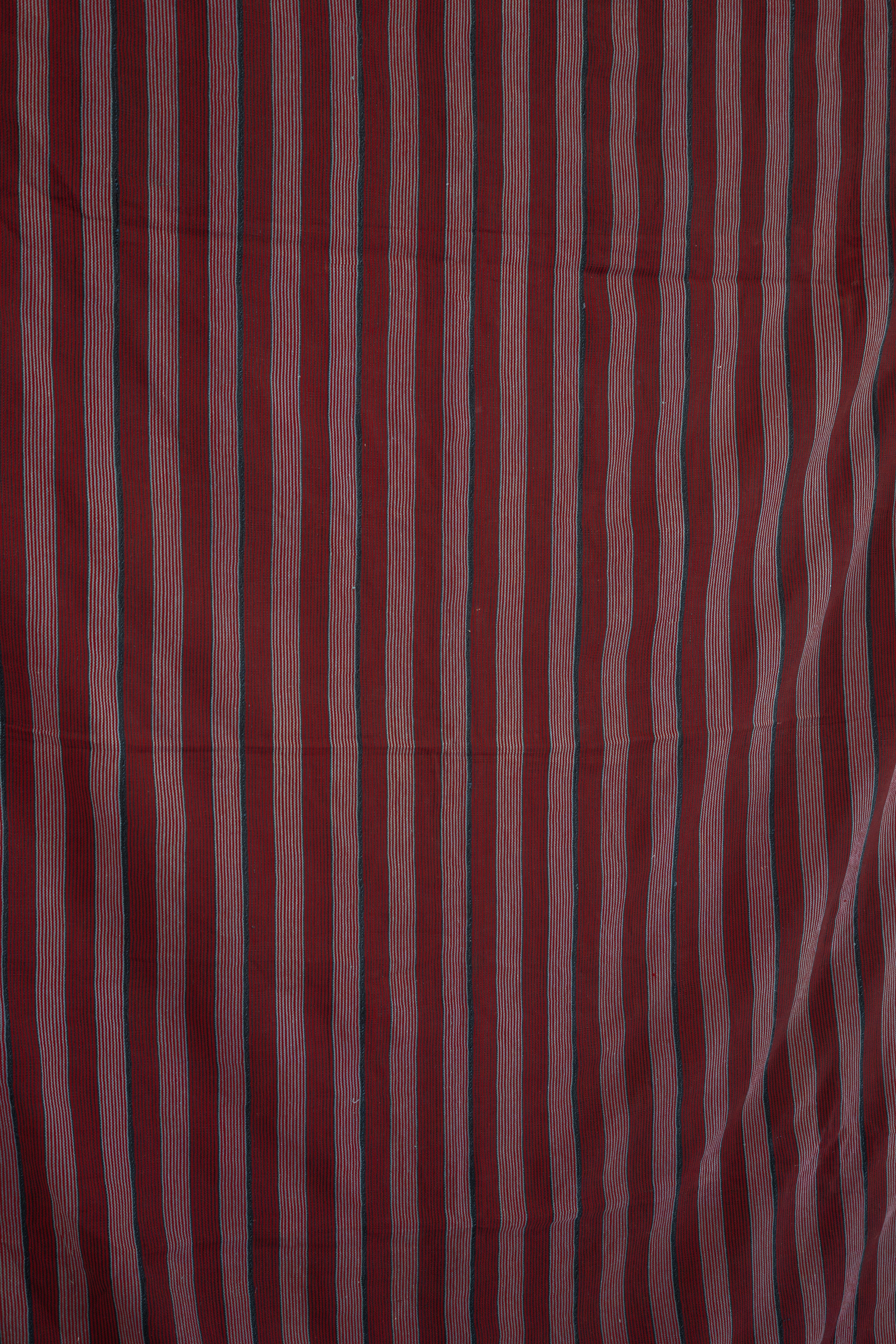 Handwoven striped cloth made of red pinstripes on alternating bands of white and black giving the impression of wide light and dark pink stripes from afar.