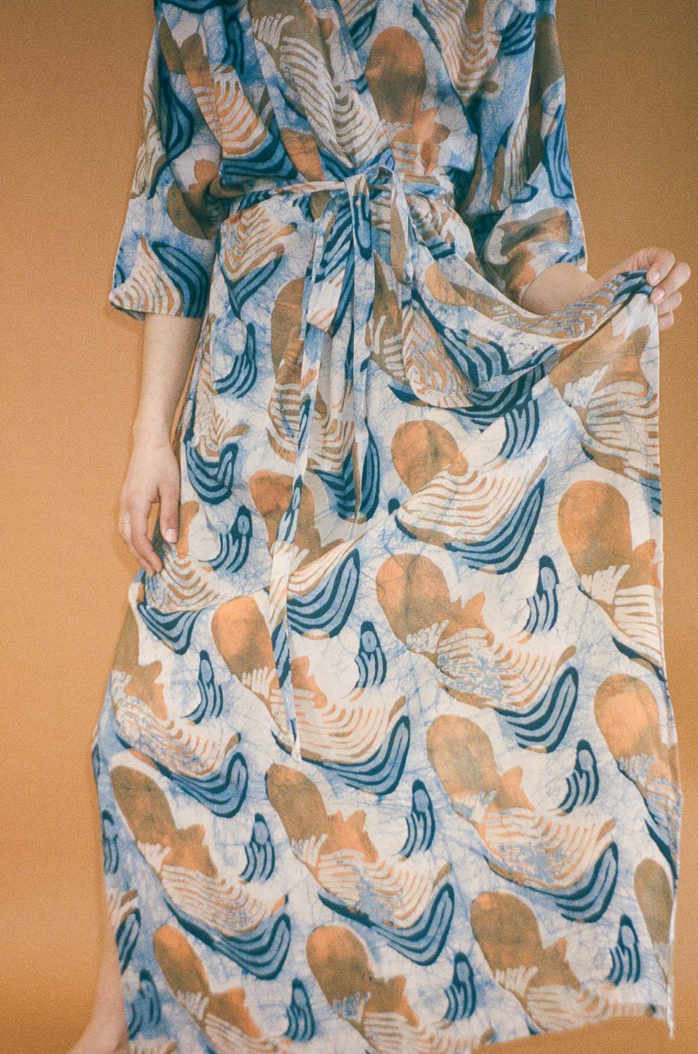 Long narrow wrap dress with mid length batwing sleeves and a deep v neckline. The Letsa Dress has soft pleats and a small cascade detail at the front waist, complimented by thick string ties that wrap around for closure. Features a side opening and slits on both ends for ease of wear without affecting the overall airy and dramatic look. Hand dyed for maximum theatricality in blue and orange hand batiked prints throughout.