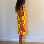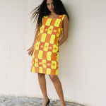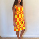Short sleeve dress with square neckline. Polite, schoolgirl length, or perhaps just a touch shorter. This dress is especially detailed, made from individually woven squares of bright orange and brilliant yellow hand woven cotton, stitched together at each corner. The sides of each square left open, not revealing much at all but creating an allure you have never experienced before.
