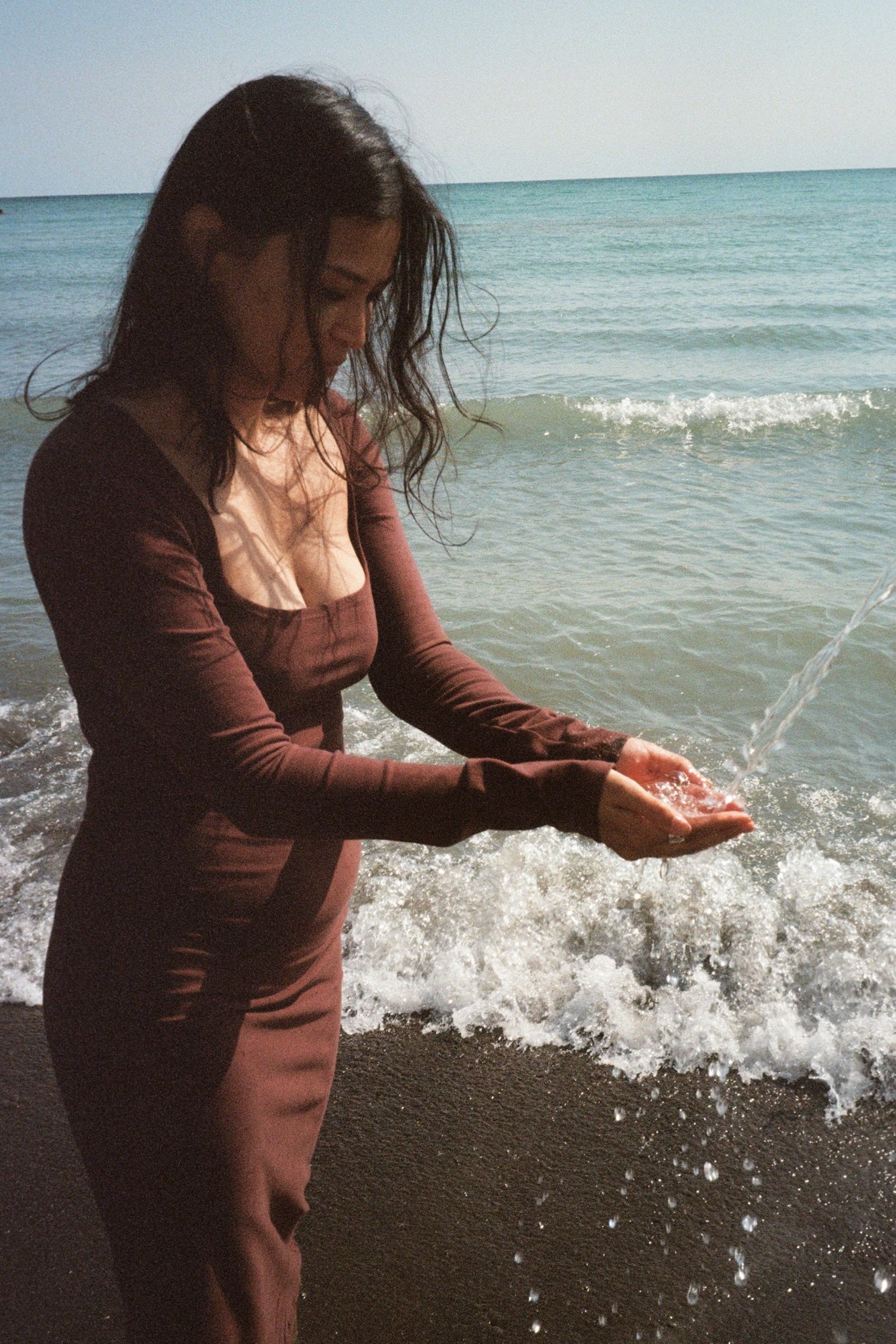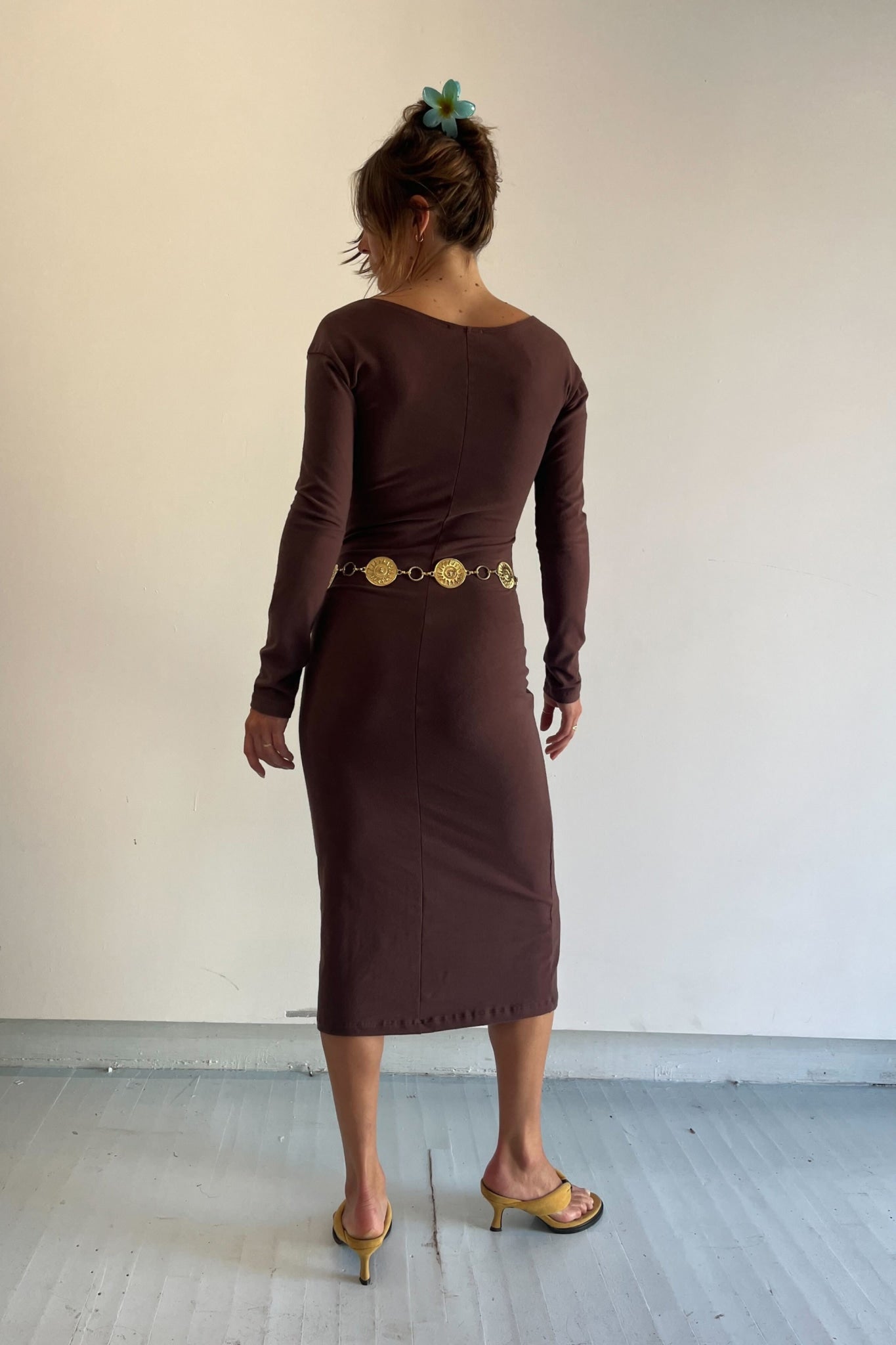 Long sleeve midi dress with signature Gil Rodriguez scooped neckline. Made up of a cotton spandex blend, this garment provides just enough stretch to mold to your body without feeling constricted, while still keeping the form-fitting silhouette in tact. This is a great foundational piece for any wardrobe, especially when you need to feel put together without sacrificing comfort. Featured in chocolate brown.