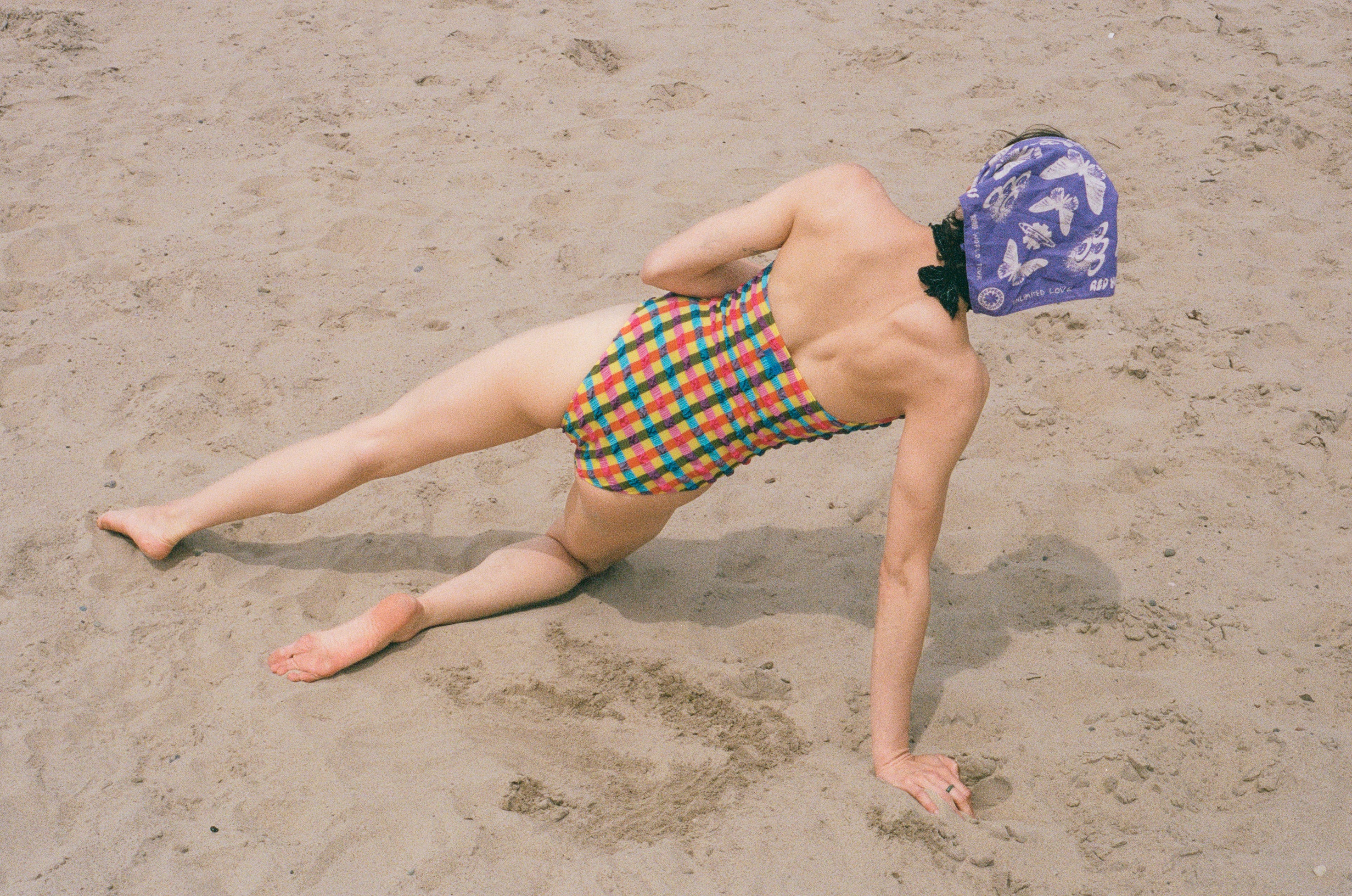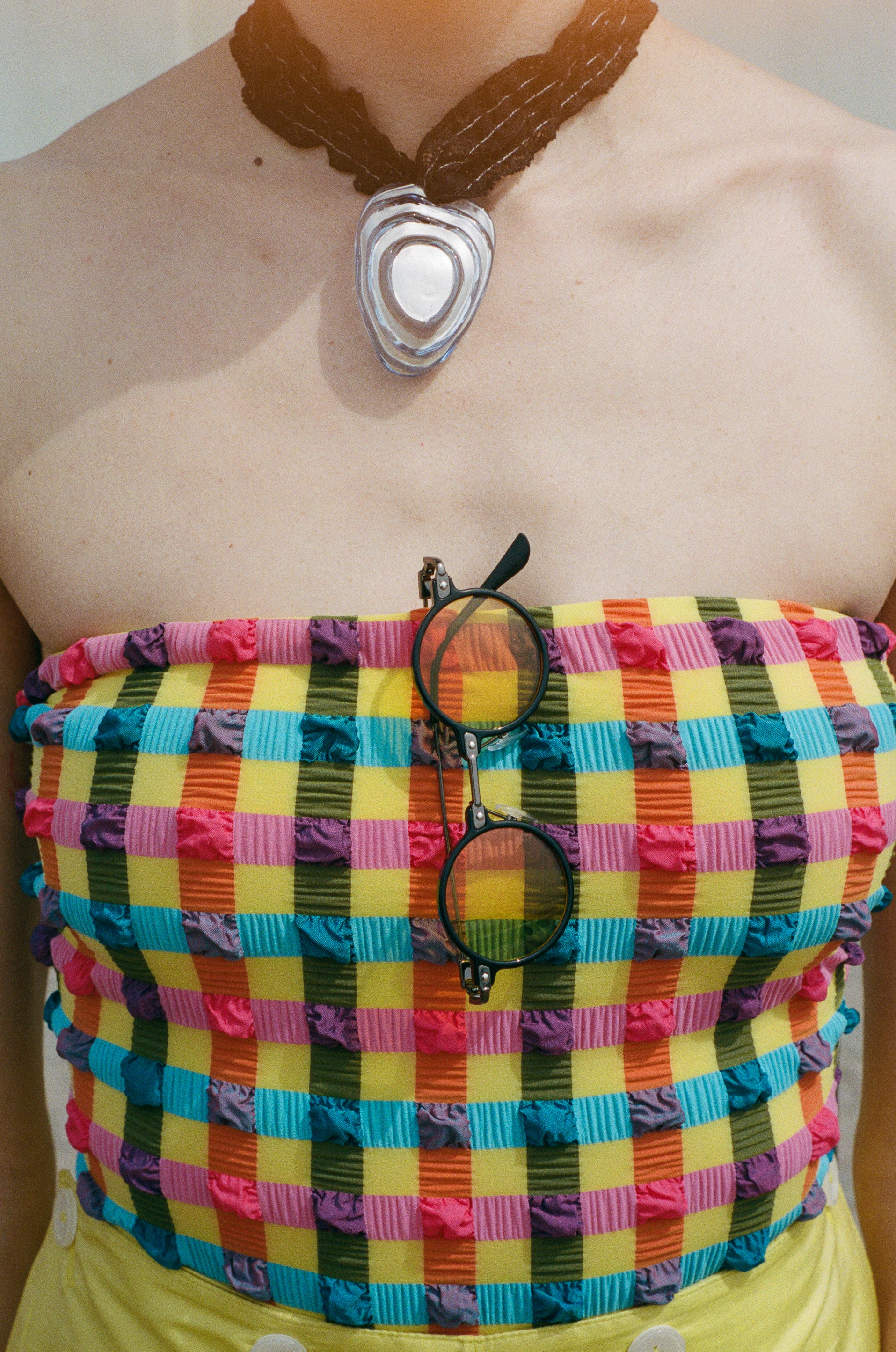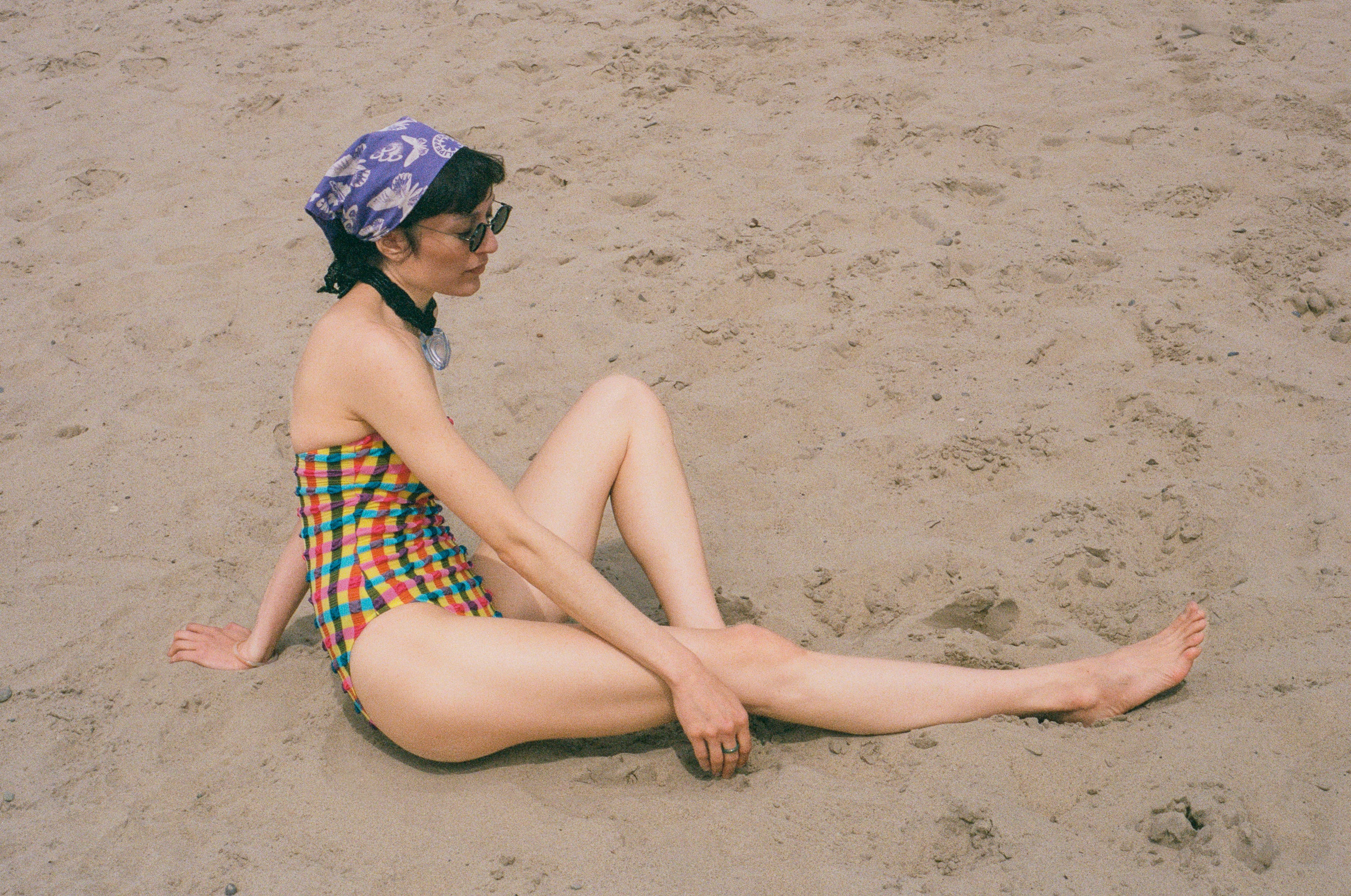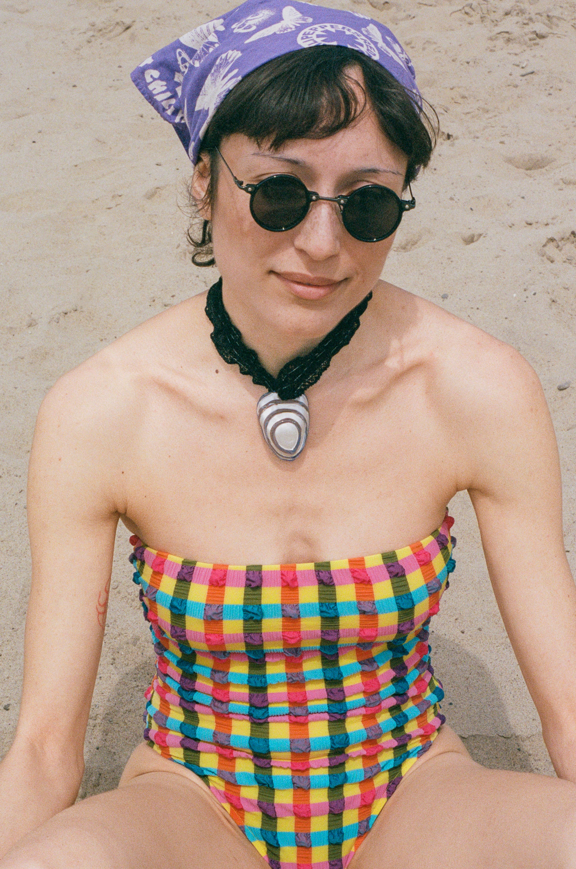 Bandeau full body swimsuit with a bra elastic band and high cut legs. Tastefully cheeky. Featured in yellow with pink/blue/green/orange plaid jacquard patterning and colour matched seersucker details throughout. 'Caro Luna' back standout label in blue. Sweet and psychedelic. UV protective, blocking the sun from your delicate skin with a long lasting performance, allowing you to glow with comfort.