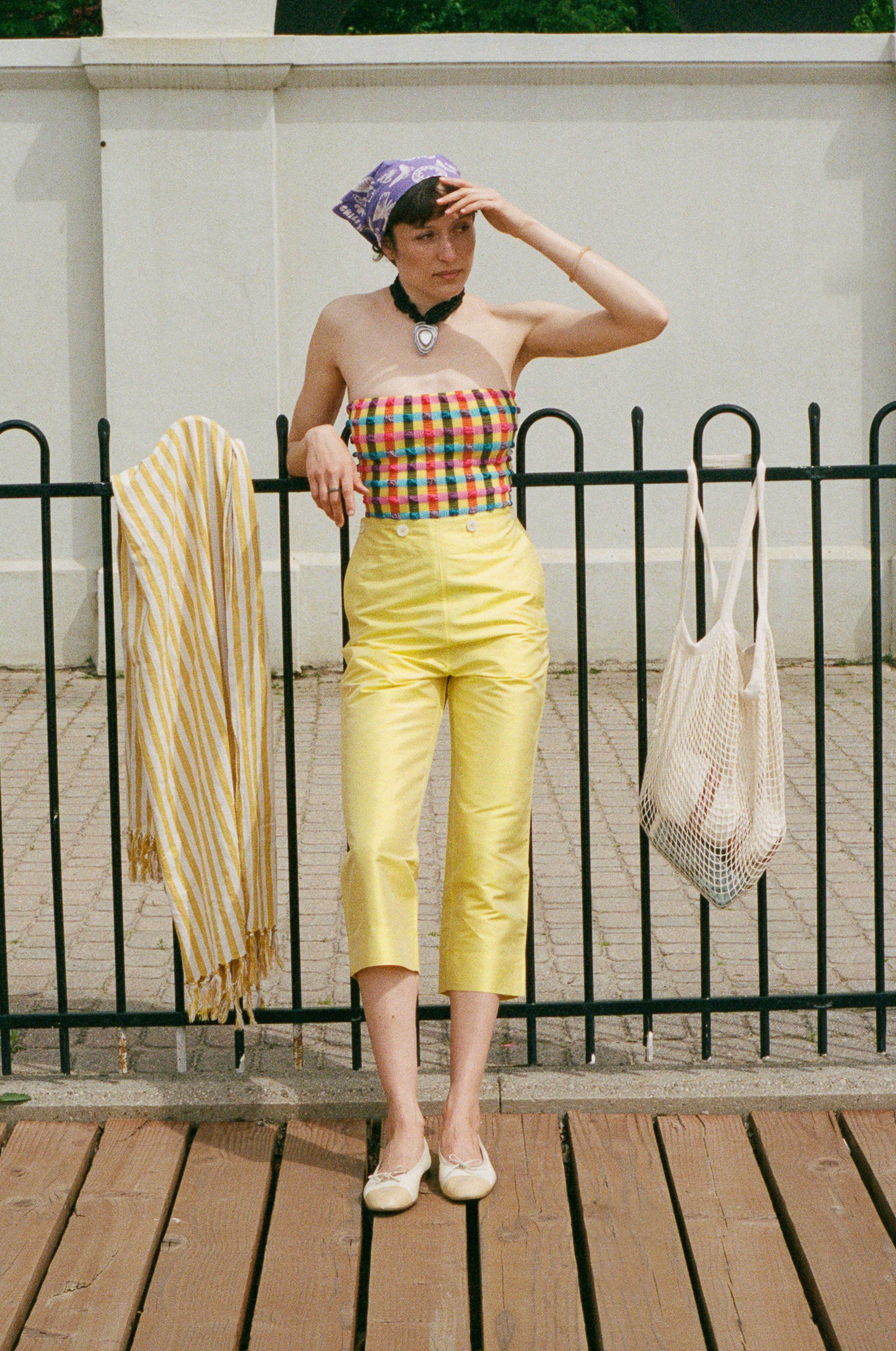 Izzy is 5'9 and a size small, and wears size small with the Pulo Glass Necklace in Ice and Francoise Pant in Yellow.