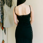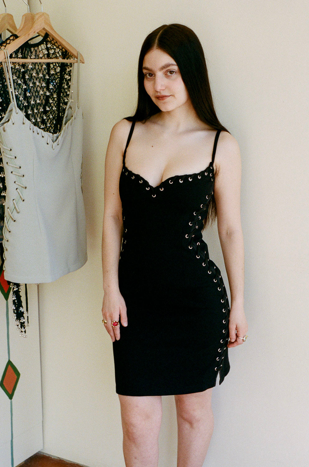 Fitted spaghetti strap mini dress with a sculpted heart neckline designed to flatter the form, made from recycled bonded fabric that has a slight stretch to comfortably hug your body. A modern take on Paris Georgia's best selling style with eyelet detailing around the neckline and sides, and contrast tonal satin binding. A contemporary classic. Back zip and hook closure. Featured in black.