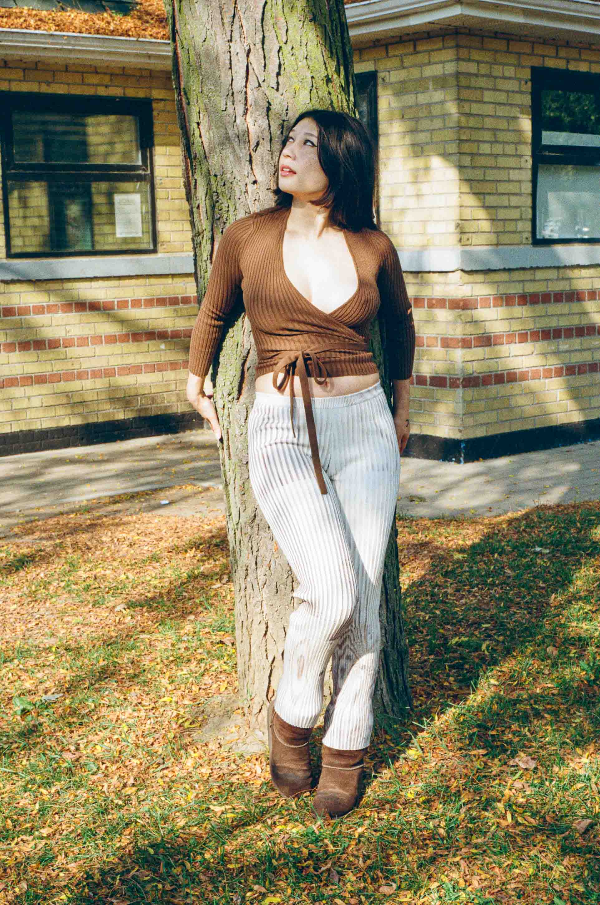 Jenny is 5'2 with a 28" waist, and wears size small with the Nonna Ballet Wrap in Mud.