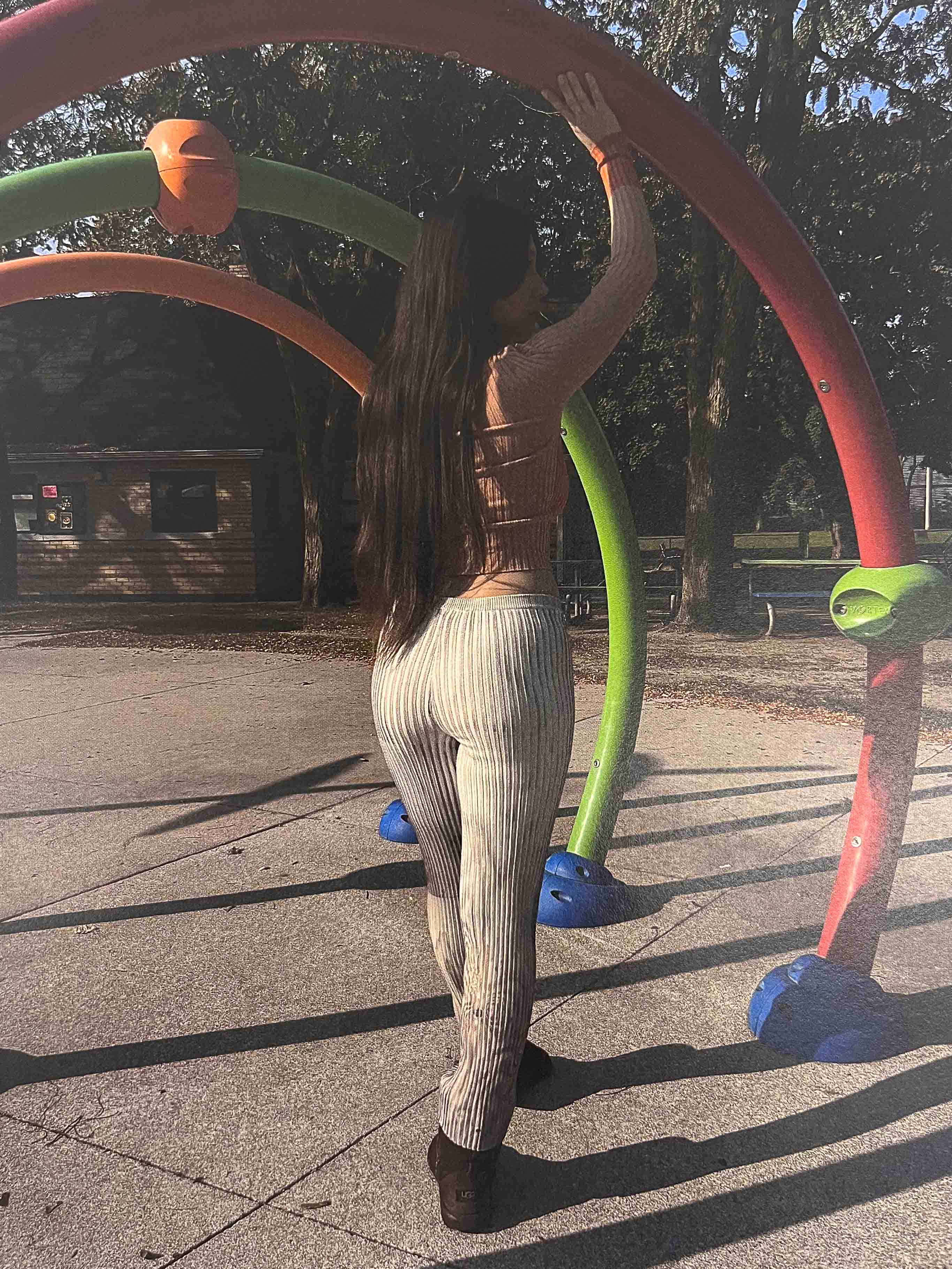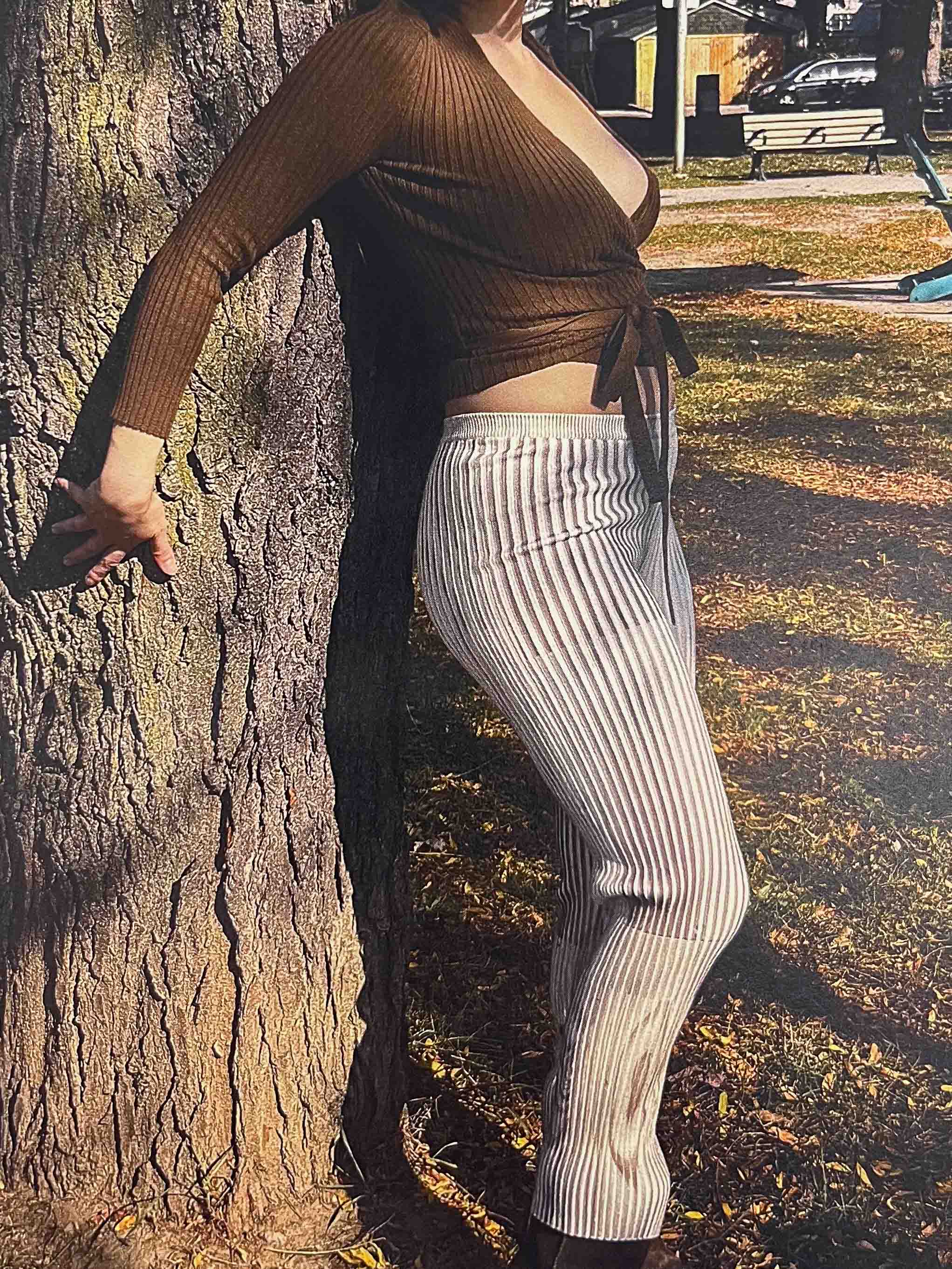 Cropped stretch pants with a high waist and straight leg fit in white with brown/purple trees and spirited swirls throughout. Features a deep rib that comfortably conforms to your body. This piece will mold over your form and stretch to fit exactly your shape while hugging you tightly.