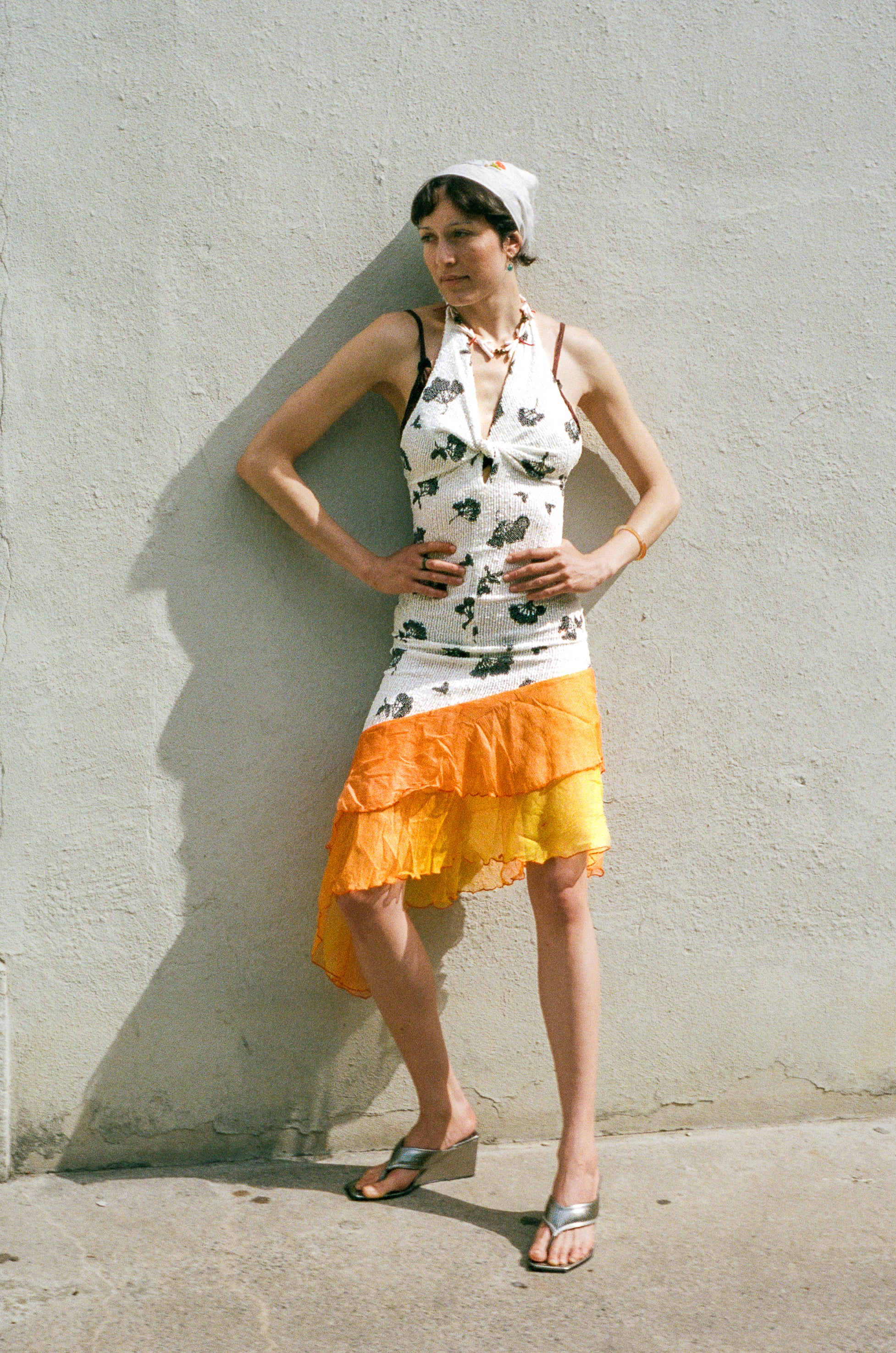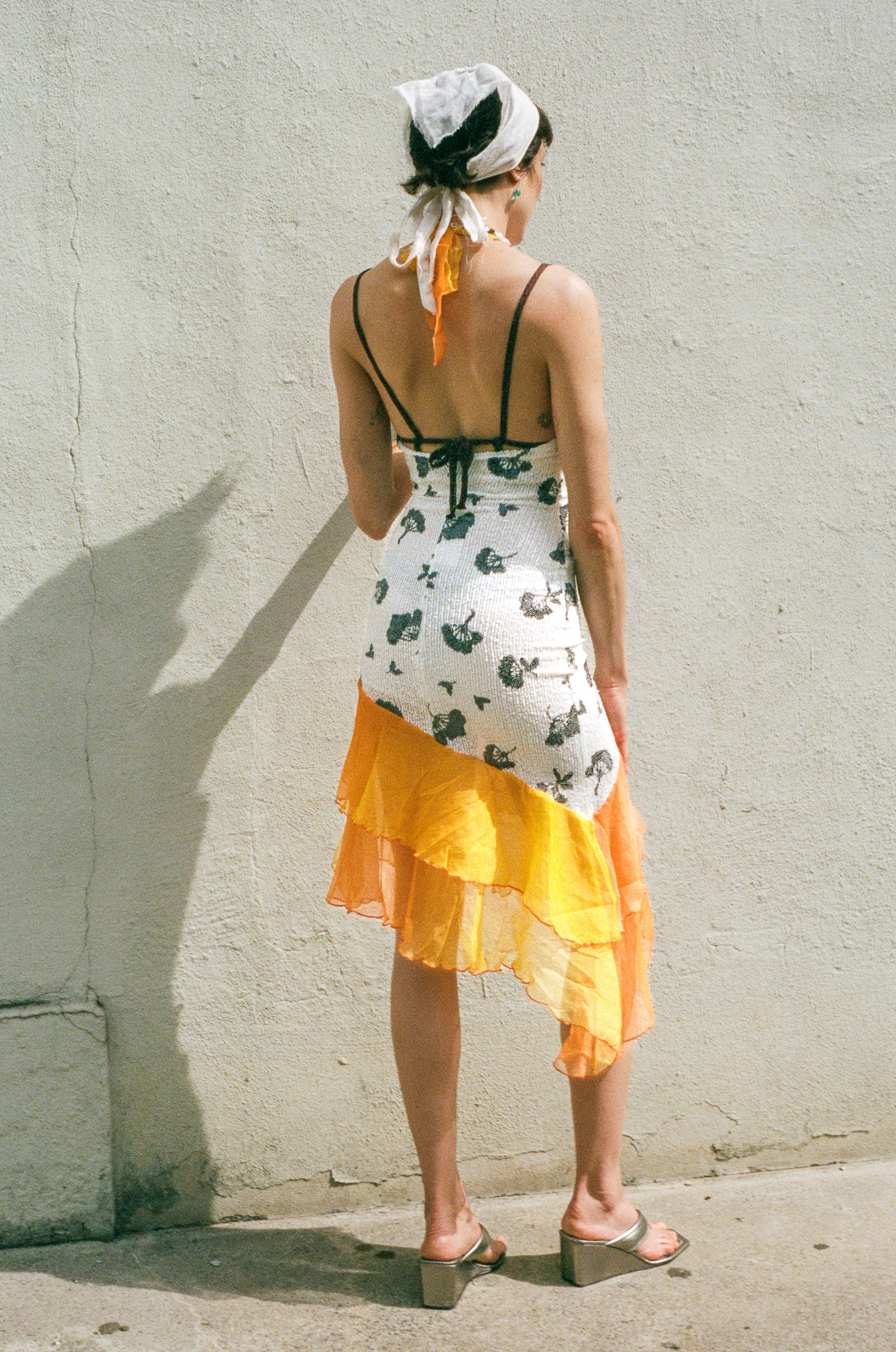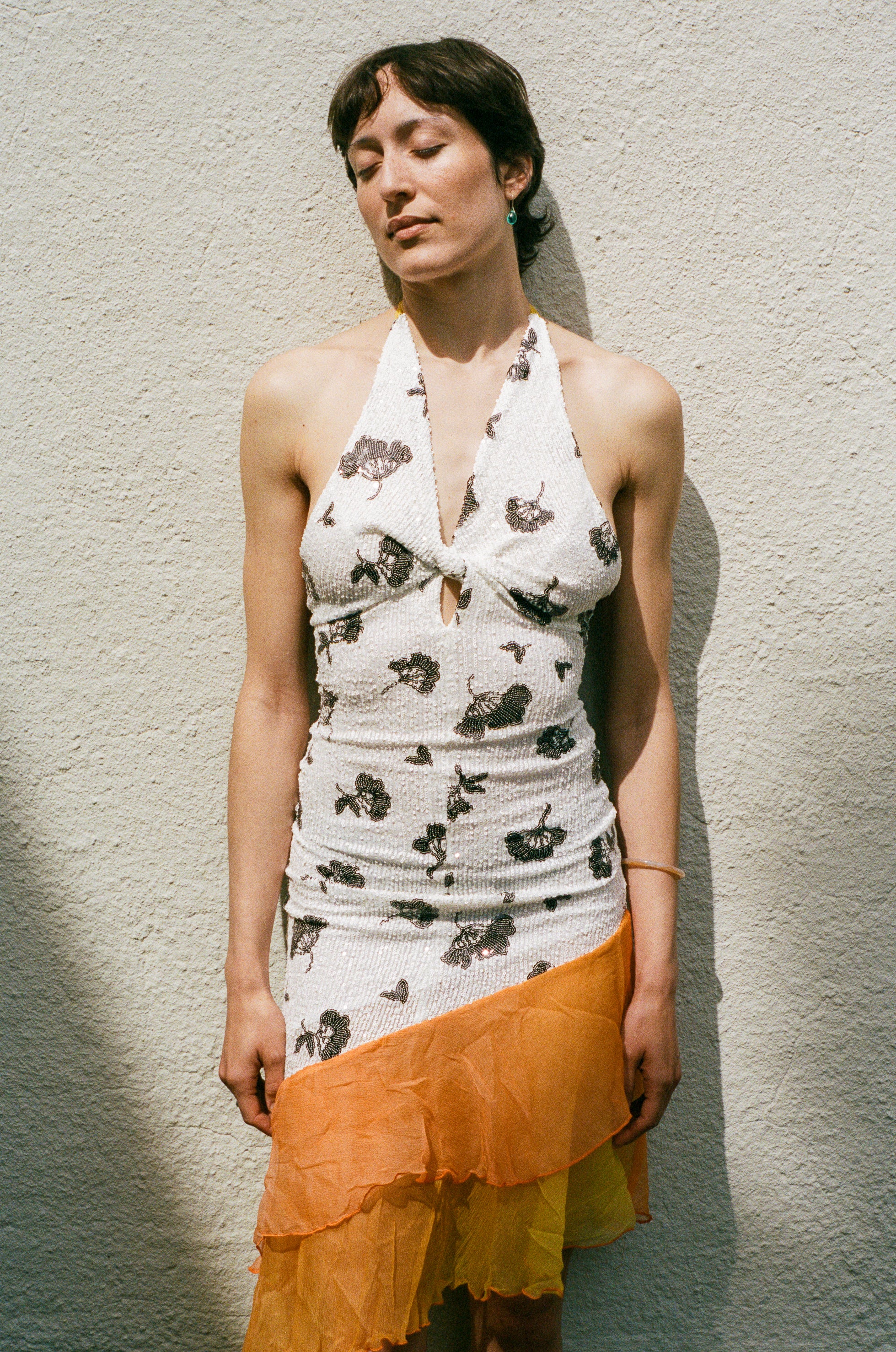 Elasticated form fitting sequin halter midi dress with a knot in the center of the deep neck and peekaboo keyhole cut out below the chest. Slip on style with a stretchy white slip underneath for modesty. Featured in white with black fans throughout and contrast orange silk ruffled bottom hem, asymmetrical in length. Fun and flirty, this dress is sure to turn heads and hearts with every wear.