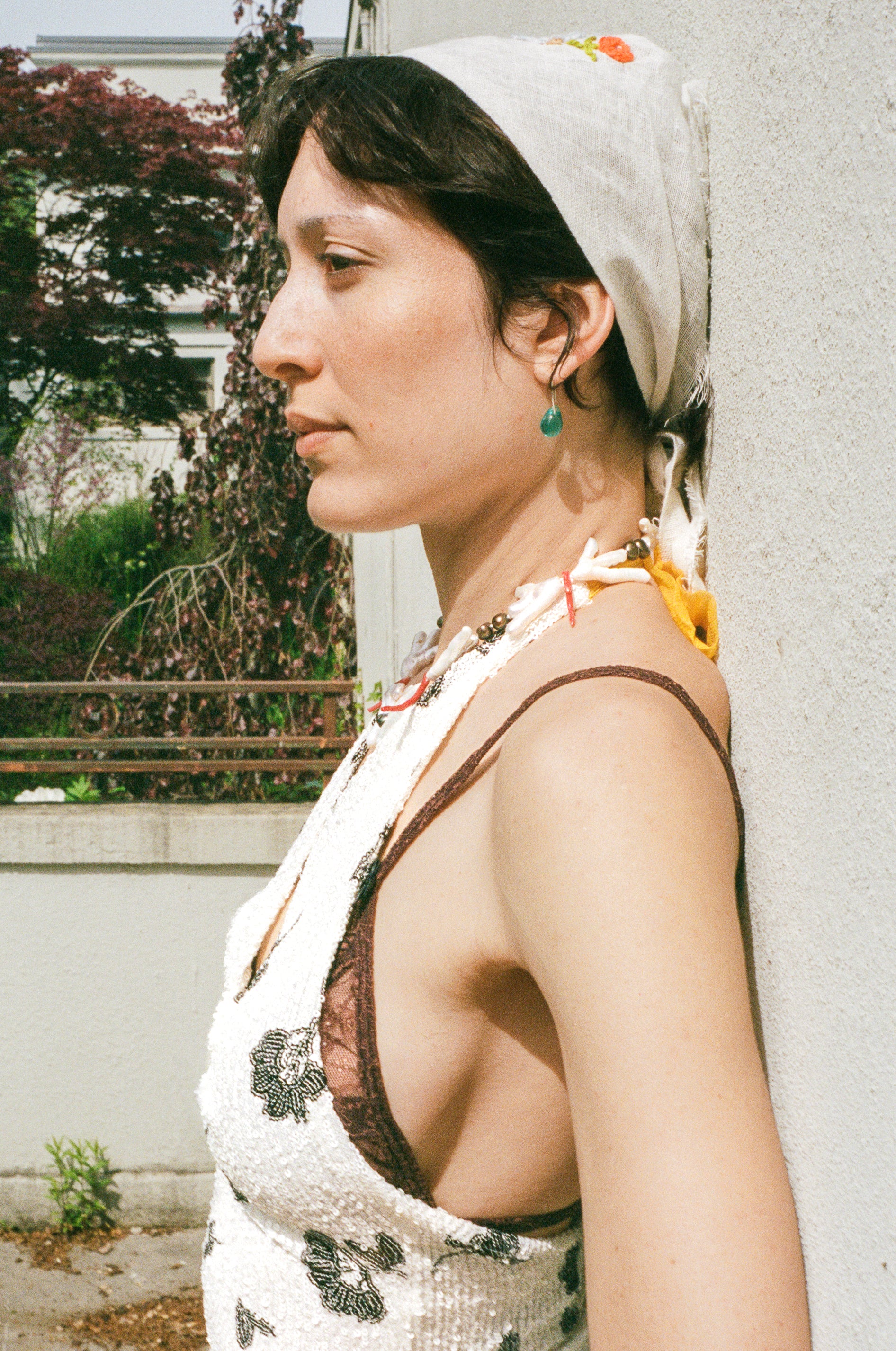 Izzy is 5'9 and a size small, and wears size small with the Dion Halter Bra in Brown Lace with Bows and Gota Mini Earrings in Aqua.