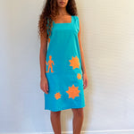 Hand appliquéd sleeveless shift dress with square neckline. Polite, schoolgirl length, or perhaps just a touch shorter. Features thick straps and large square-cut arm holes. Darting across the bust adds shape while keeping the poster dress look of the 60's. Button closure at back.