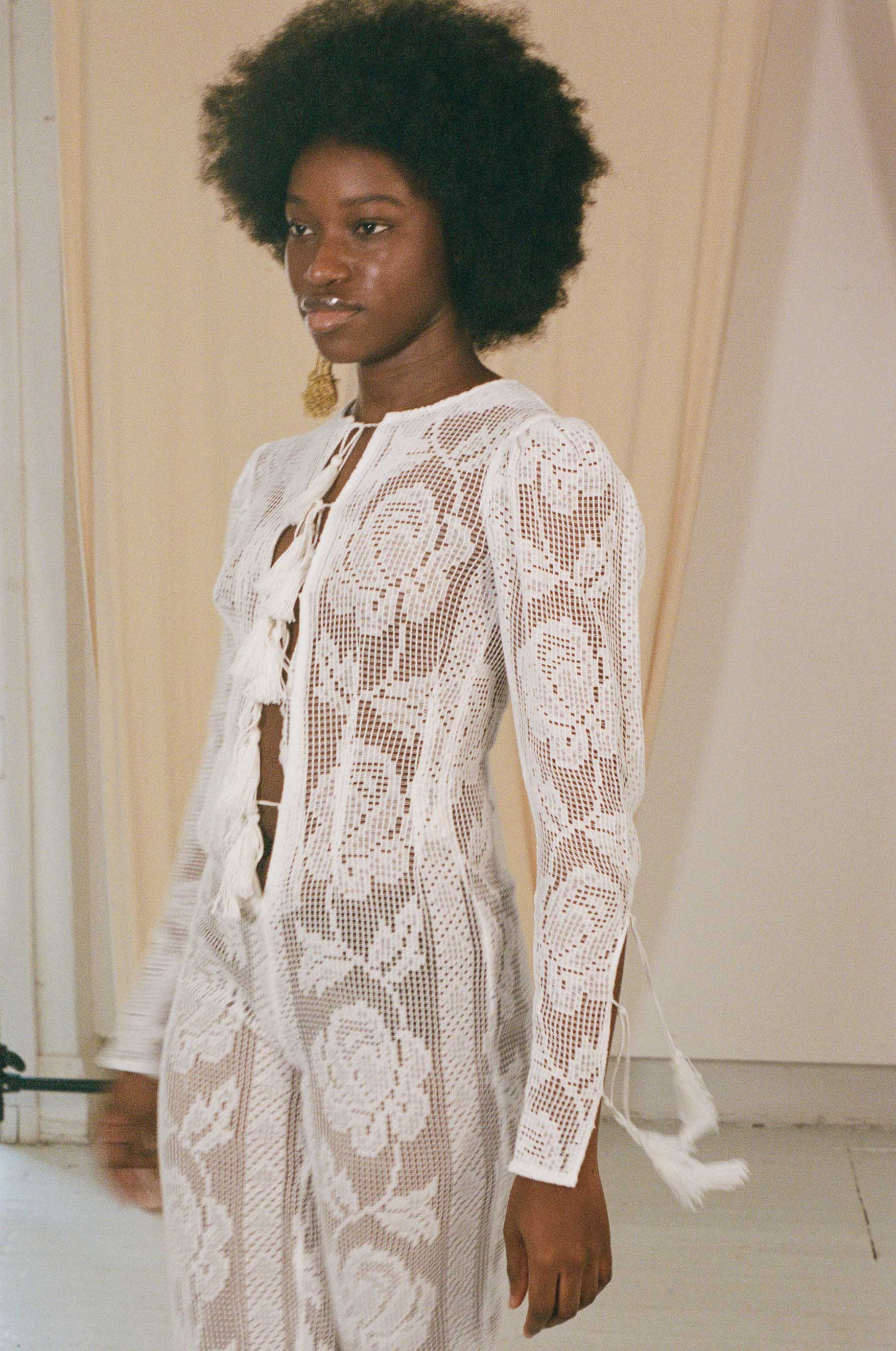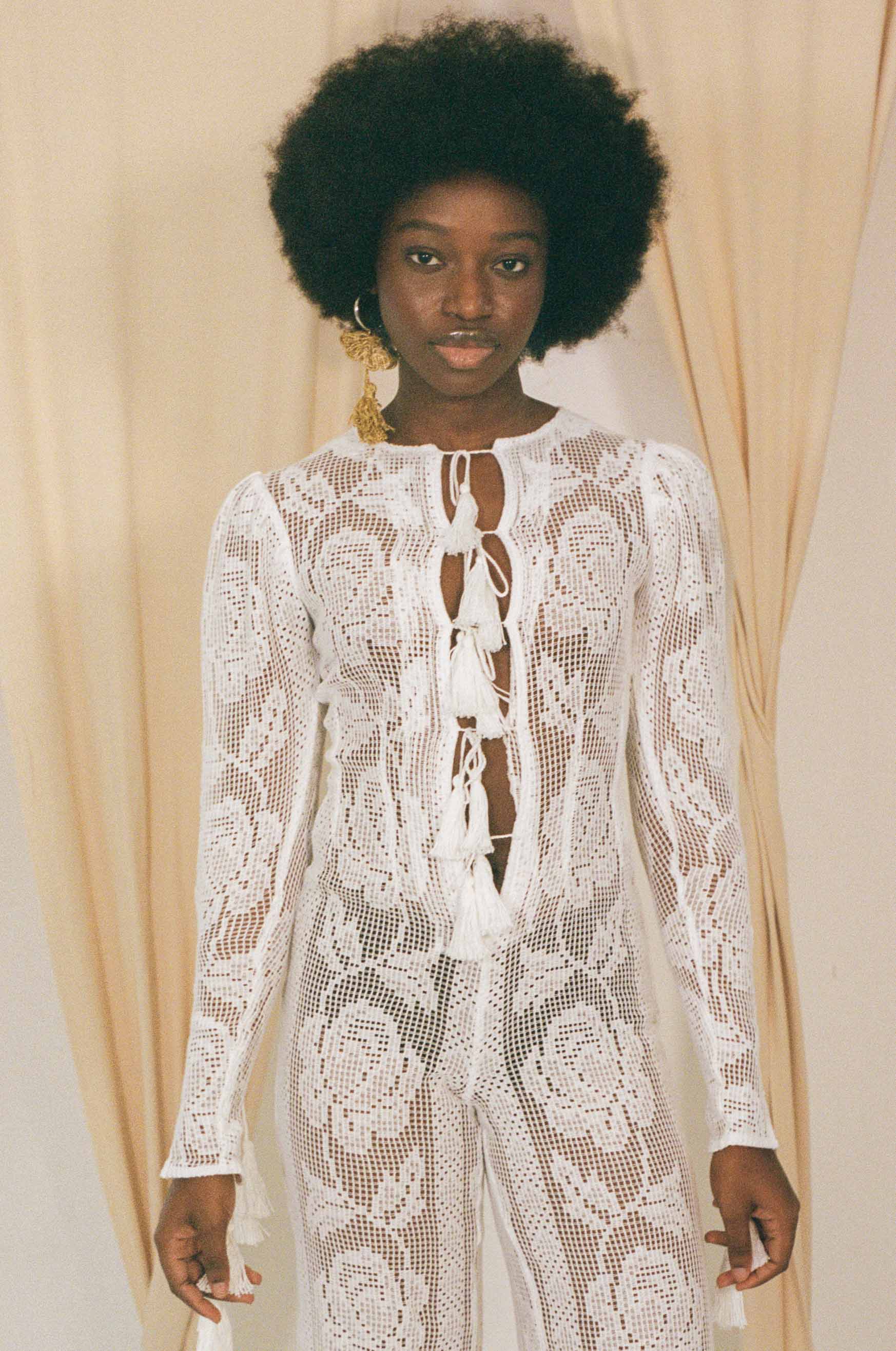 Full length jumpsuit with mutton long sleeves and long straight legs. Opening at the front, this garment is adorned with tassel details from the chest closure to sleeve closure. Slip on and show out, a true work of art from head to toe. Featured in white crochet cotton.
