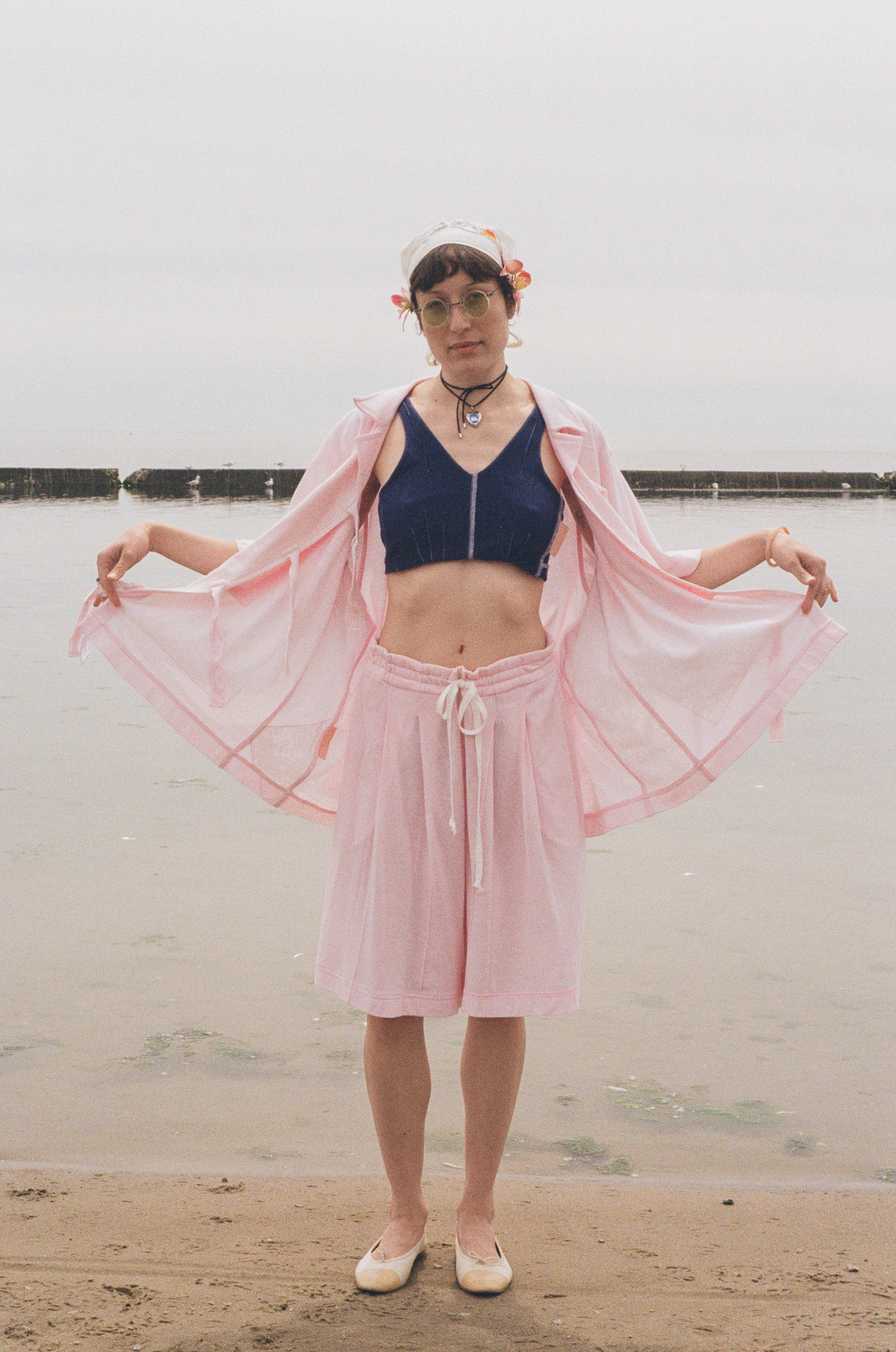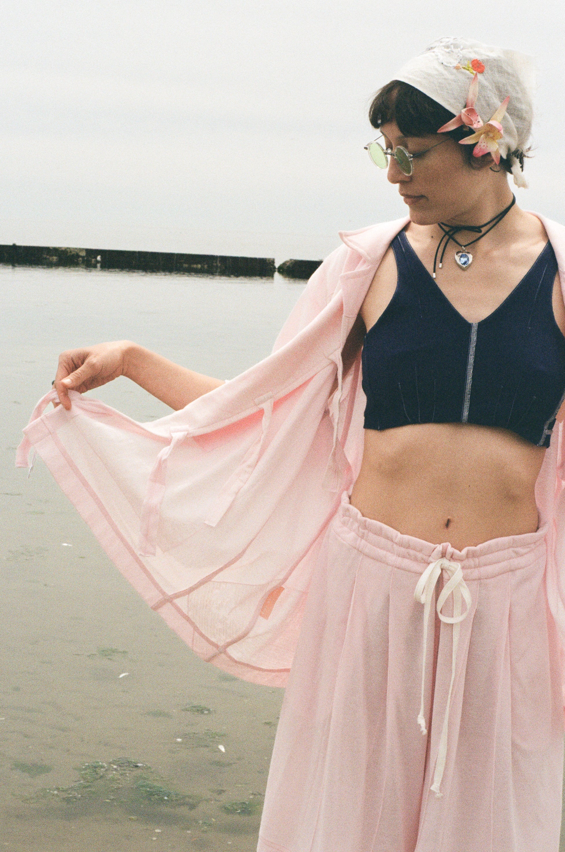 Unisex cropped sleeveless top with an open back and adjustable ties. Delicate tucks along the front and decorate exposed seams. Made from a soft and lightweight cotton pique in navy, reversible inside out and back or front.
