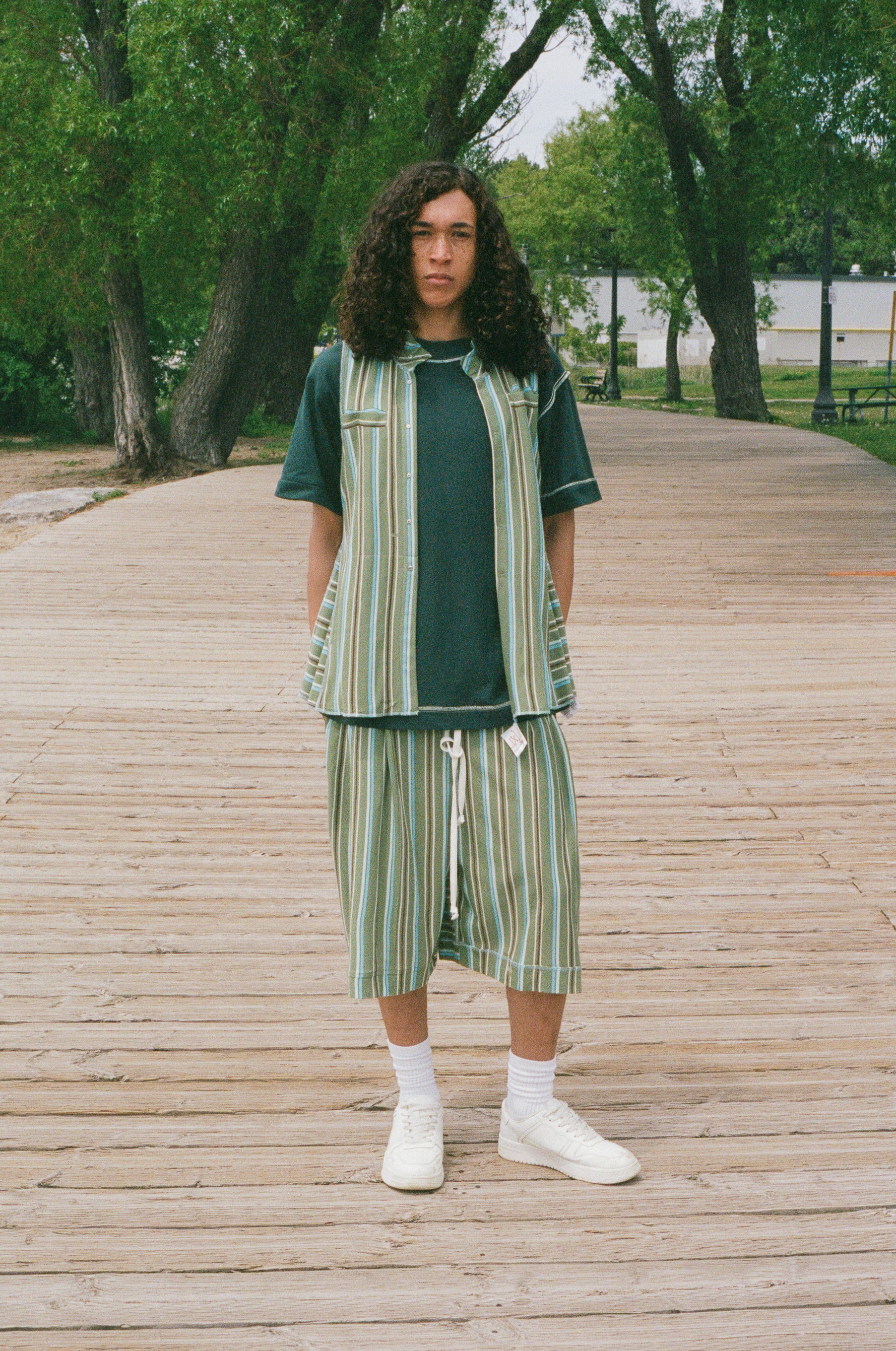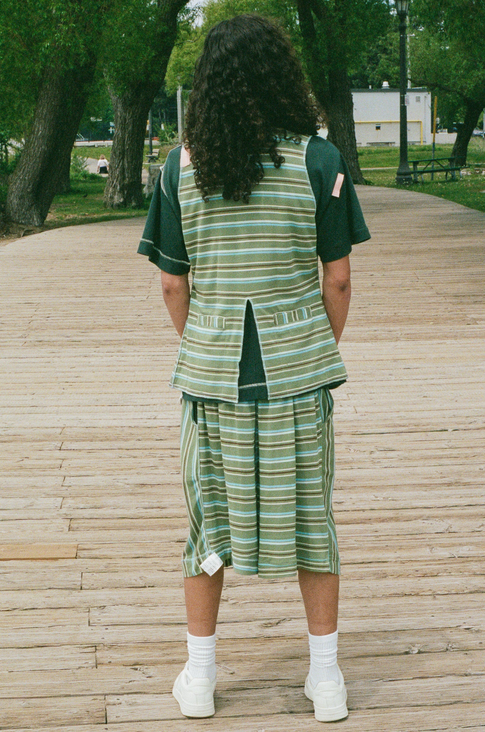 A sando and vest hybrid that can be worn over or under your garment with a generous concealed 6 pockets. Sleeveless with side snap and extendable panels to cinch or relax the fit, and a center opening to either close or leave it be. Featured in matcha green, baby blue, white, and brown vertical stripes, reversible inside out and back or front.