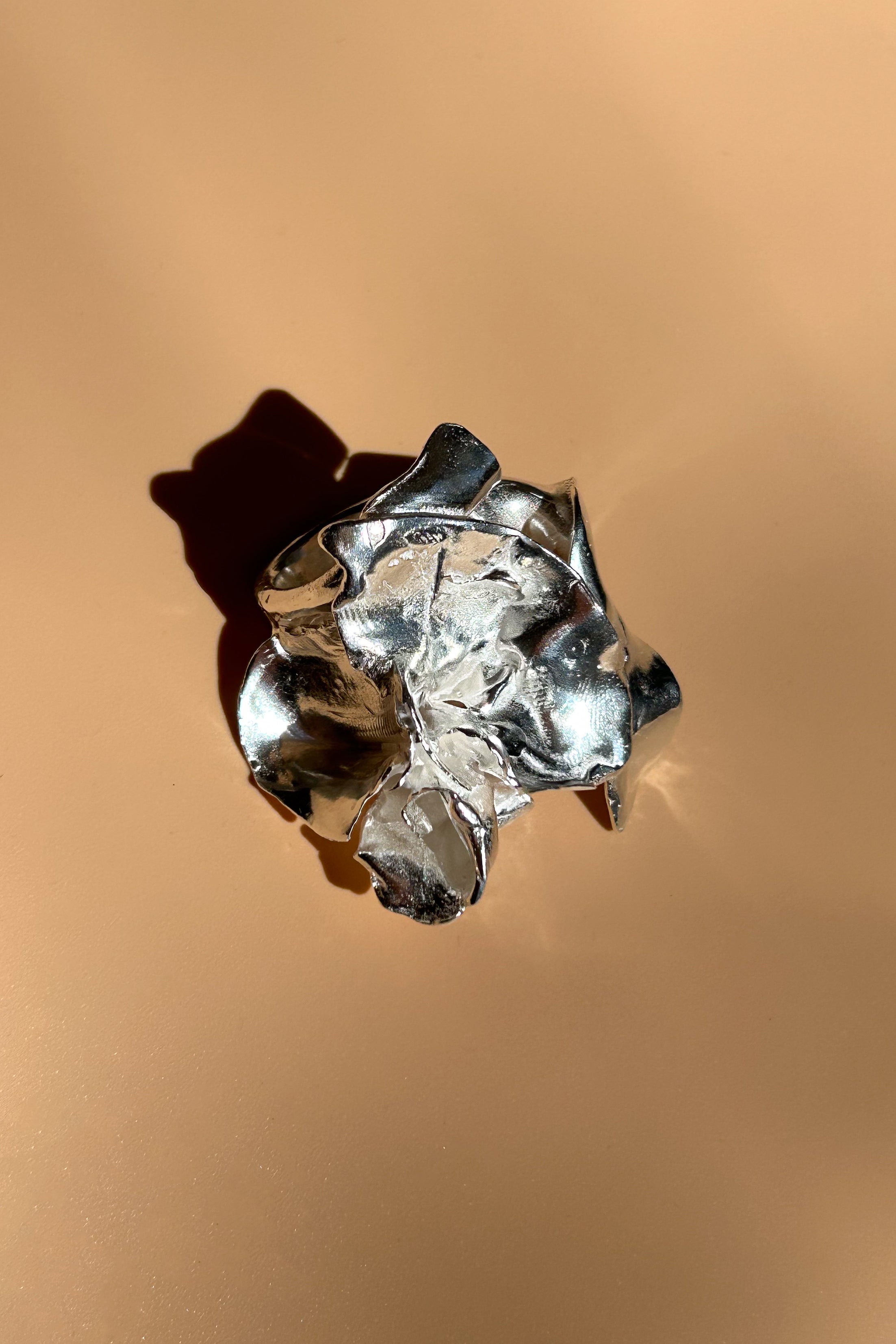 925 recycled sterling silver ring with exceptional hand made details throughout, in a large sculptural yet floral design. The Moura Ring will make you feel the movement within the mold every wear, adorning your hand as the heart of it all.