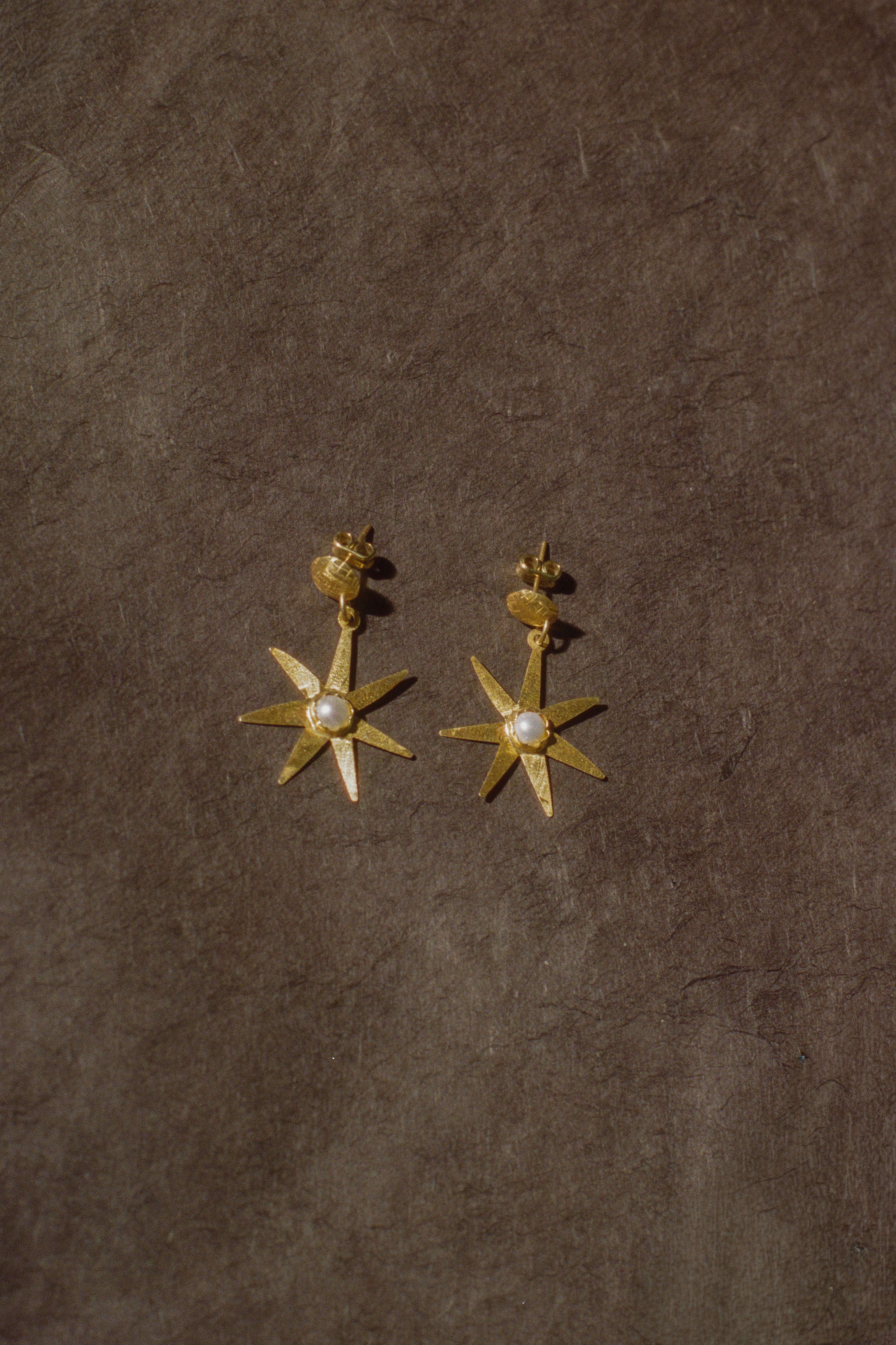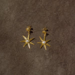 Pair of gold circular stud earrings with flower/star shaped pendants hanging down, and a hammered in pearl at the center of the shape. Post back closure. Designed by Après Ski and made by craftsmen who work gold-plated silver by hand in a traditional way.