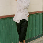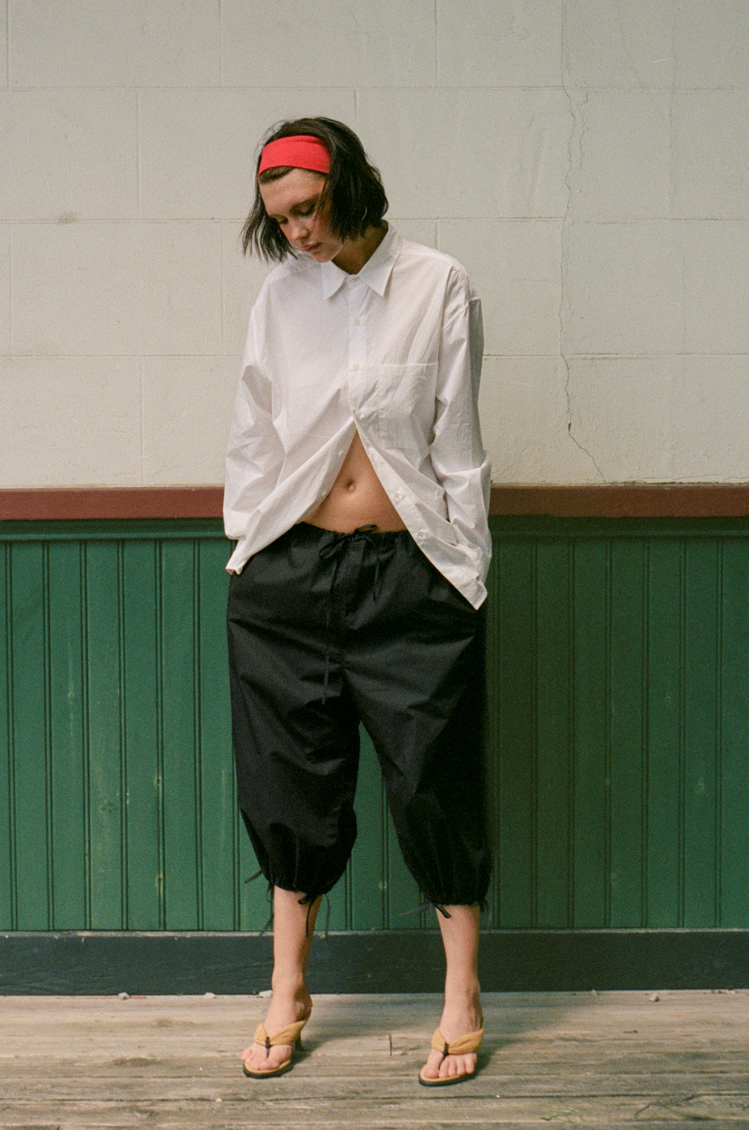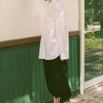 Oversized unisex long sleeve button up with a collar, dropped shoulder, front pocket, and easy yet elegant silhouette. Your new favourite shirt. Featured in crisp white from a beautiful blend of Japanese recycled cotton/nylon.