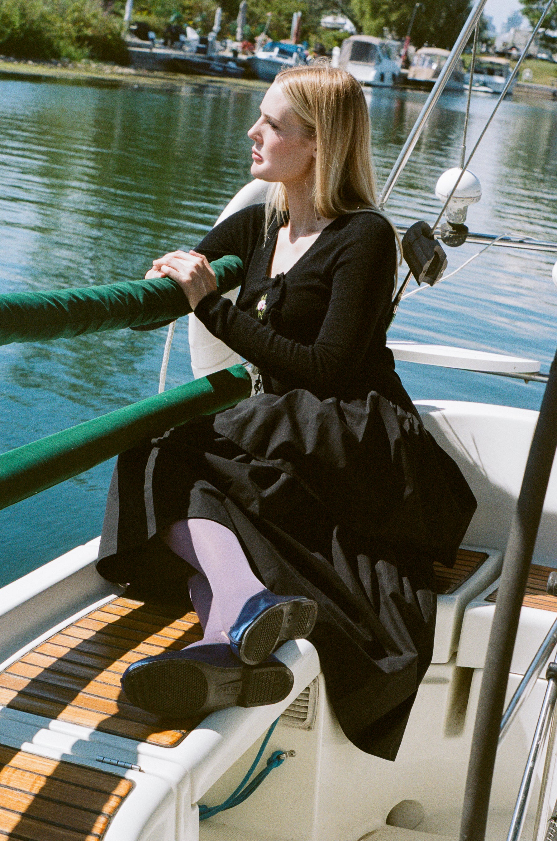 Talvi is 5'10 and a size medium, and wears size UK 10 with the Molly Knitted Top with Rose Embroidery and Satin Theatre Slipper in Navy.